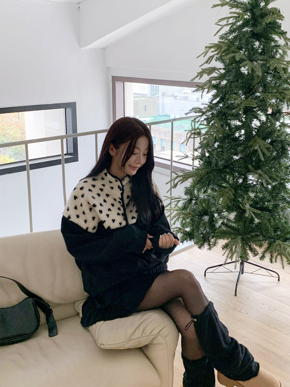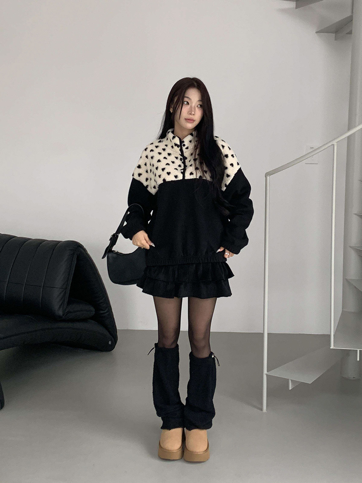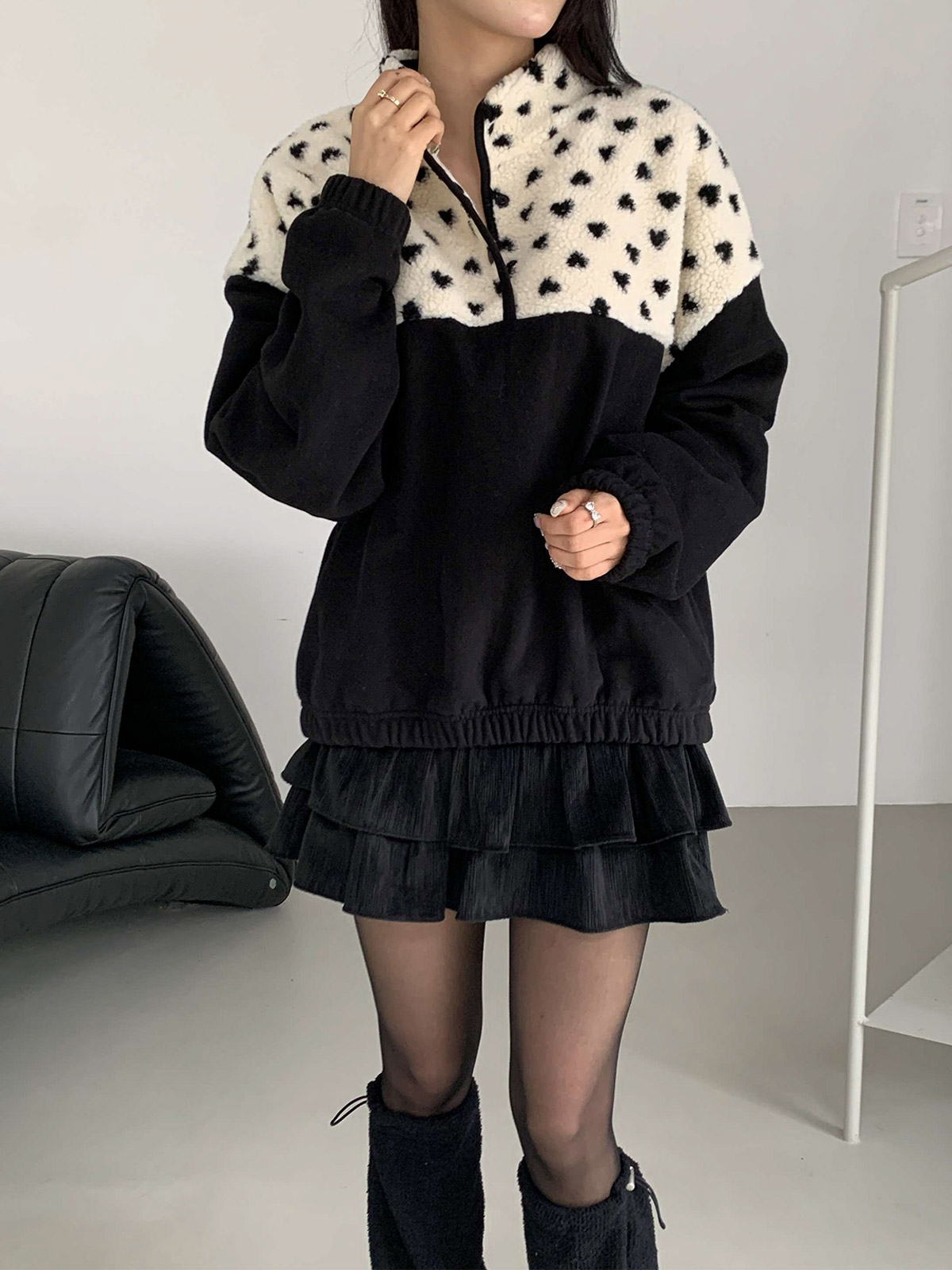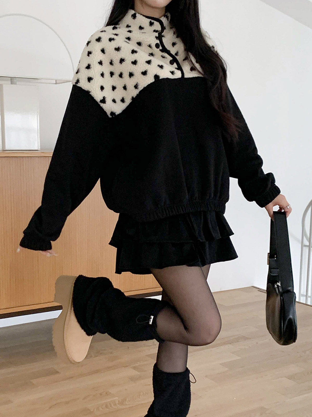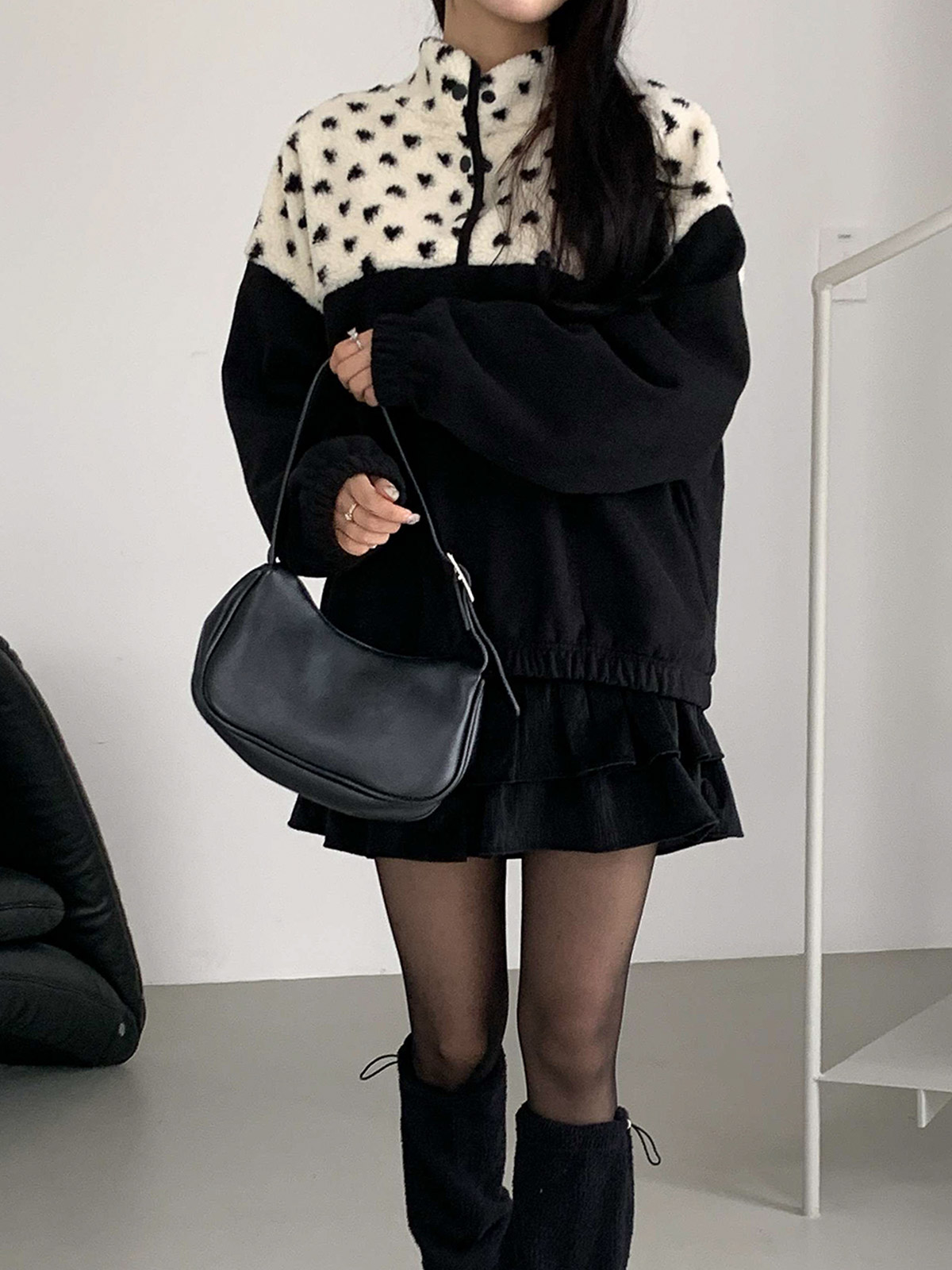 [ T17347K5B-프루니 배색 하트 오버핏 덤블 뽀글이 맨투맨 ]