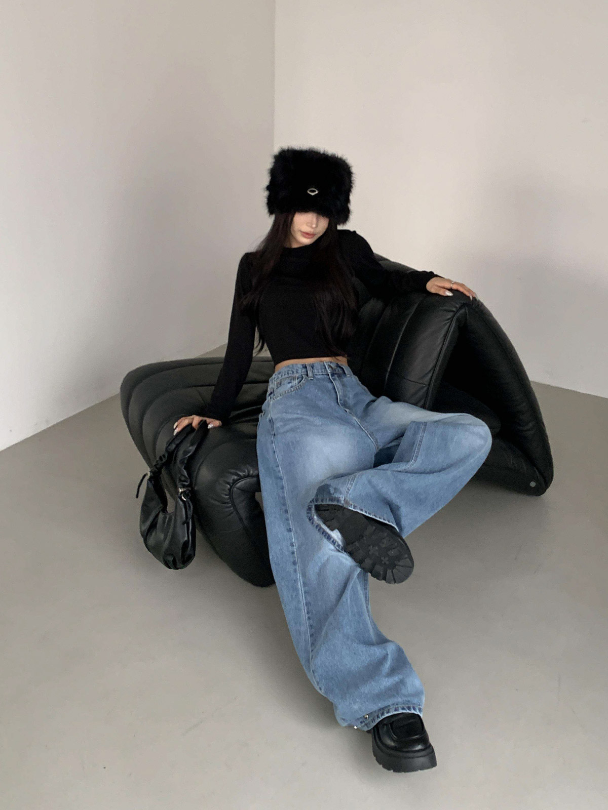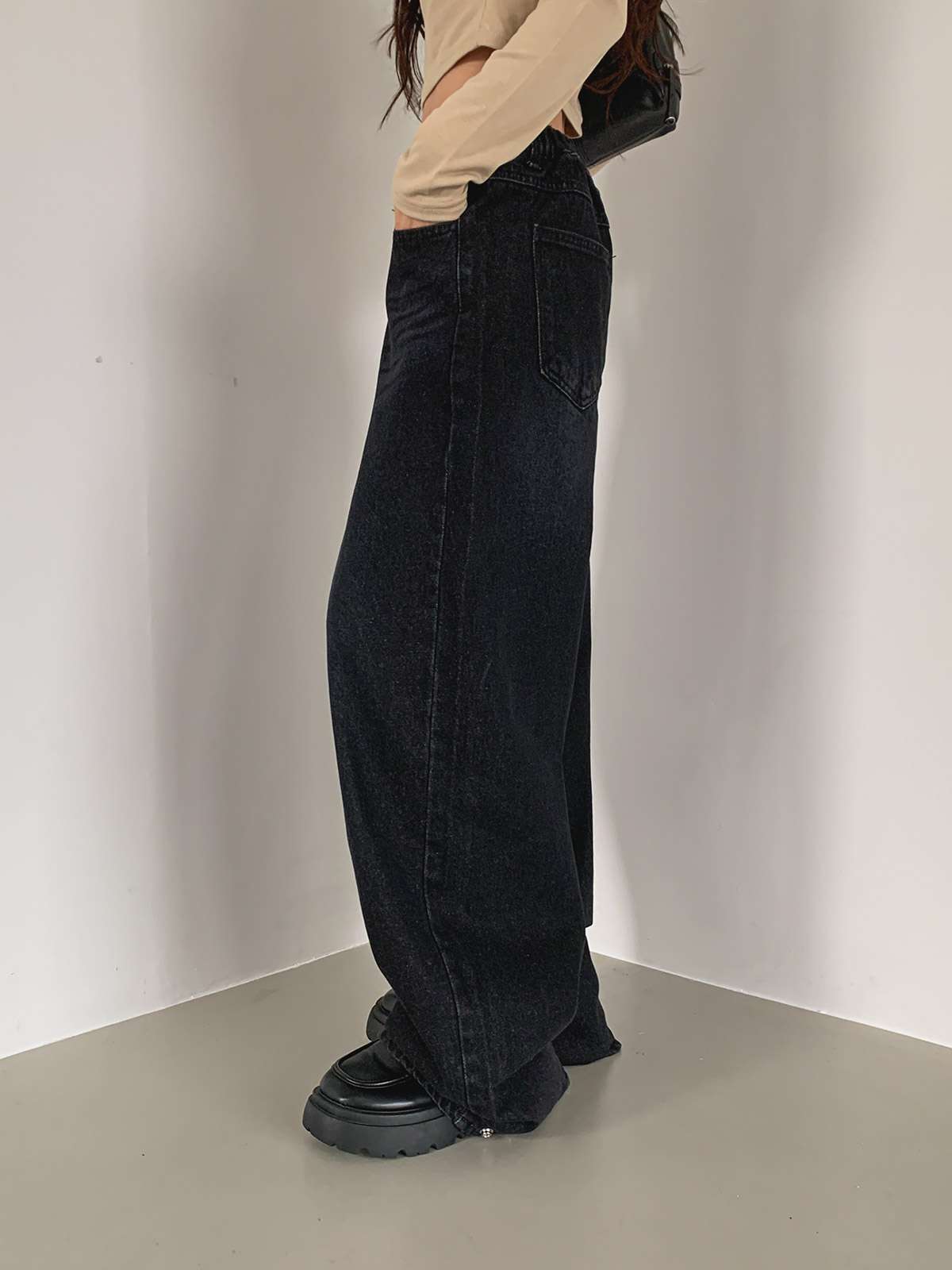 PT15665K5B-표으스 밑단 스냅 벌룬핏 와이드 워싱 데님 팬츠
