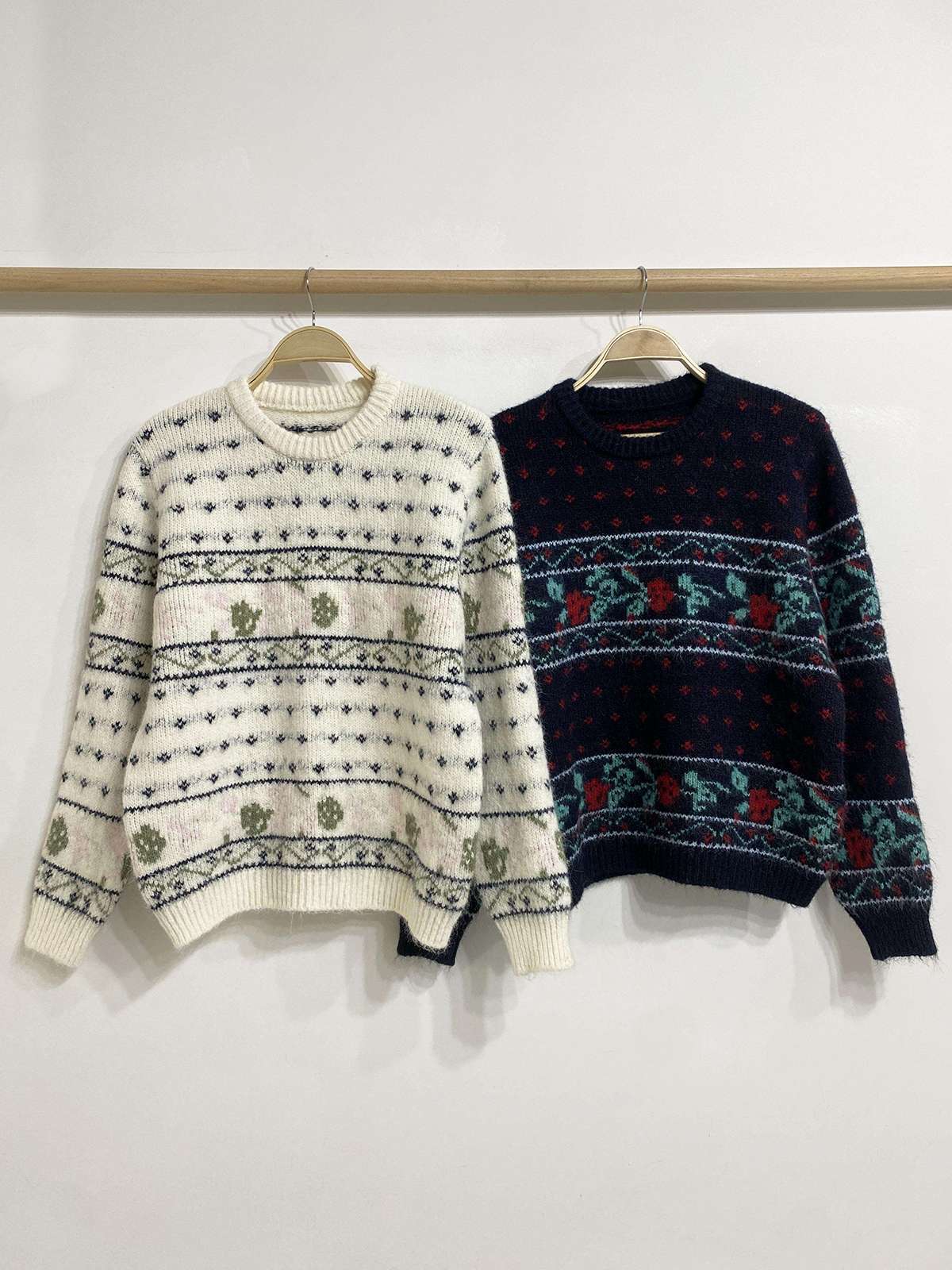 [ NT6104K5B-루벨드 플라워 패턴 라운드 루즈핏 니트 ]