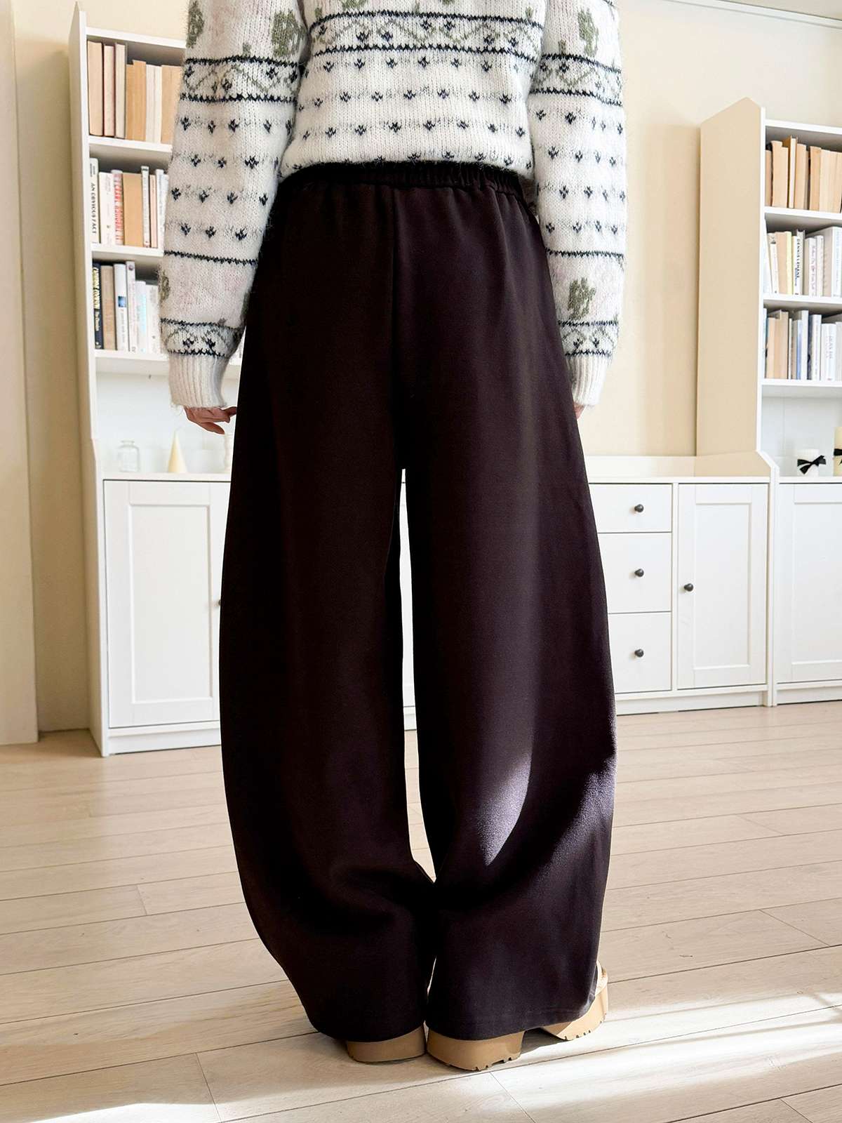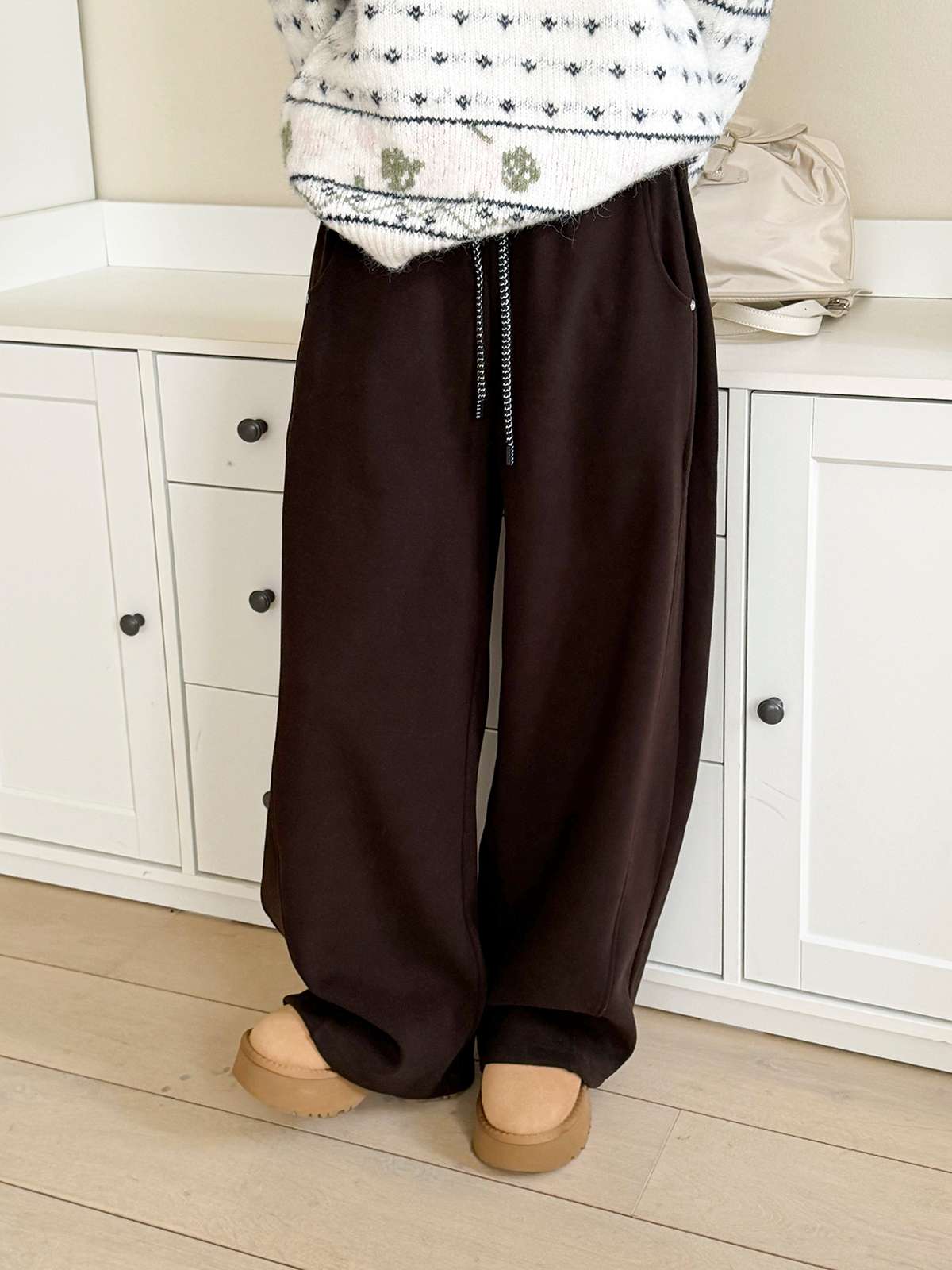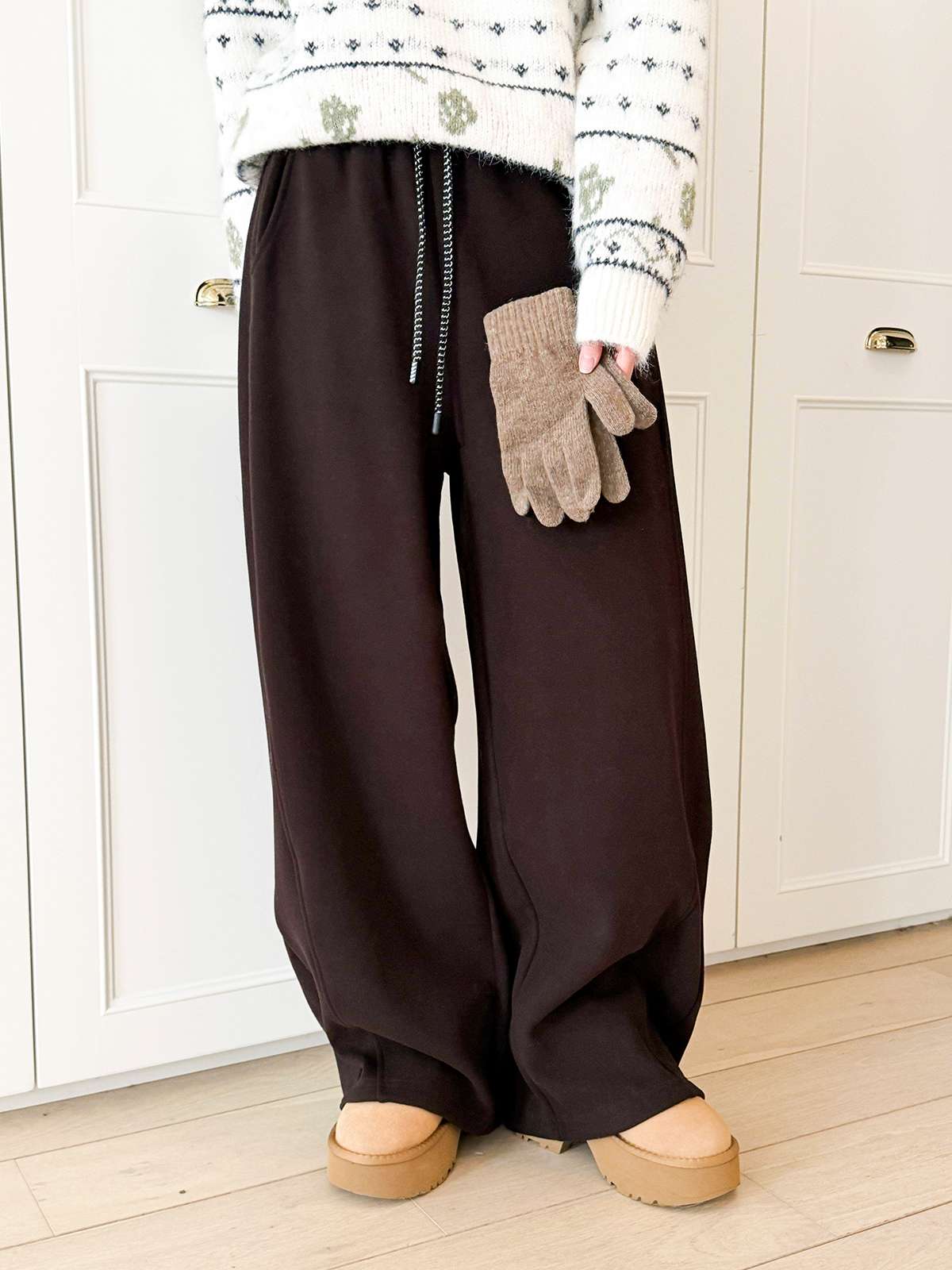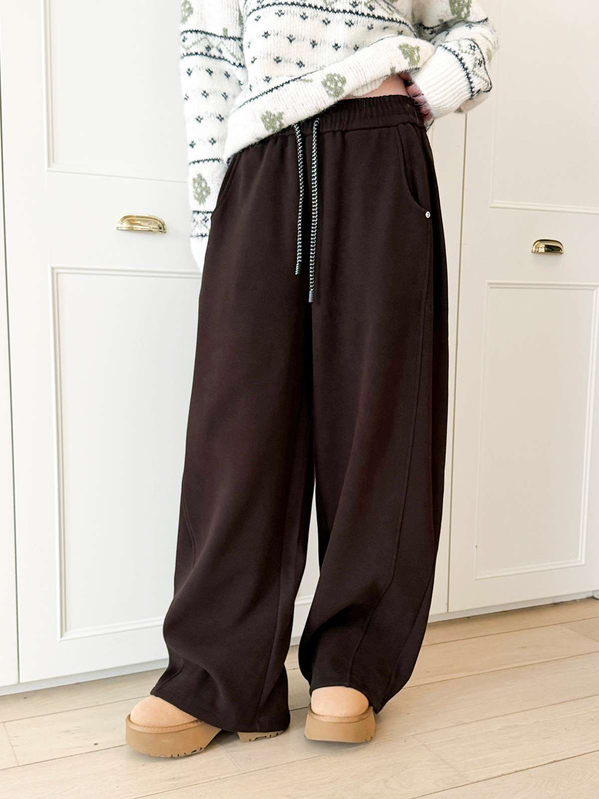 도톰한 기모안감과 와이드 핏의 밴딩 팬츠