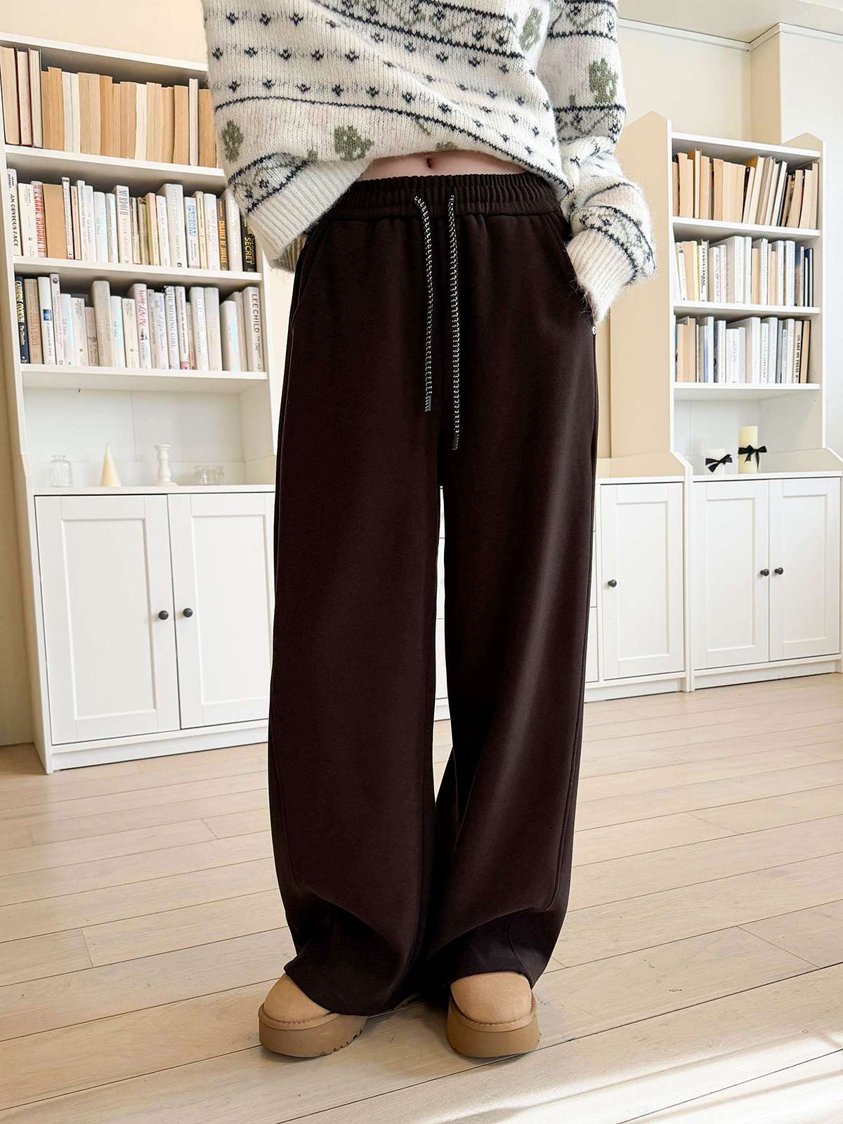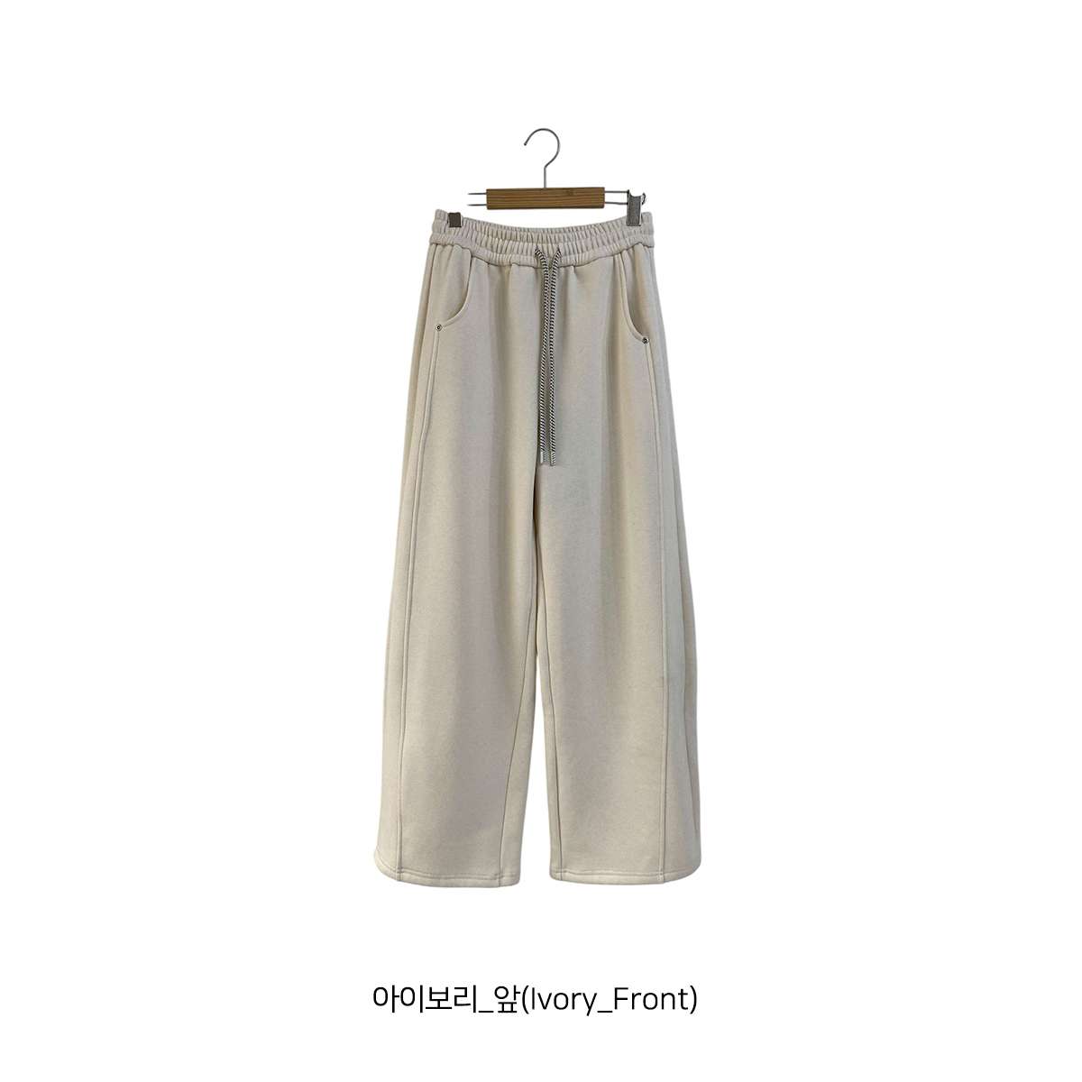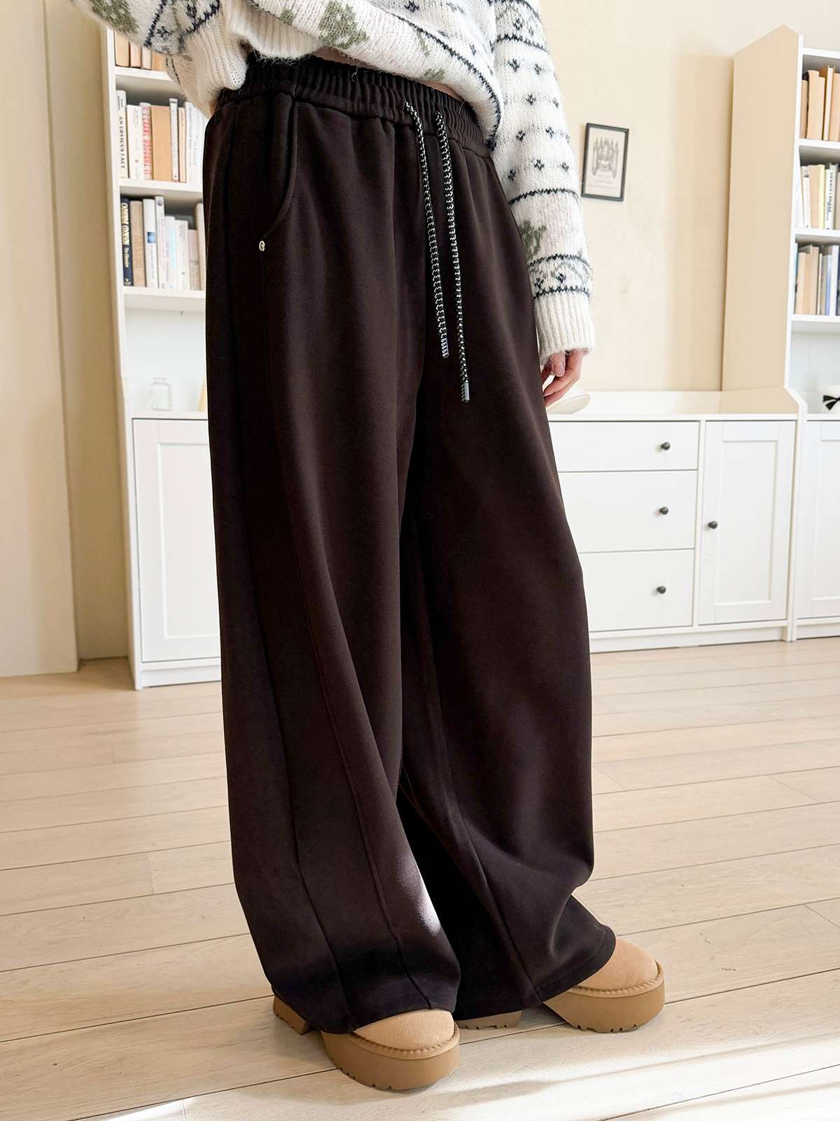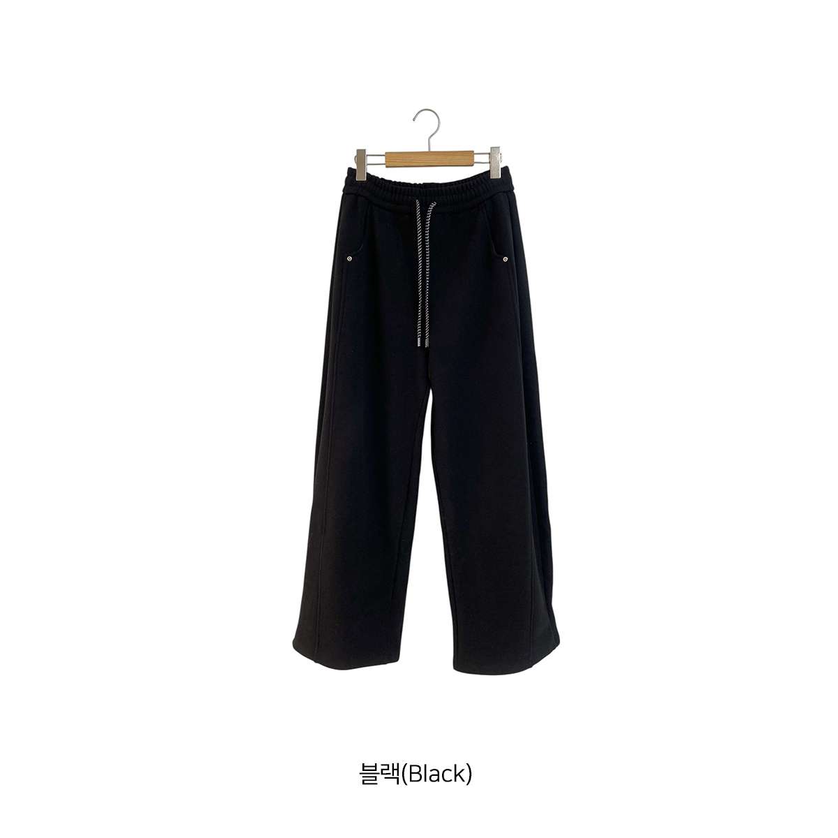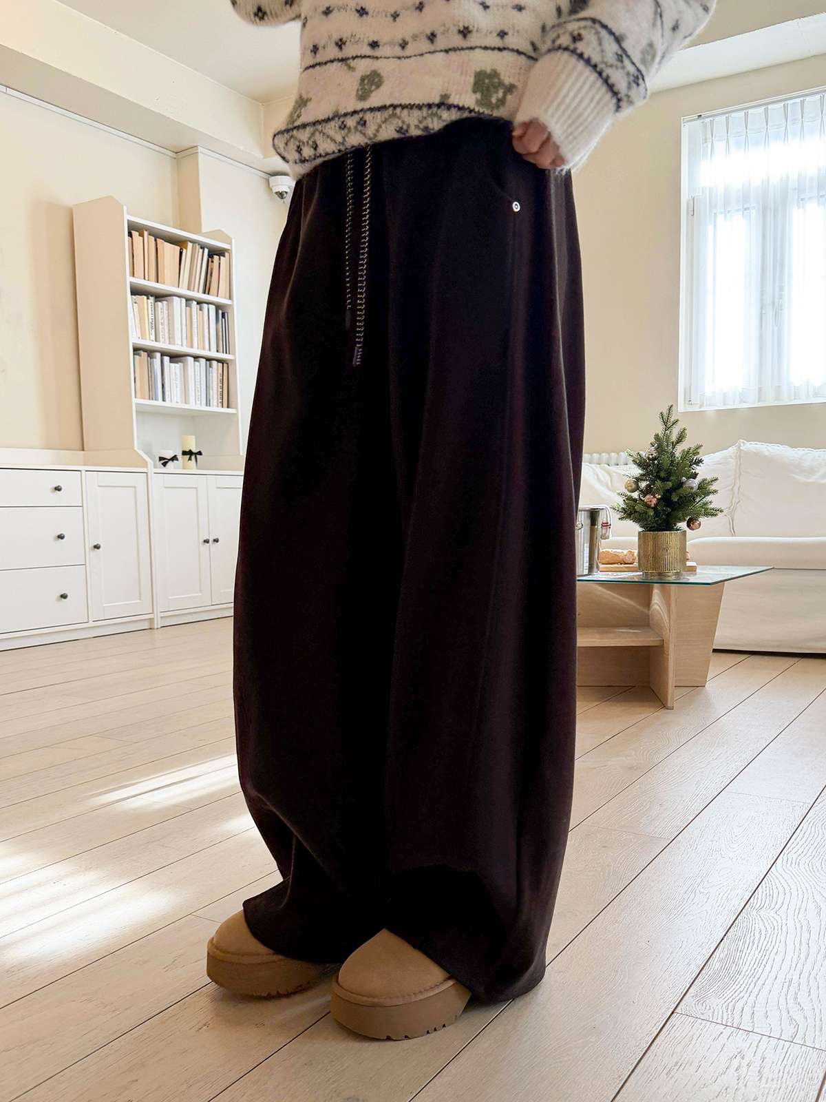 도톰한 기모안감과 와이드 핏의 밴딩 팬츠