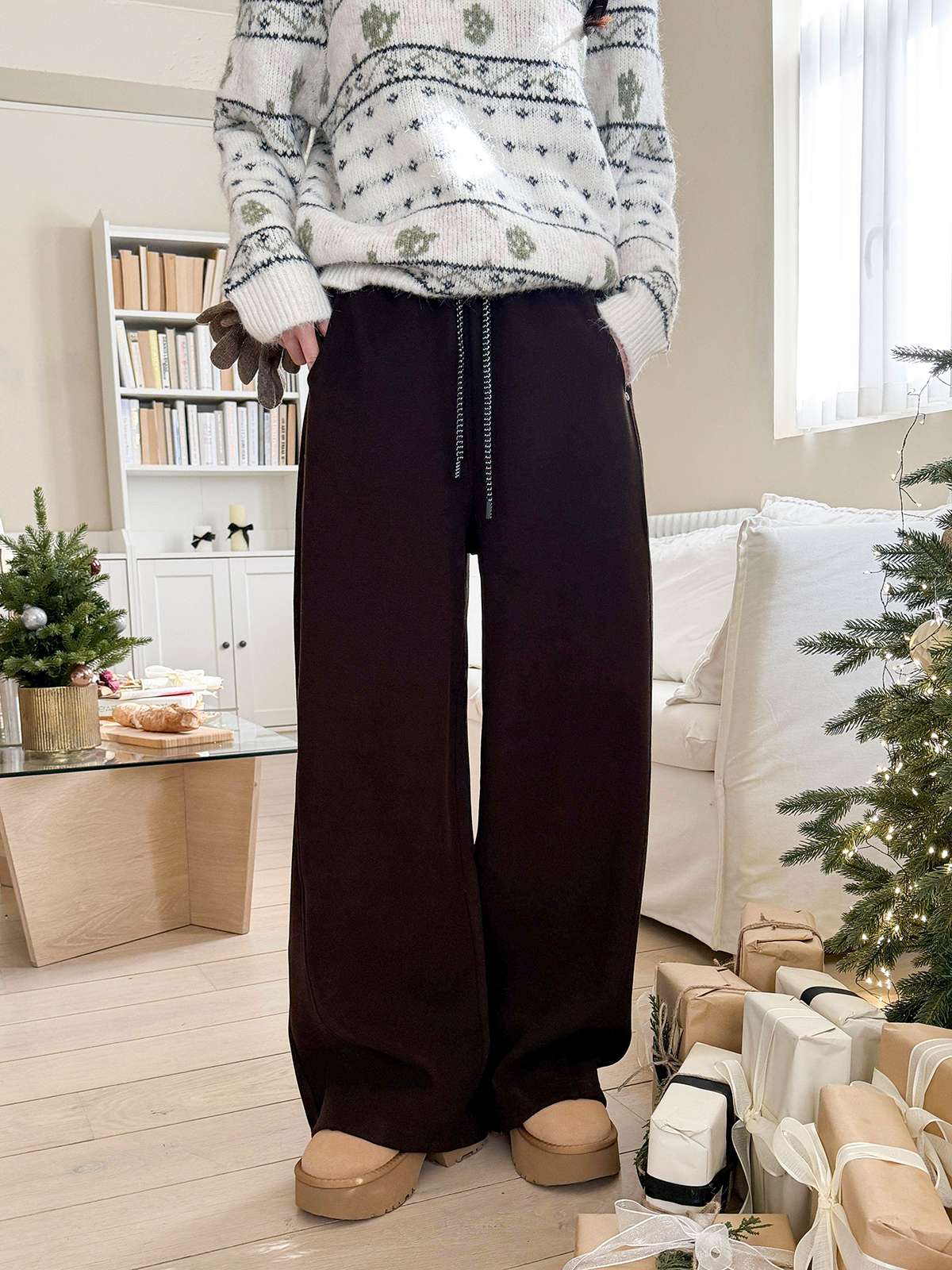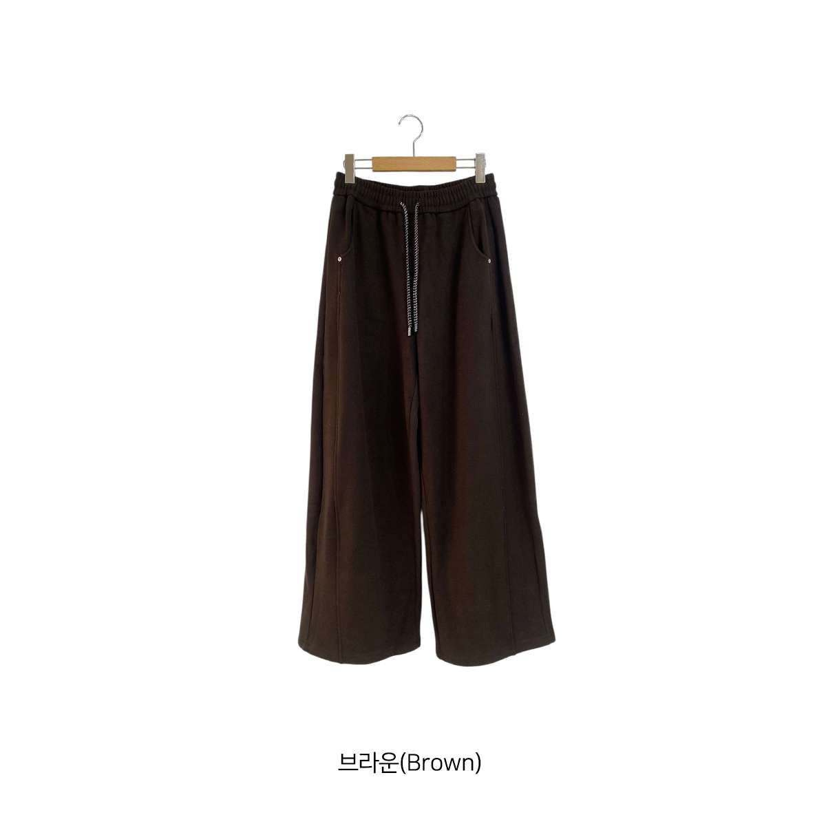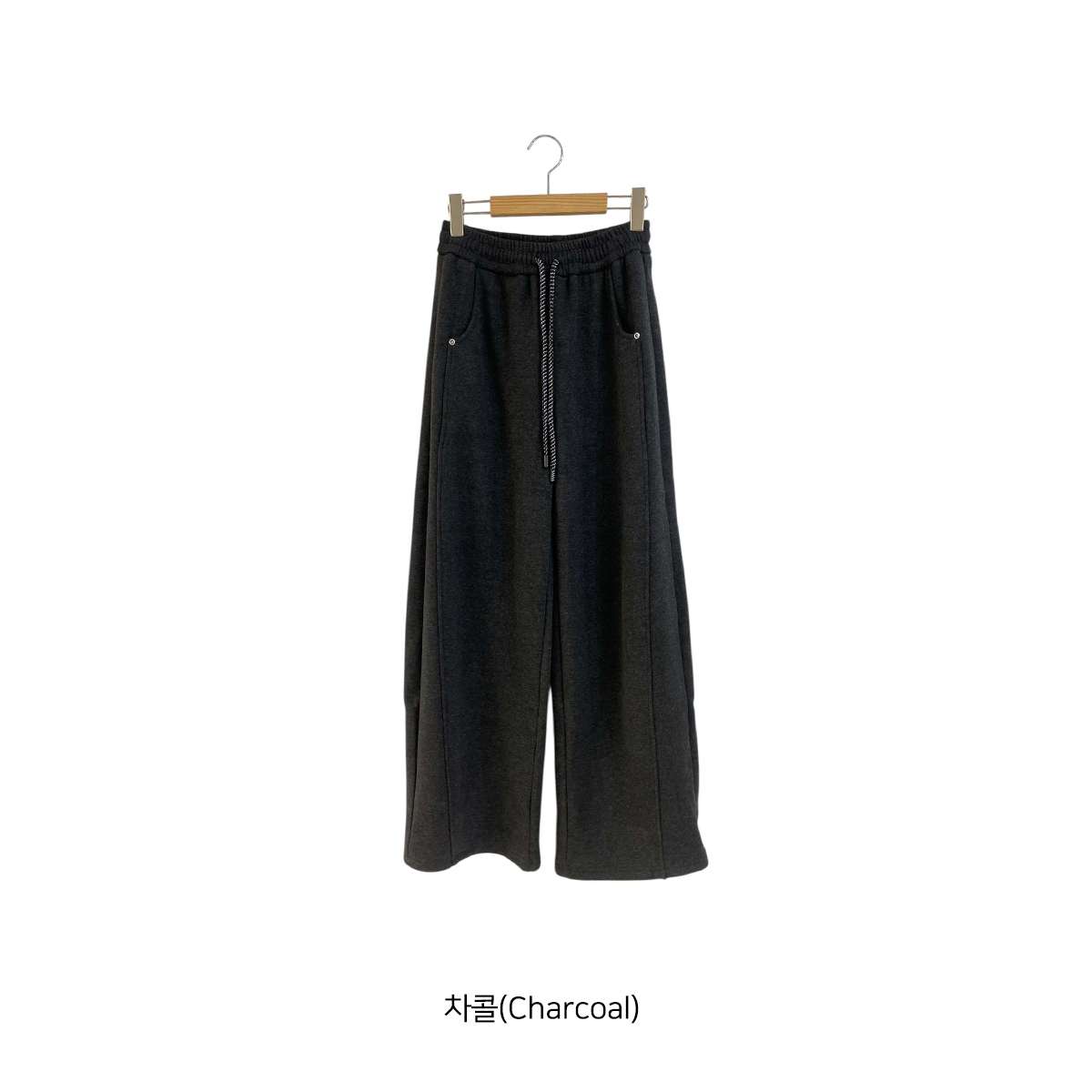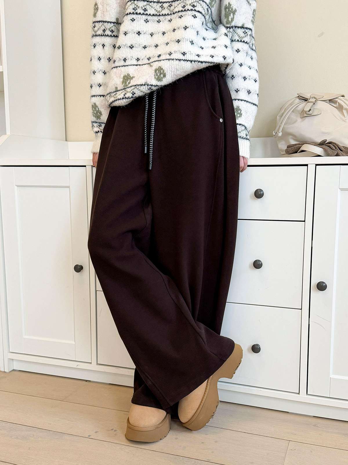 도톰한 기모안감과 와이드 핏의 밴딩 팬츠