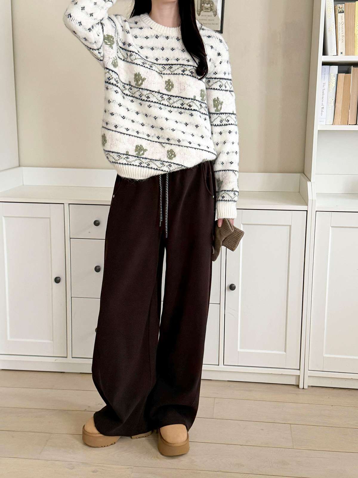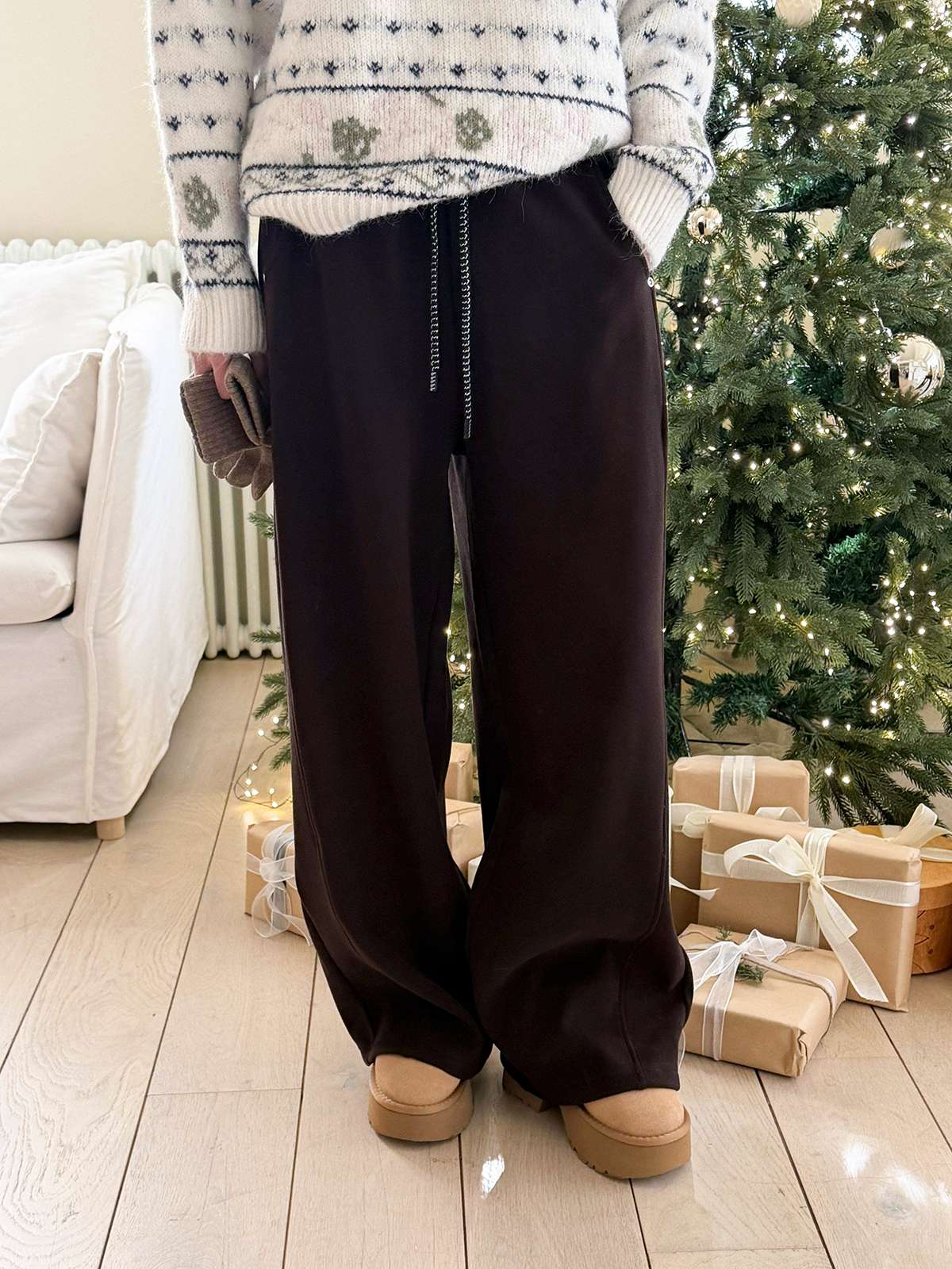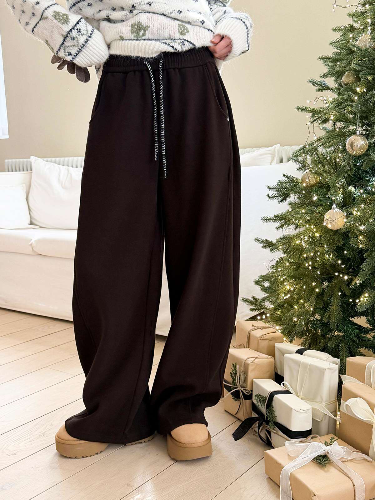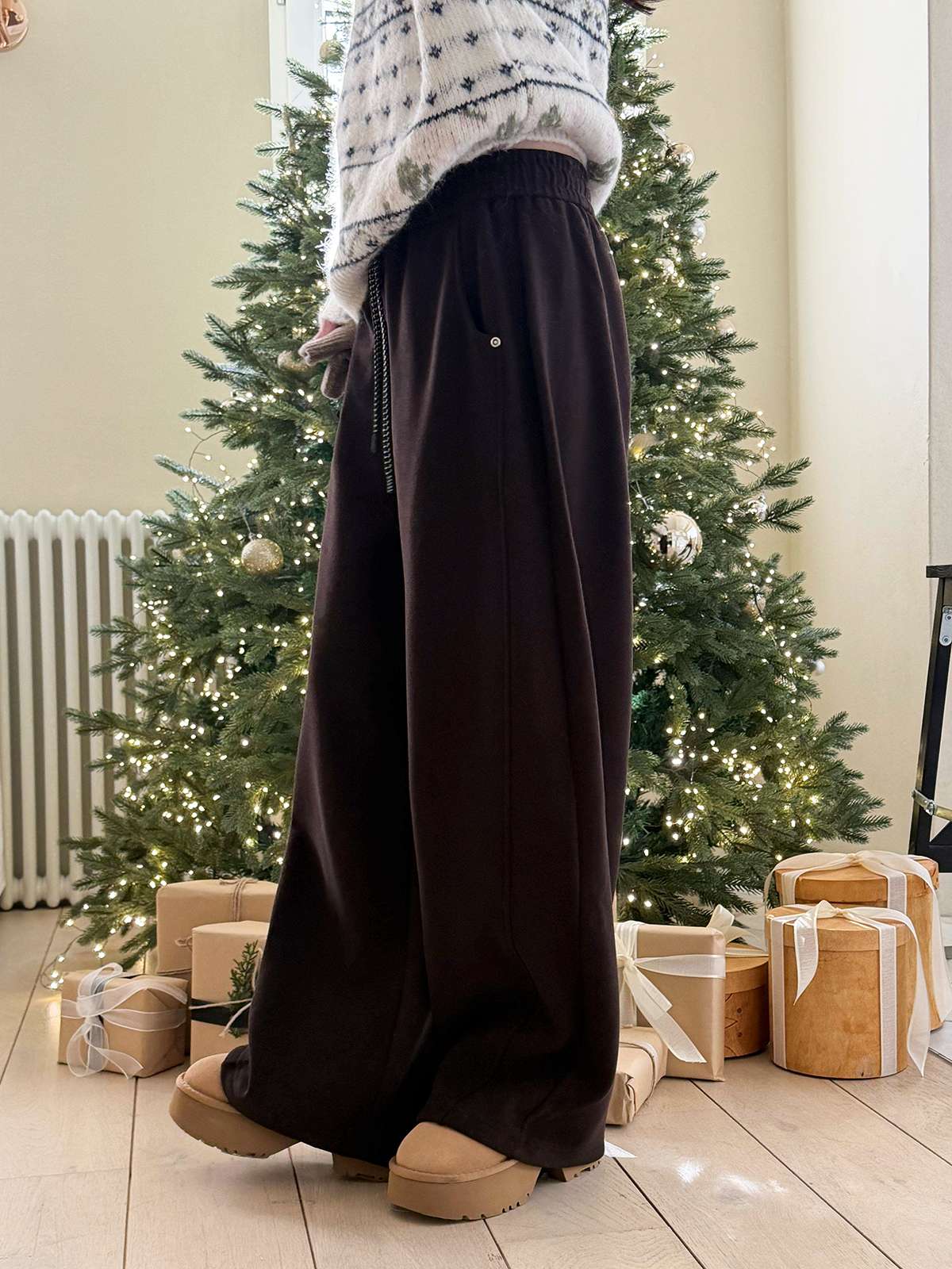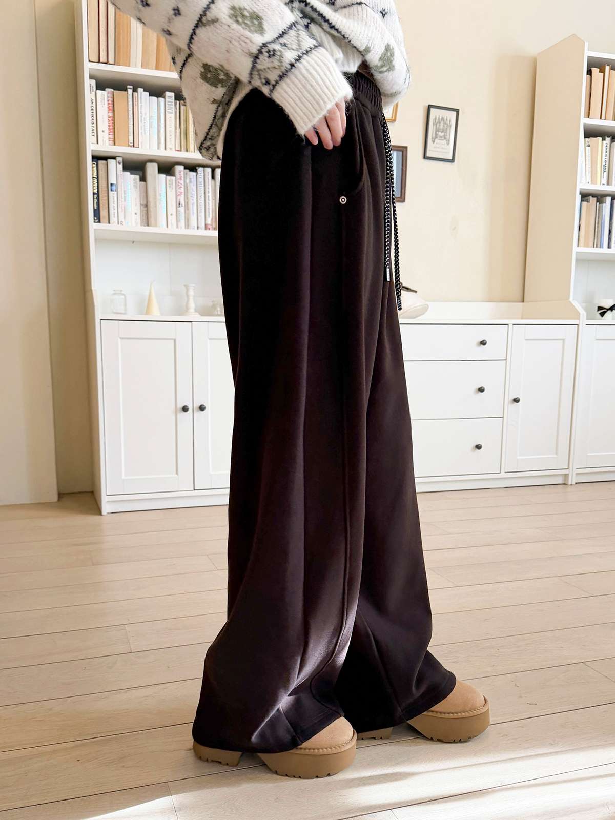 도톰한 기모안감과 와이드 핏의 밴딩 팬츠