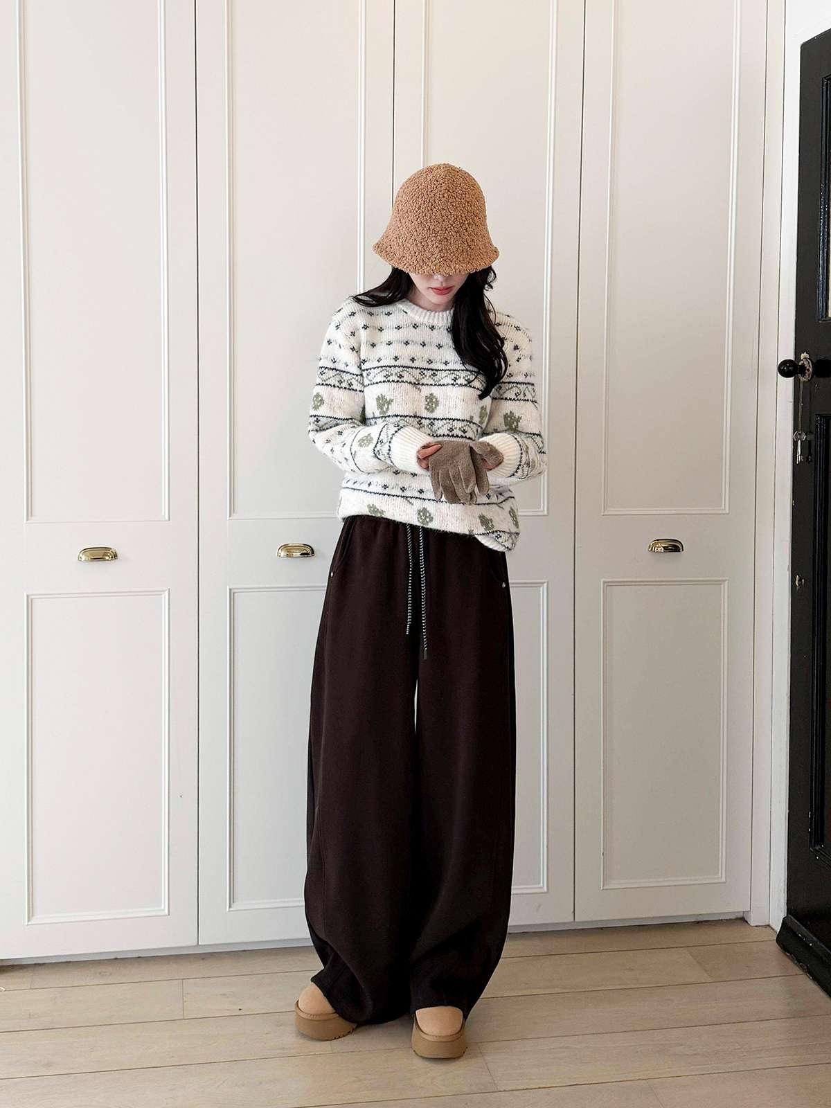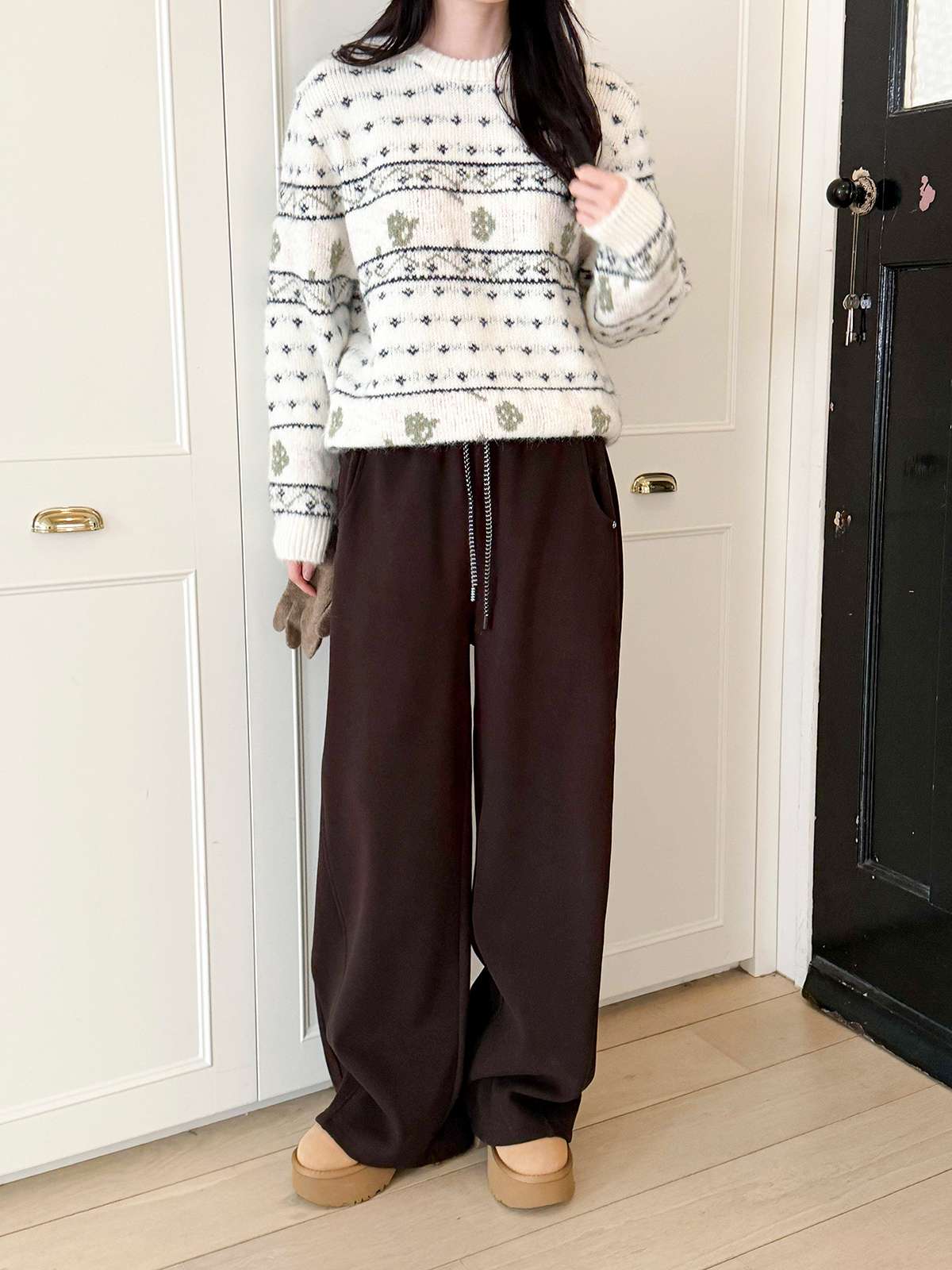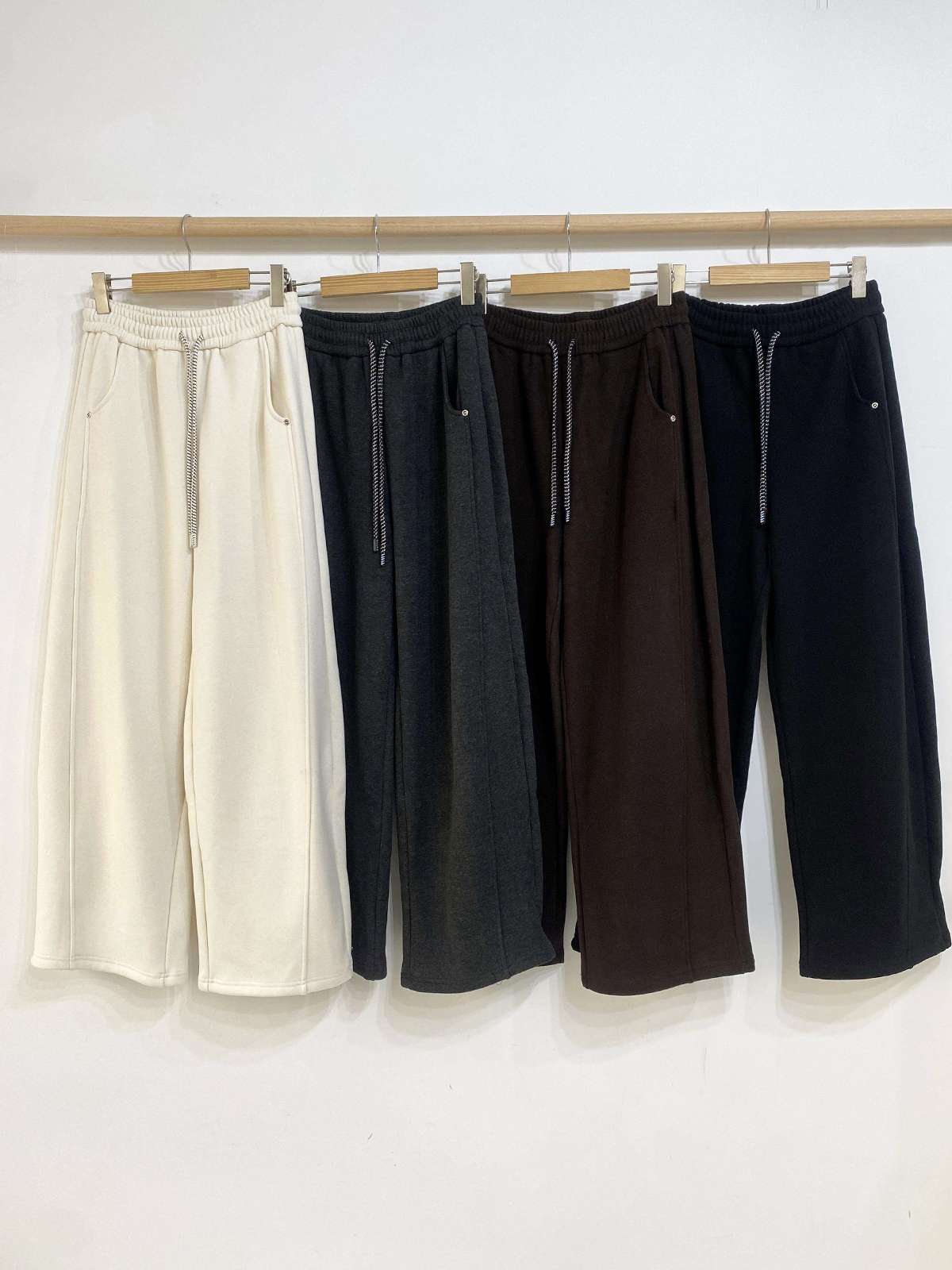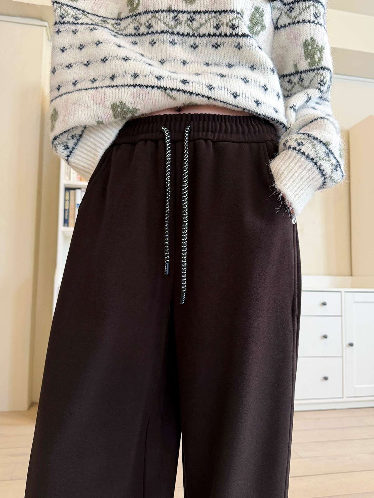 도톰한 기모안감과 와이드 핏의 밴딩 팬츠