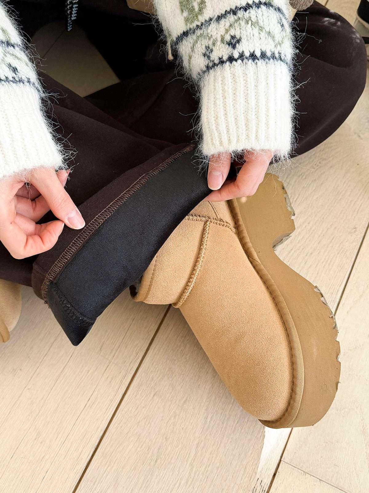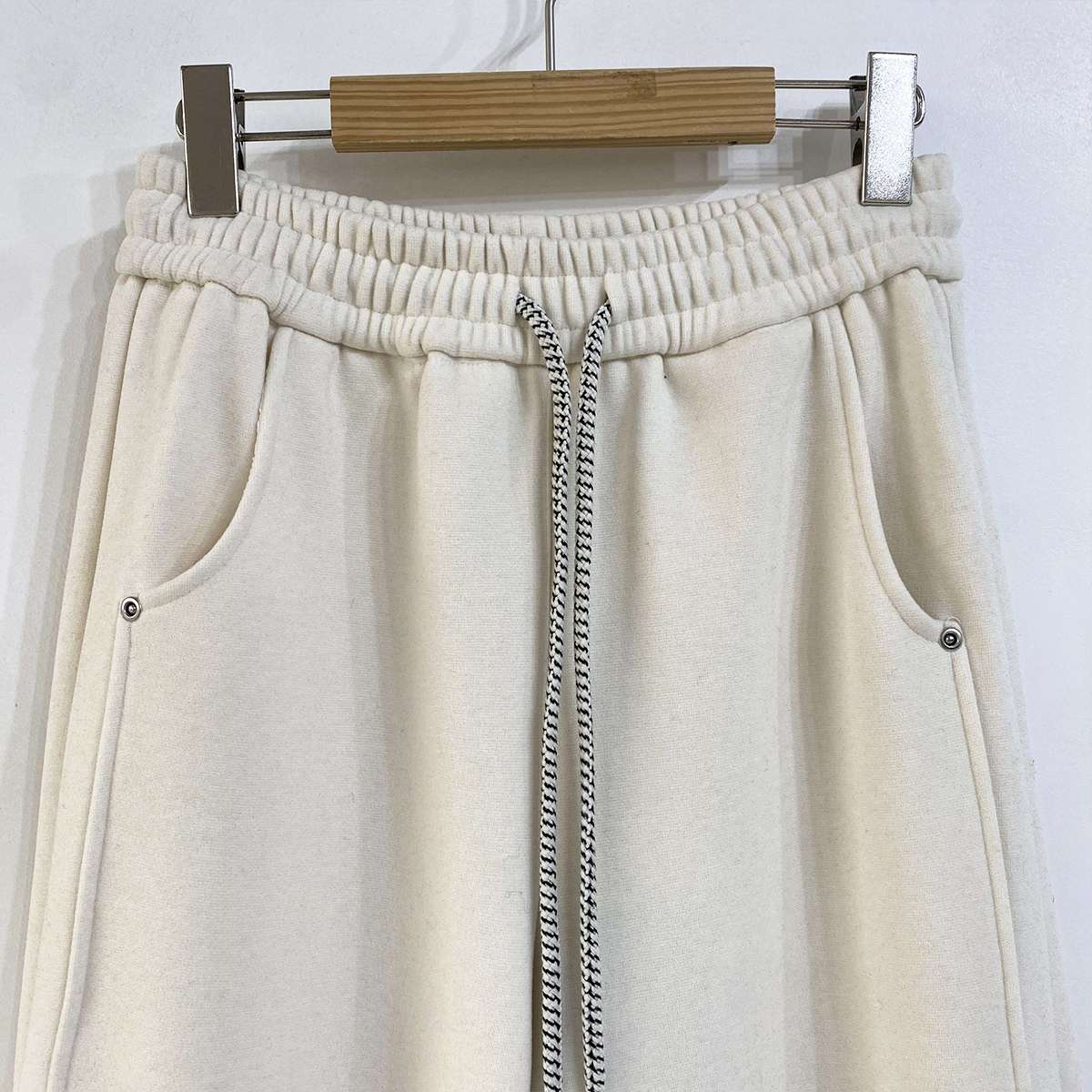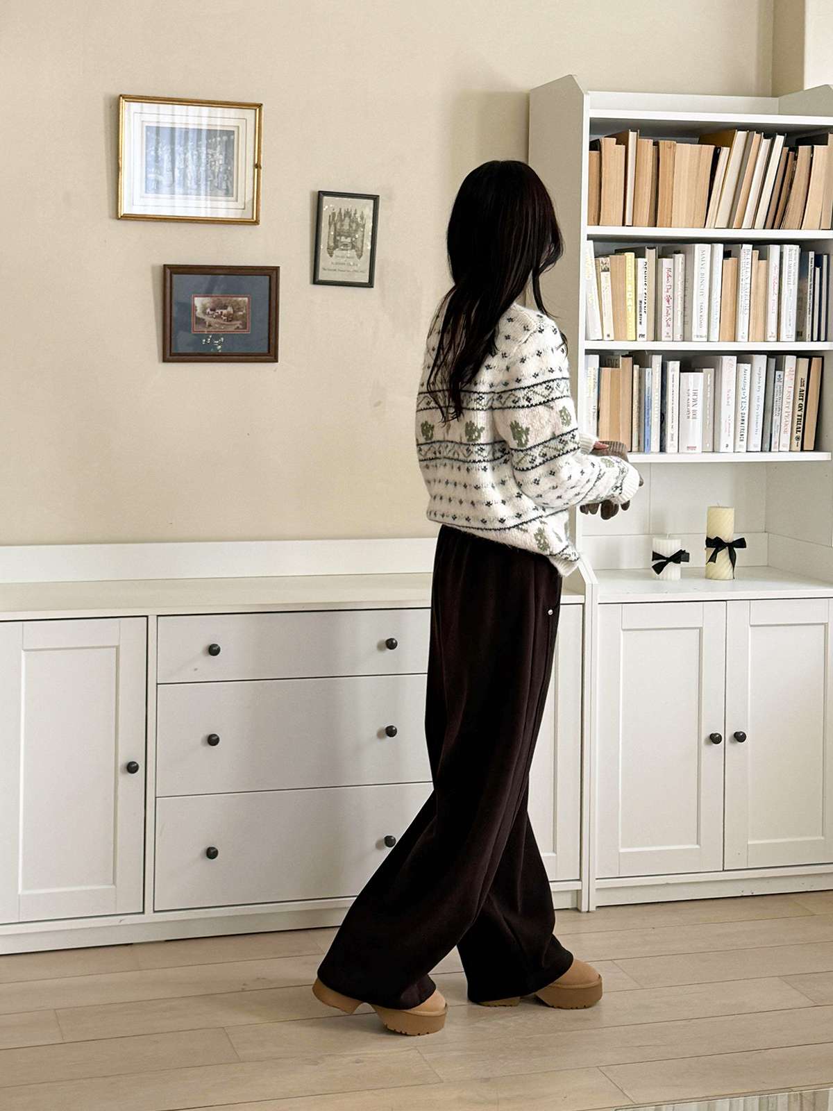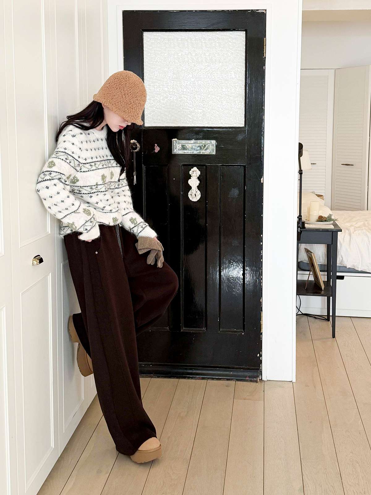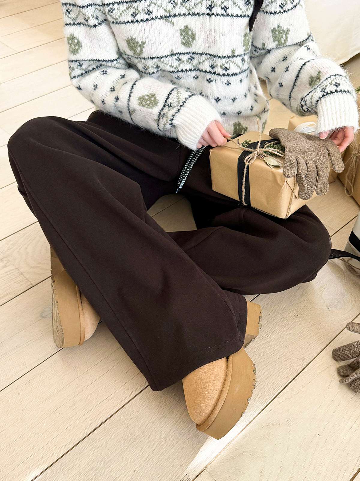 도톰한 기모안감과 와이드 핏의 밴딩 팬츠