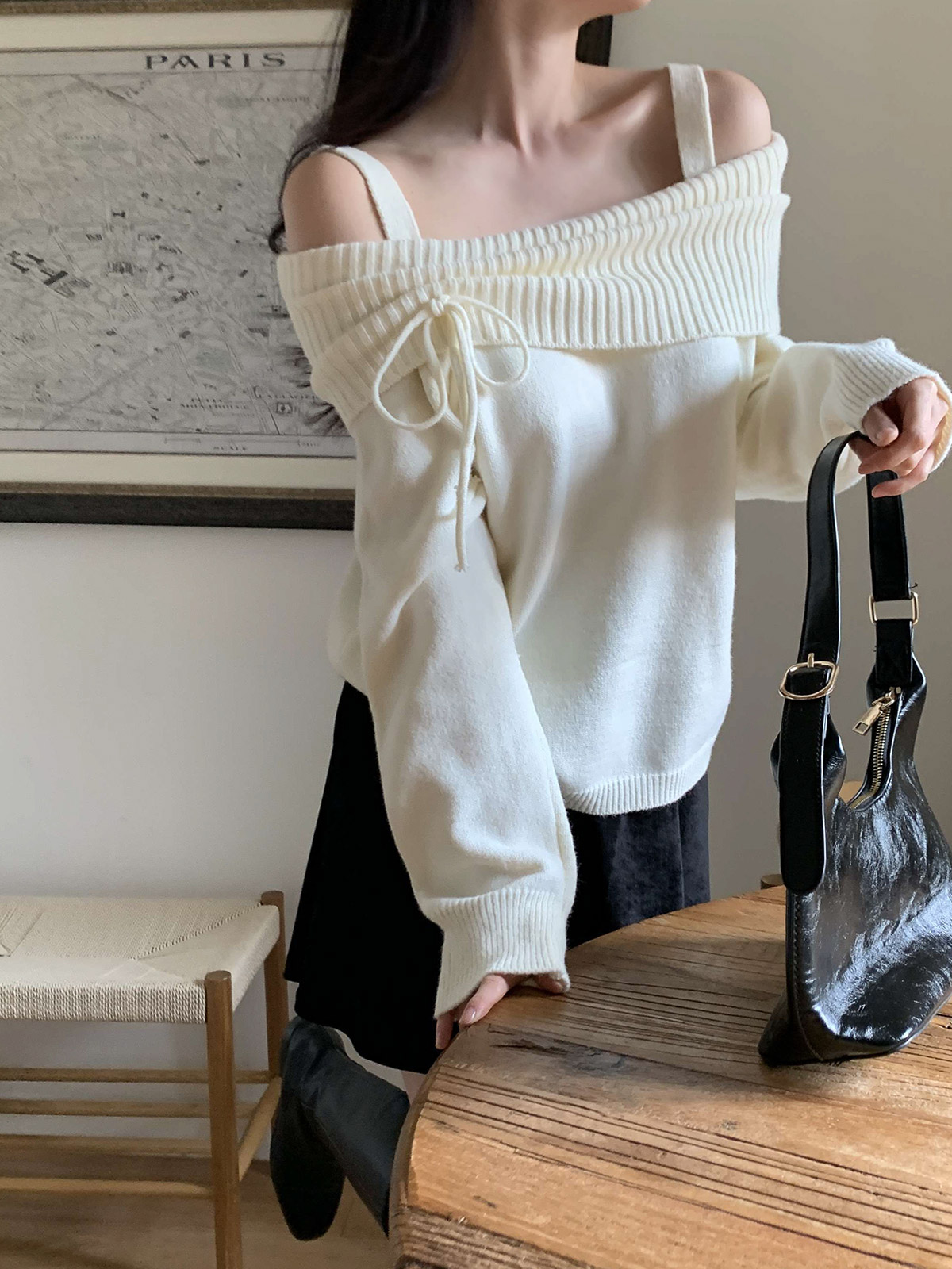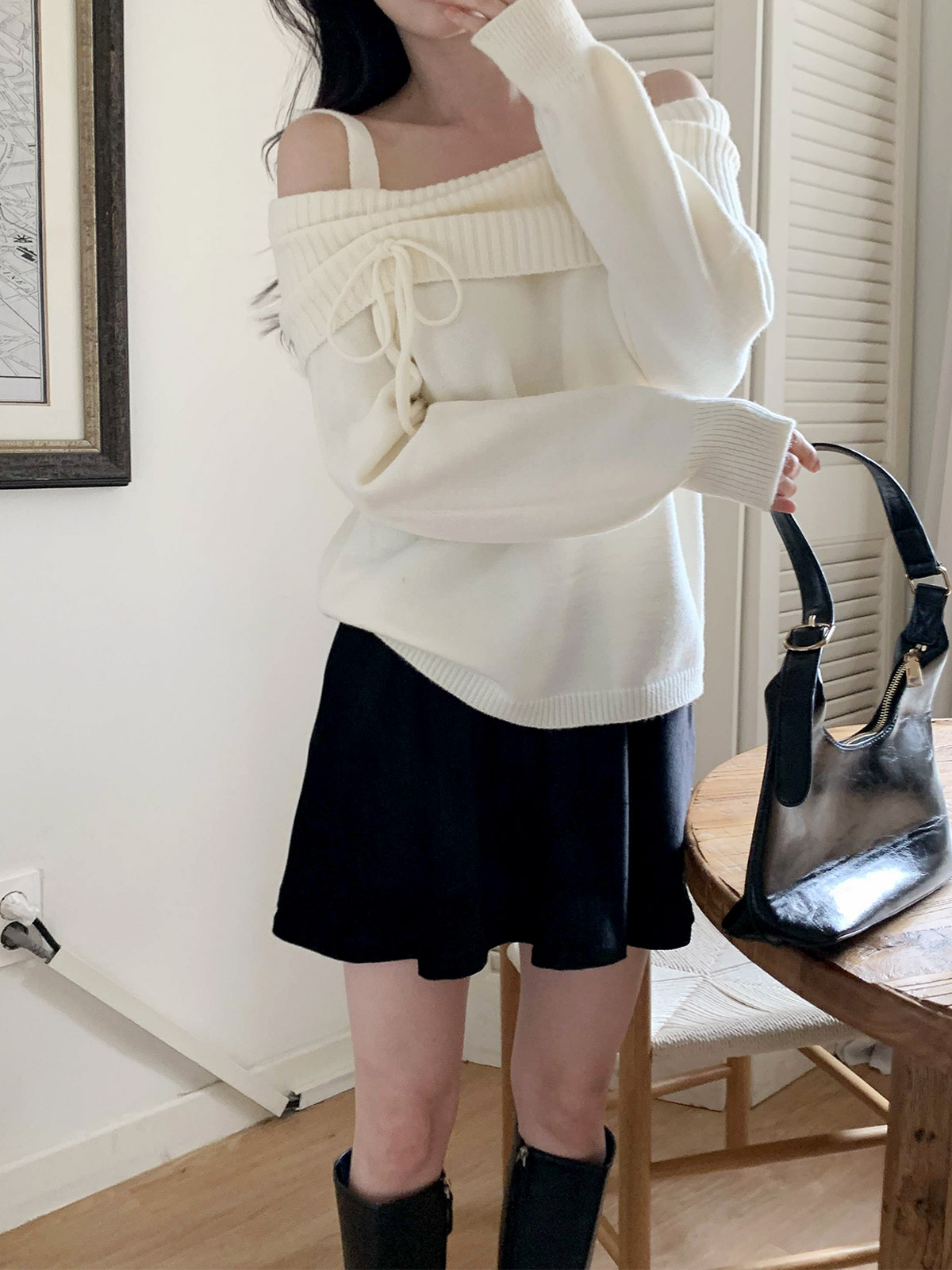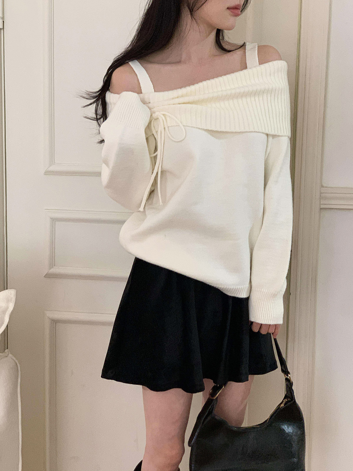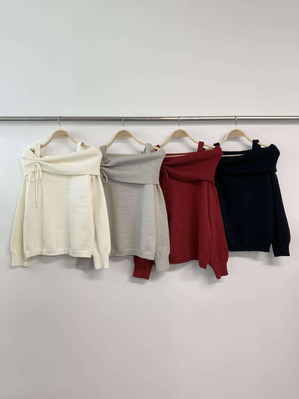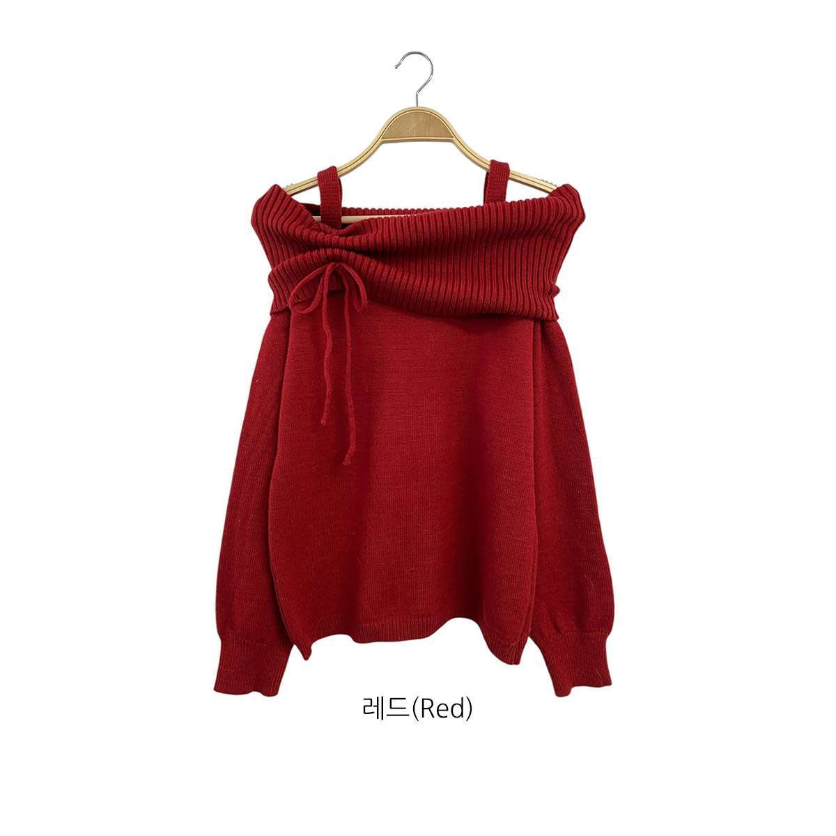 [ NT6109K5C-루비안 리본 셔링 오프숄더 루즈핏 니트 ]