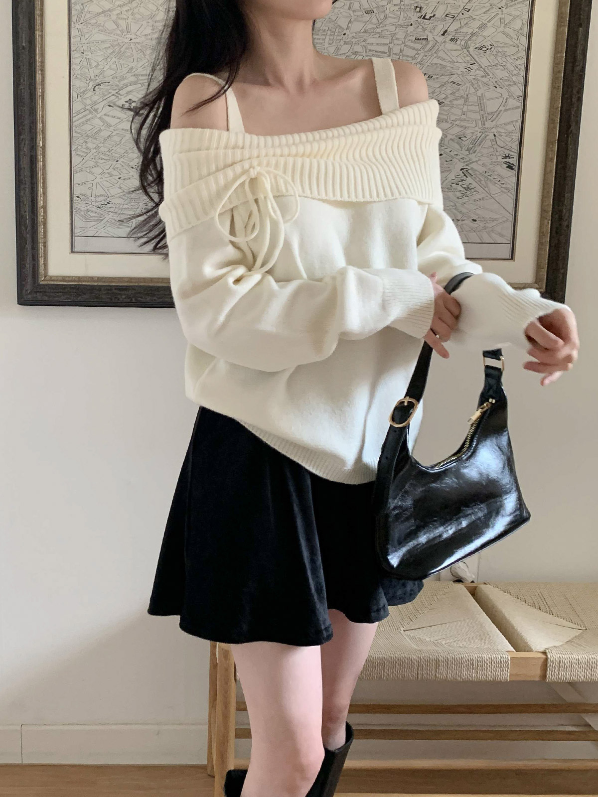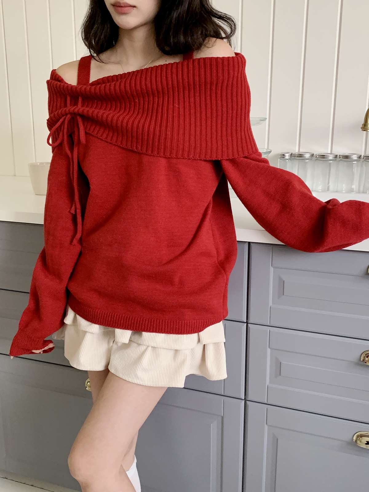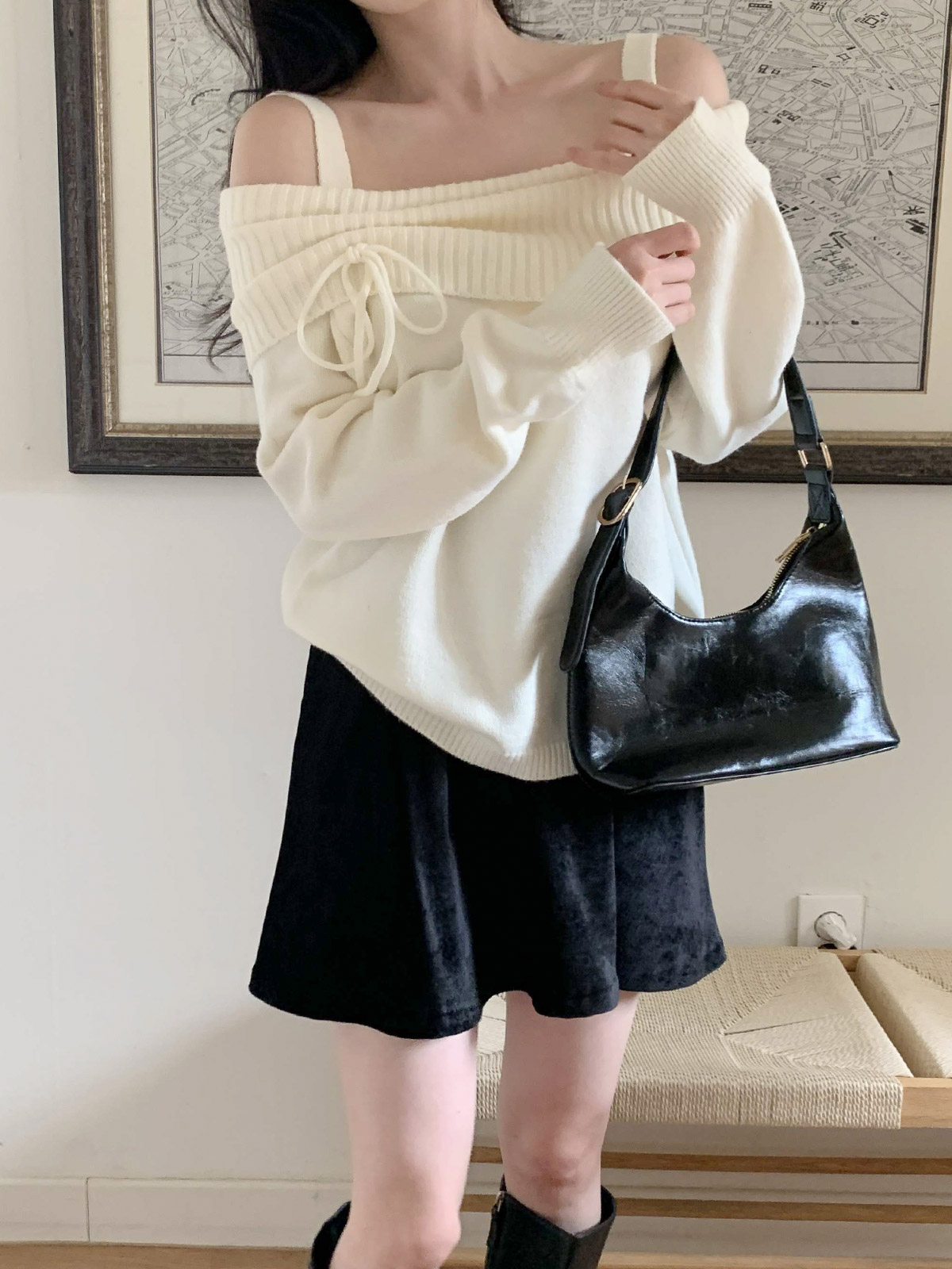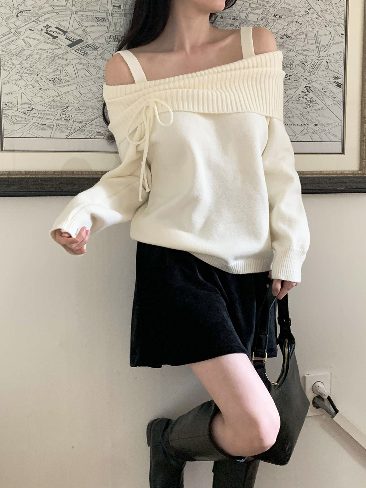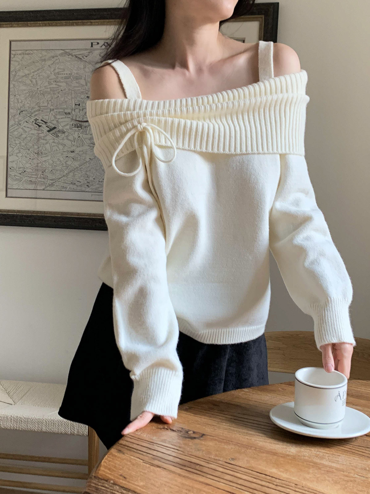 [ NT6109K5C-루비안 리본 셔링 오프숄더 루즈핏 니트 ]