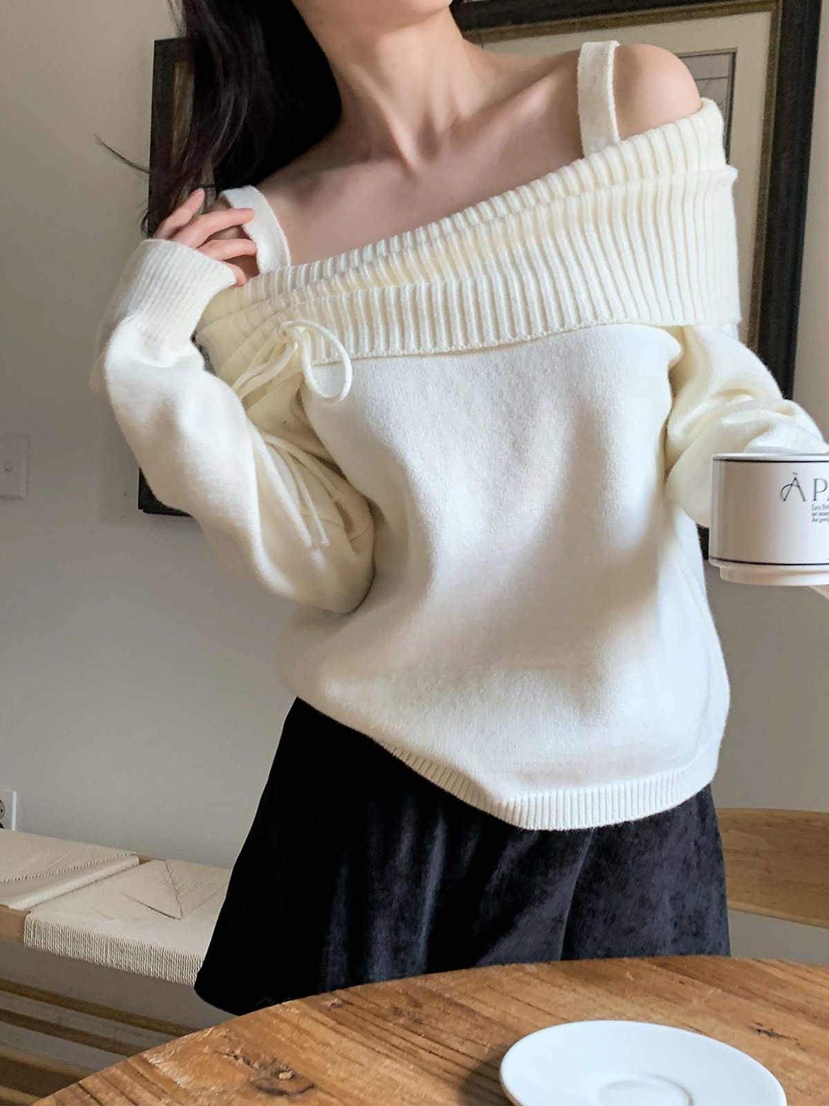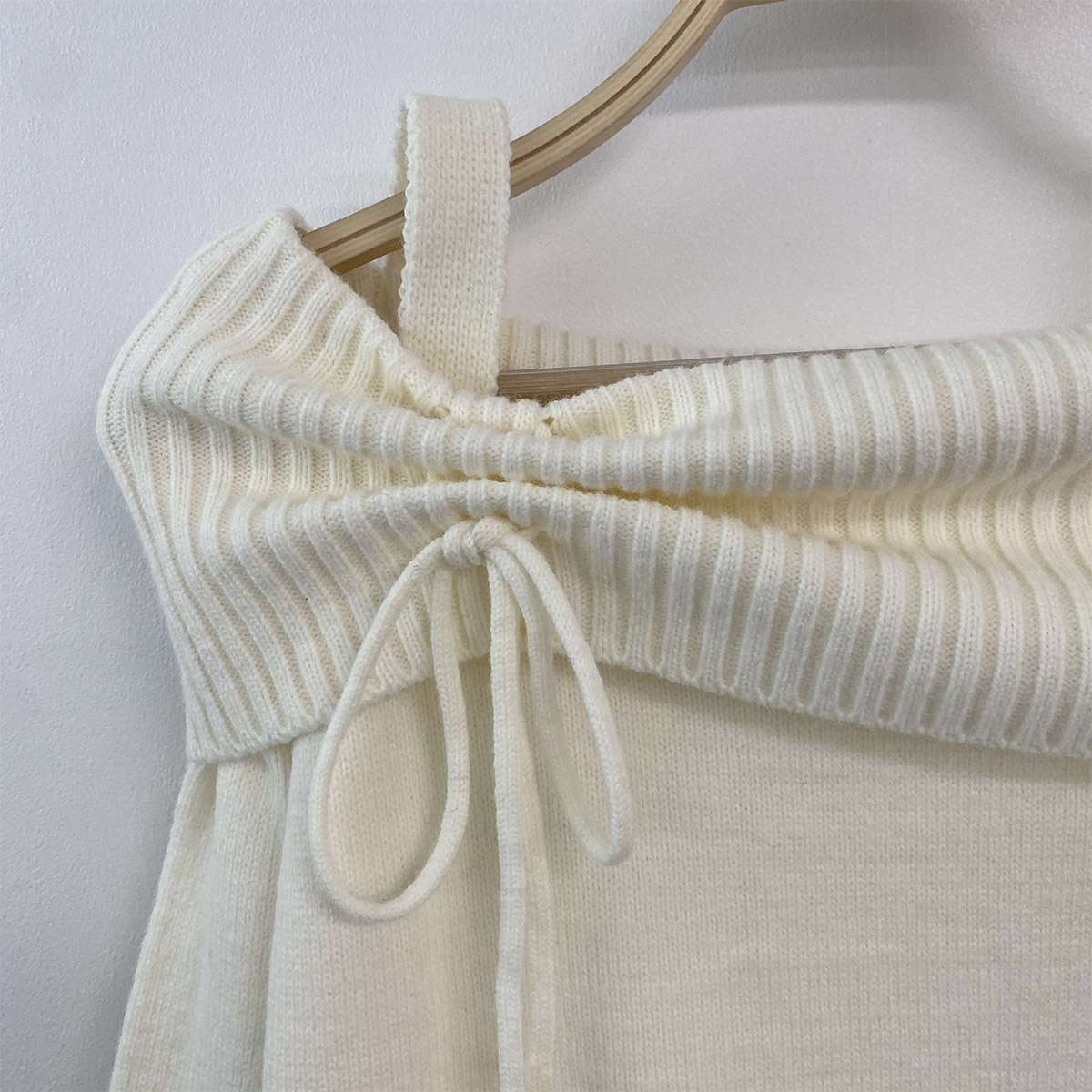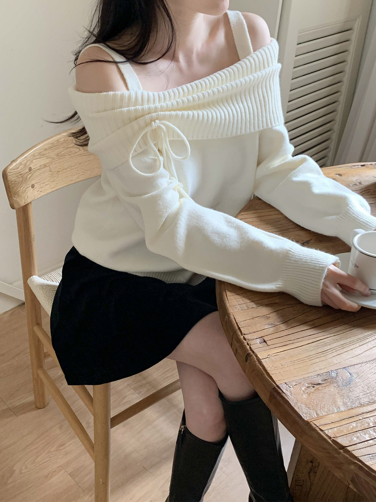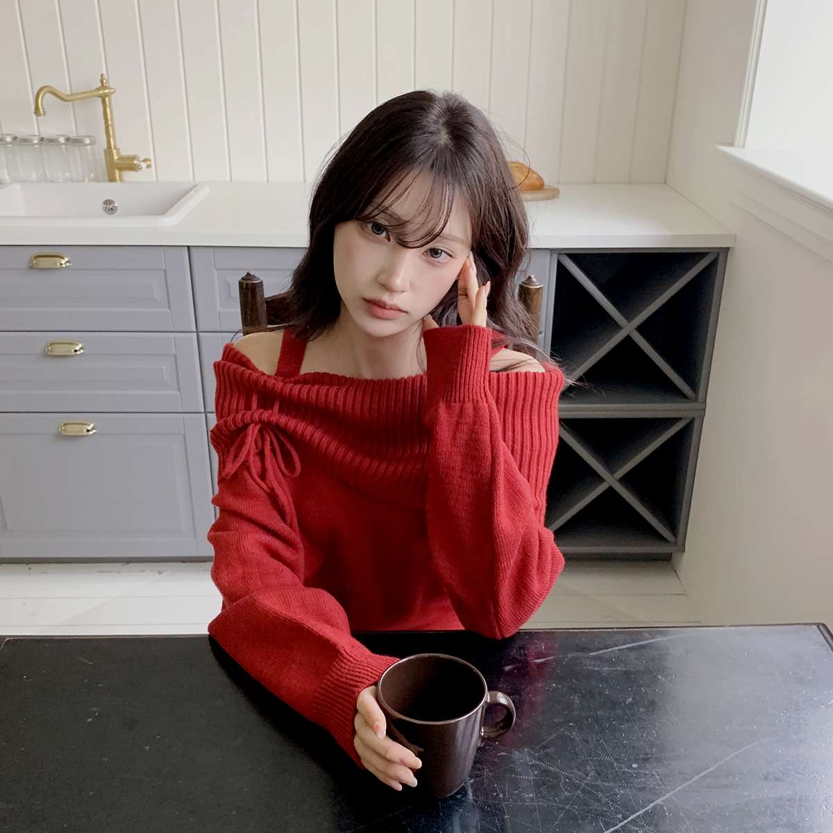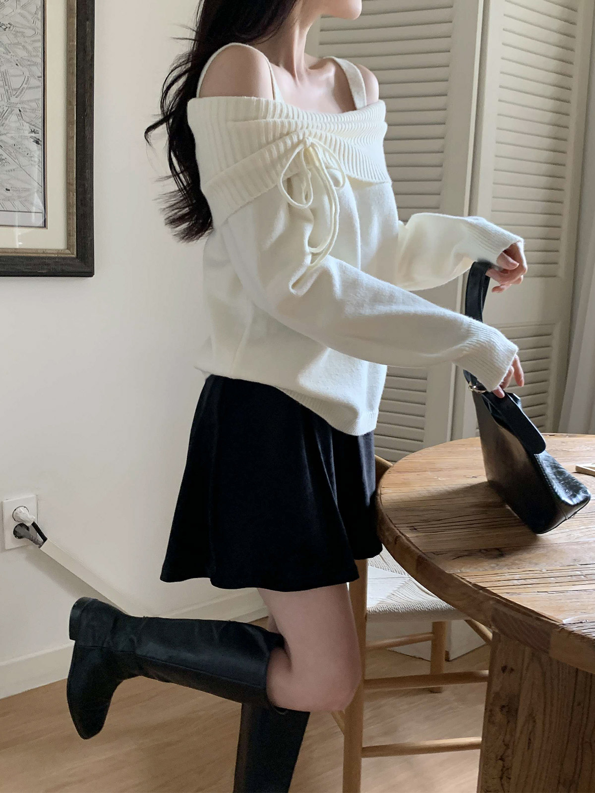 [ NT6109K5C-루비안 리본 셔링 오프숄더 루즈핏 니트 ]