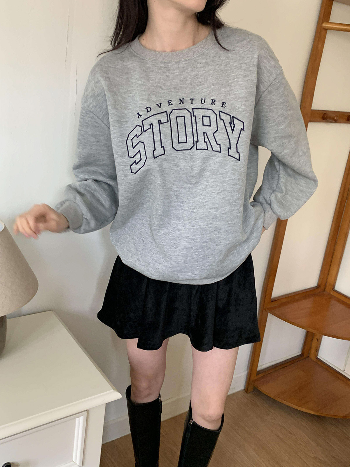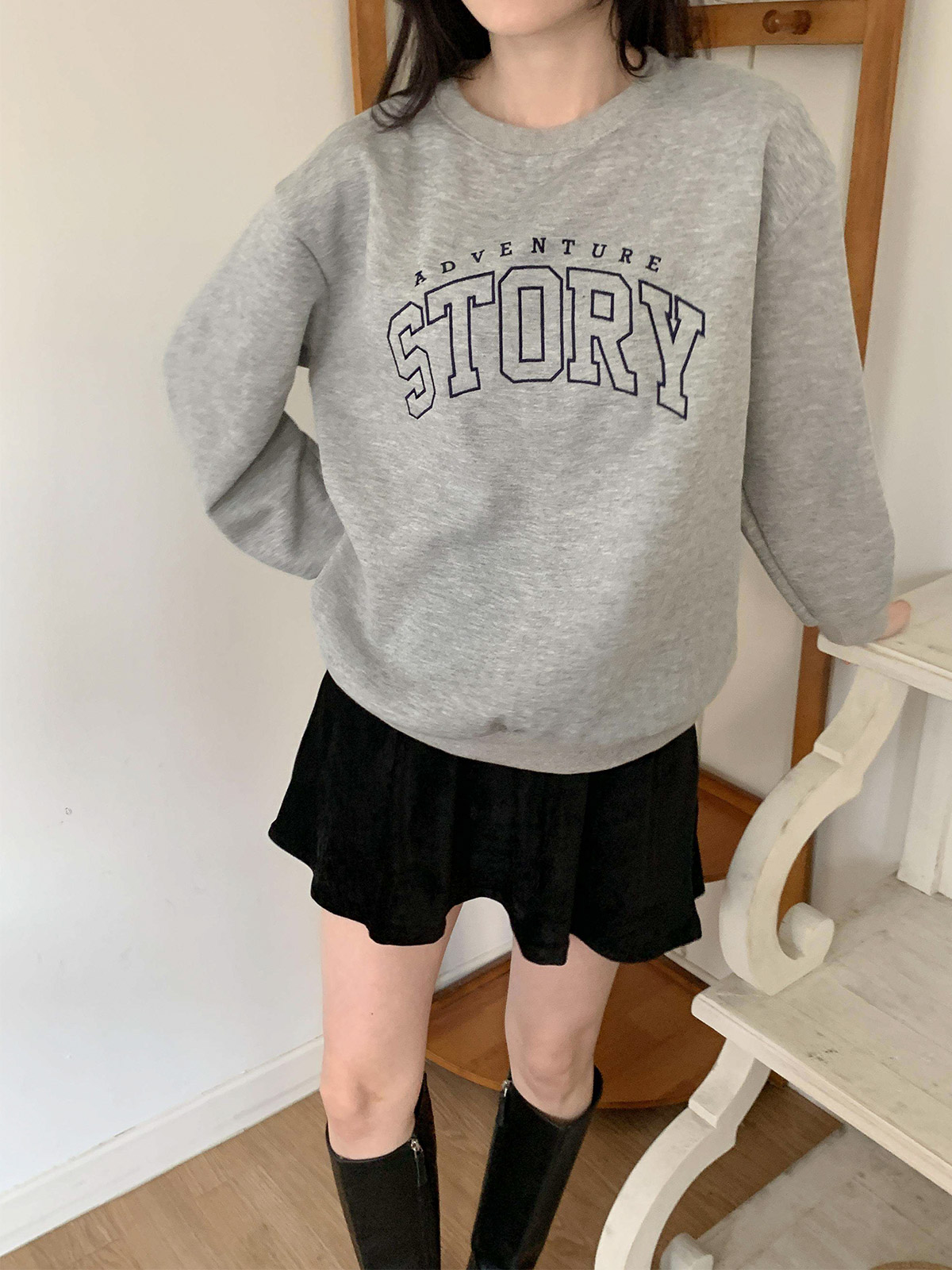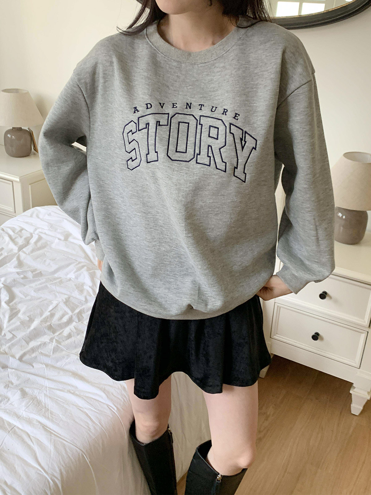 [ T17382K5C-데르드 스토리 자수 오버핏 코튼 기모 맨투맨 ]