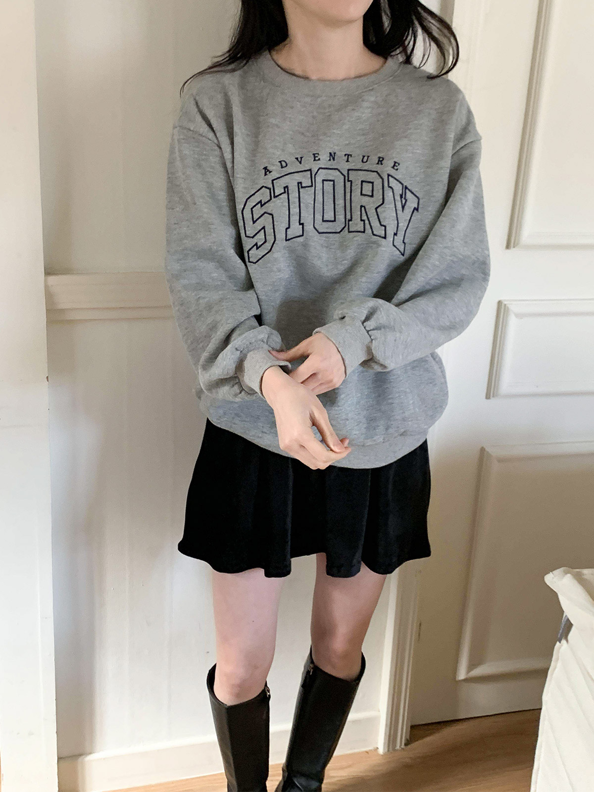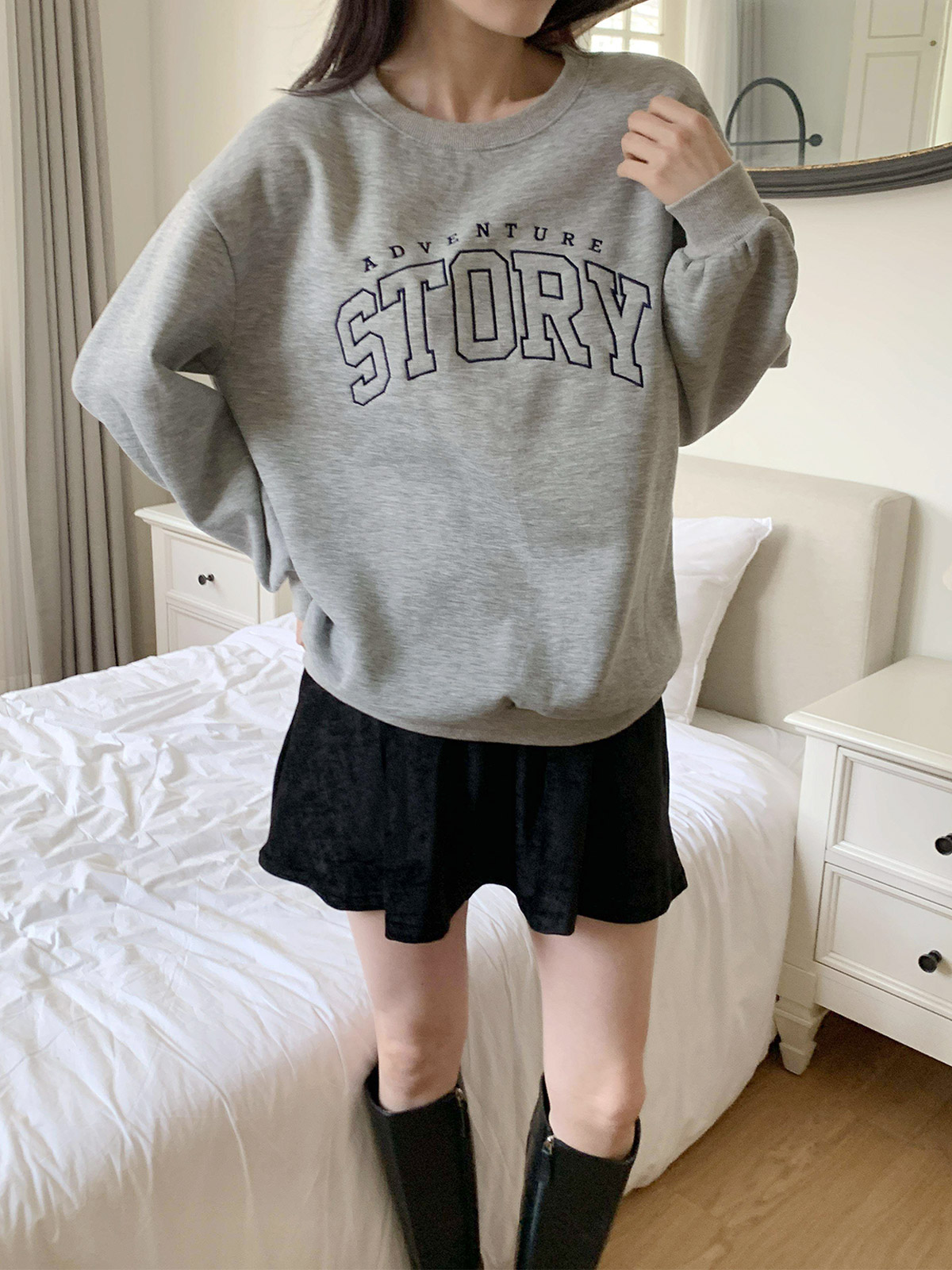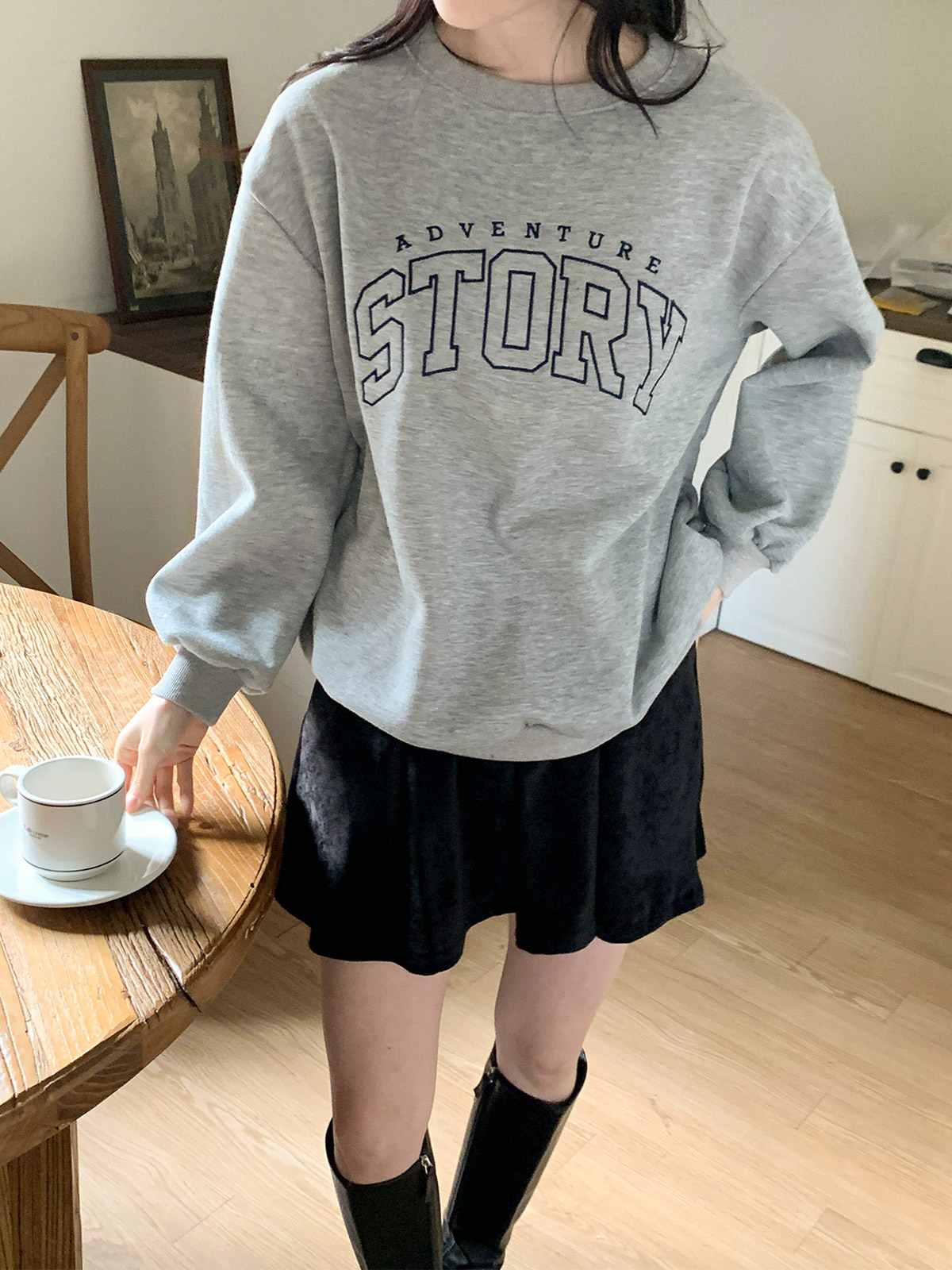 [ T17382K5C-데르드 스토리 자수 오버핏 코튼 기모 맨투맨 ]