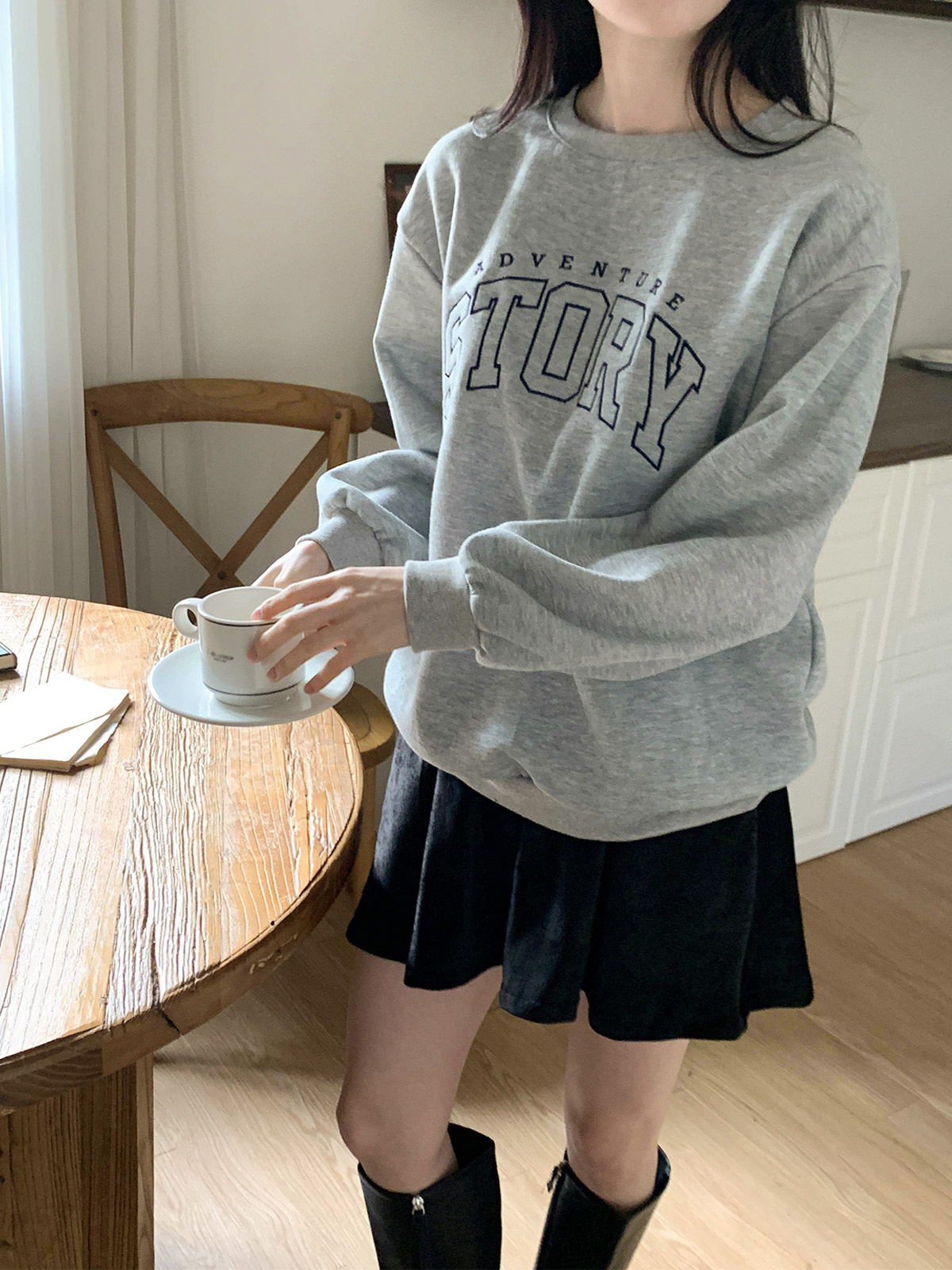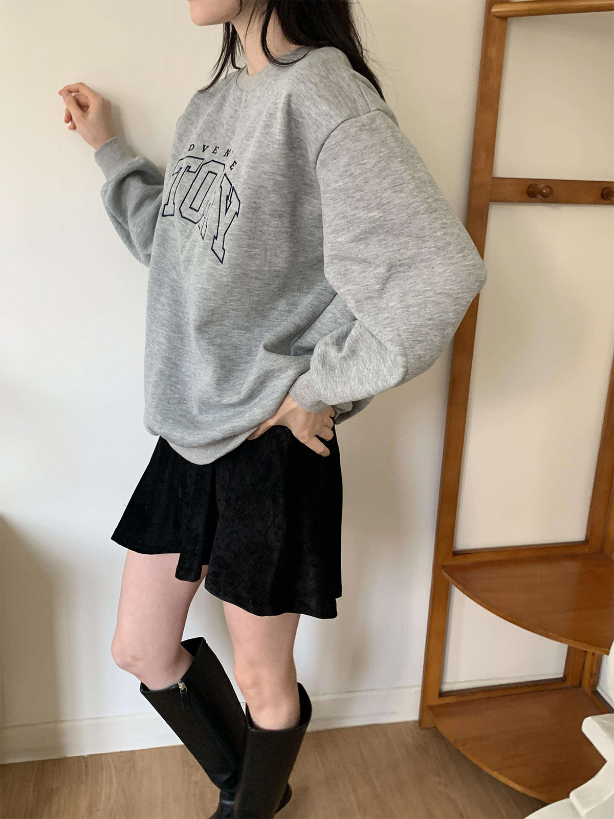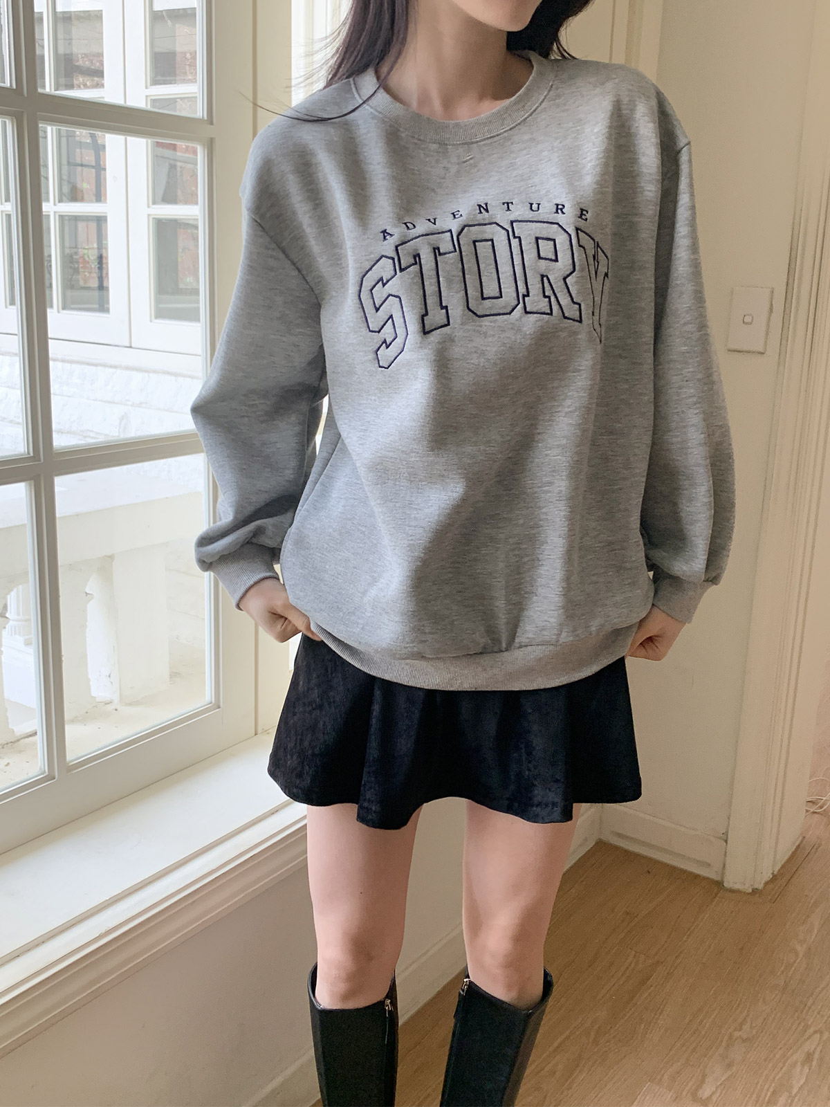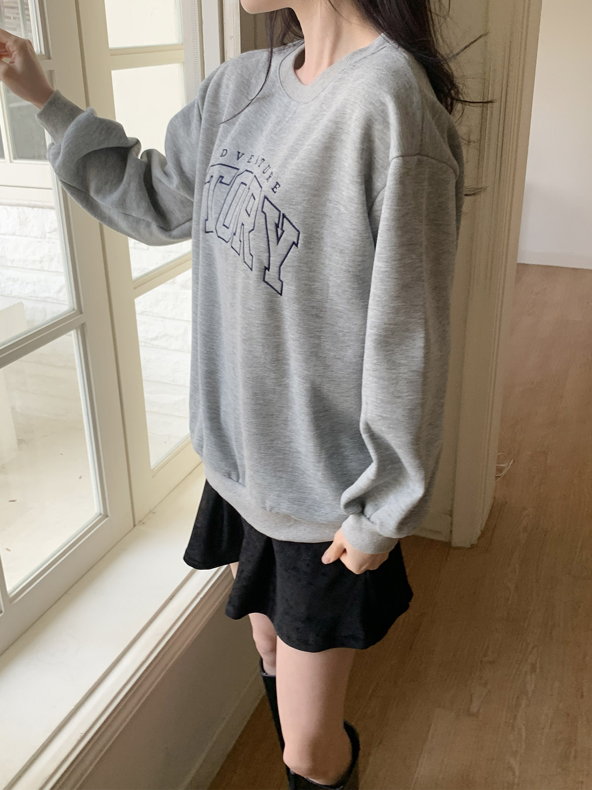 섬세한 레터링 자수가 포인트인 루즈핏 기모 맨투맨