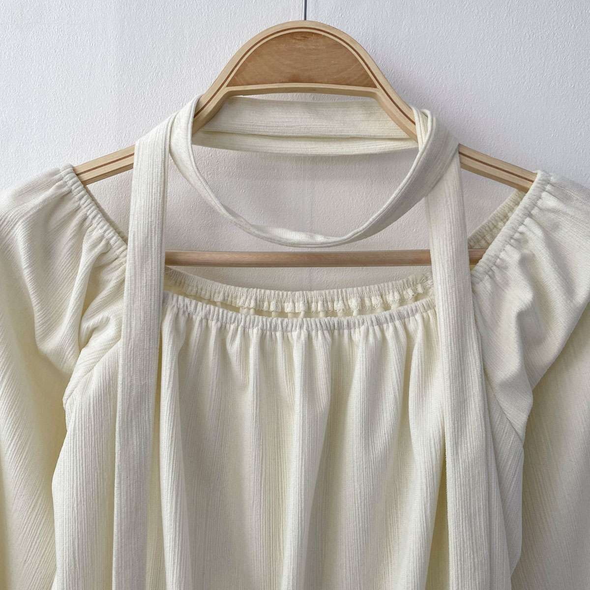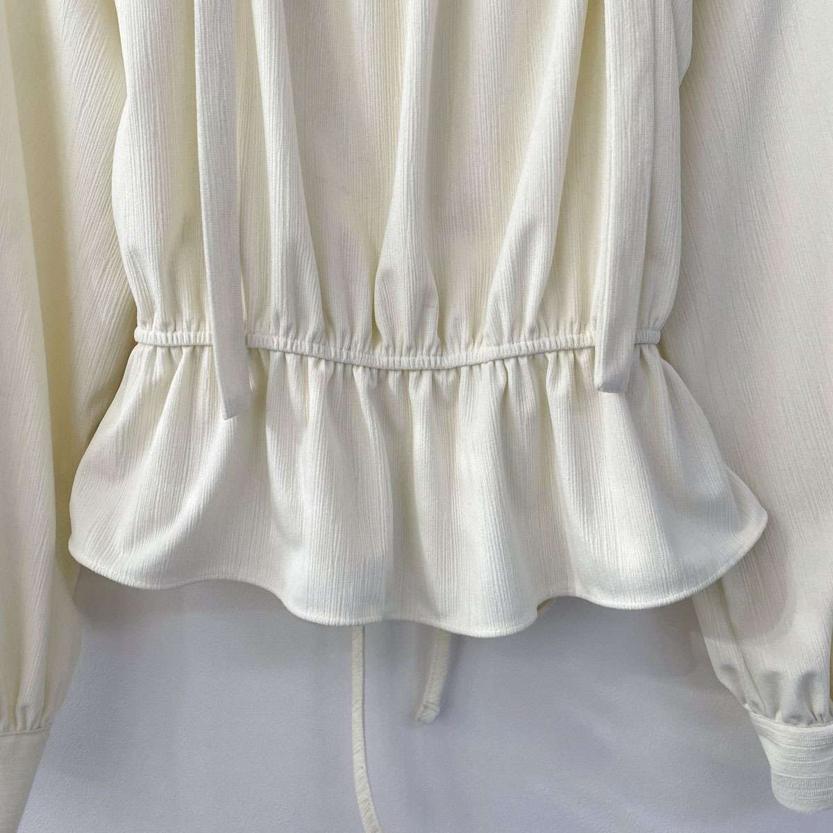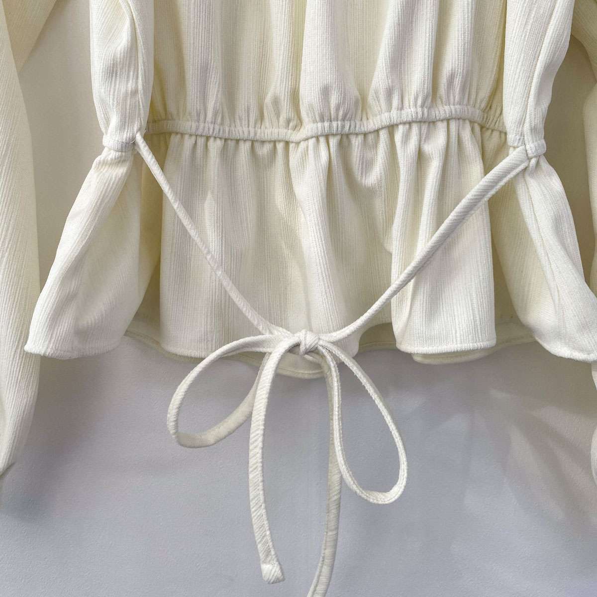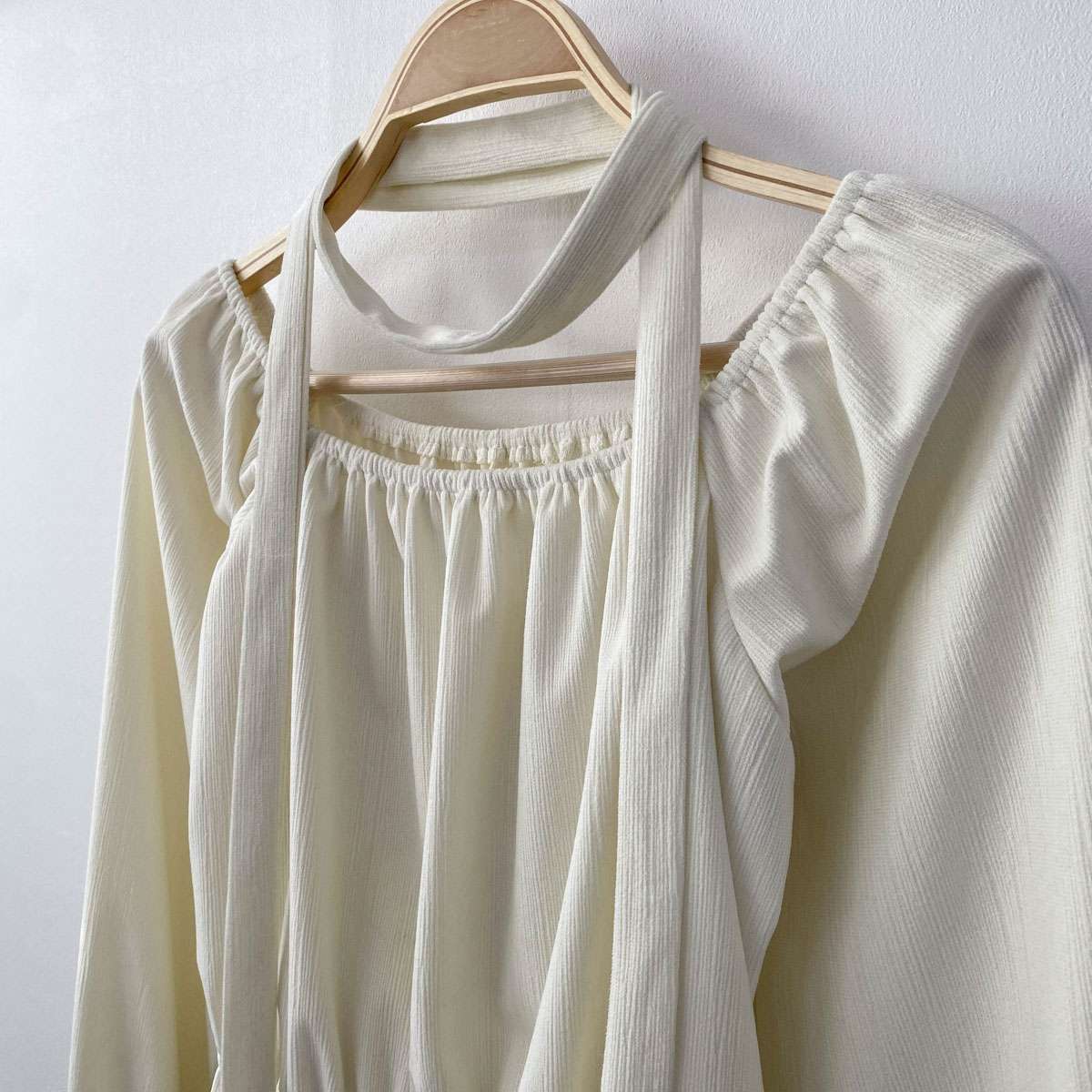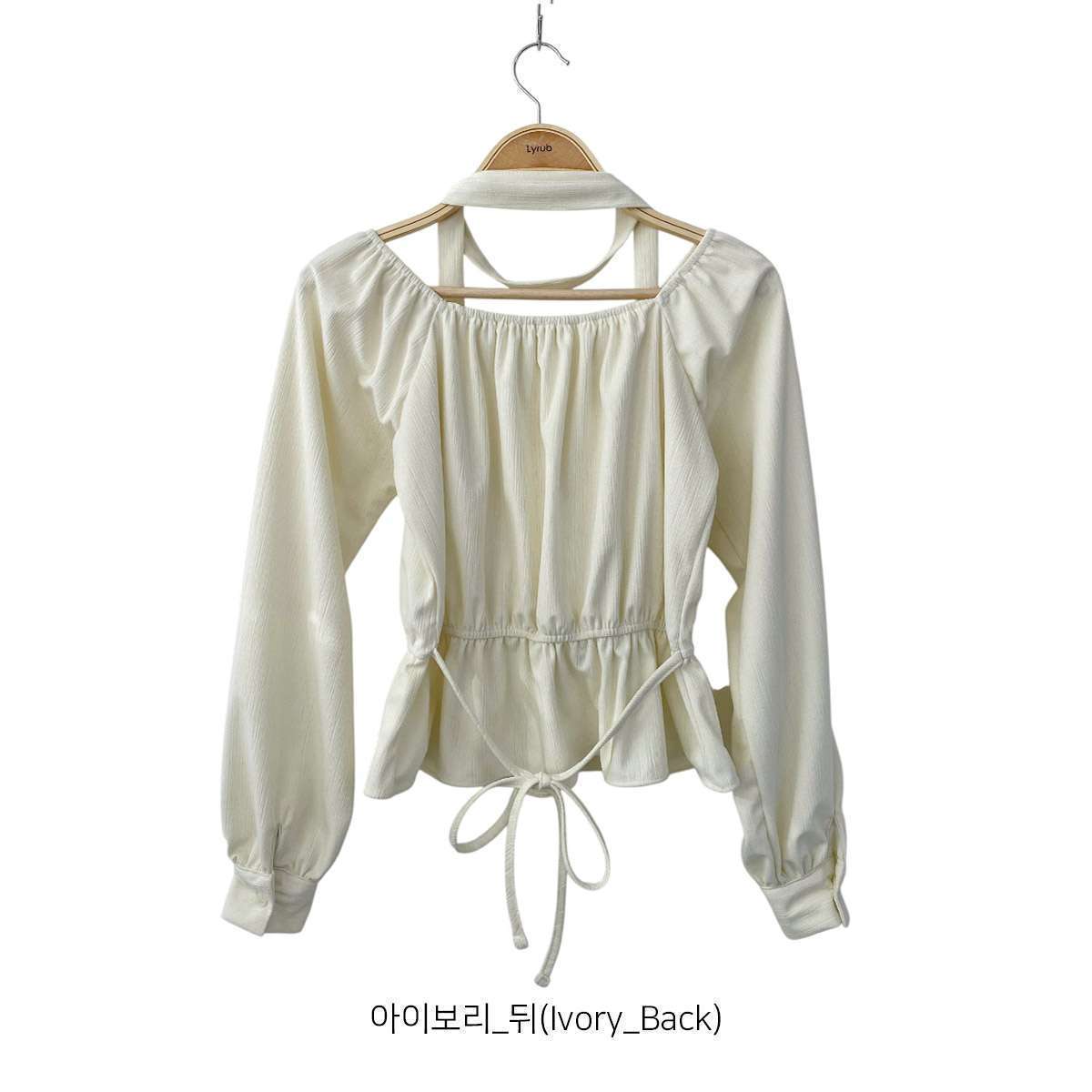 넓은 스퀘어 넥라인과 가슴 부분 셔링 디테일이 포인트인 리본 블라우스