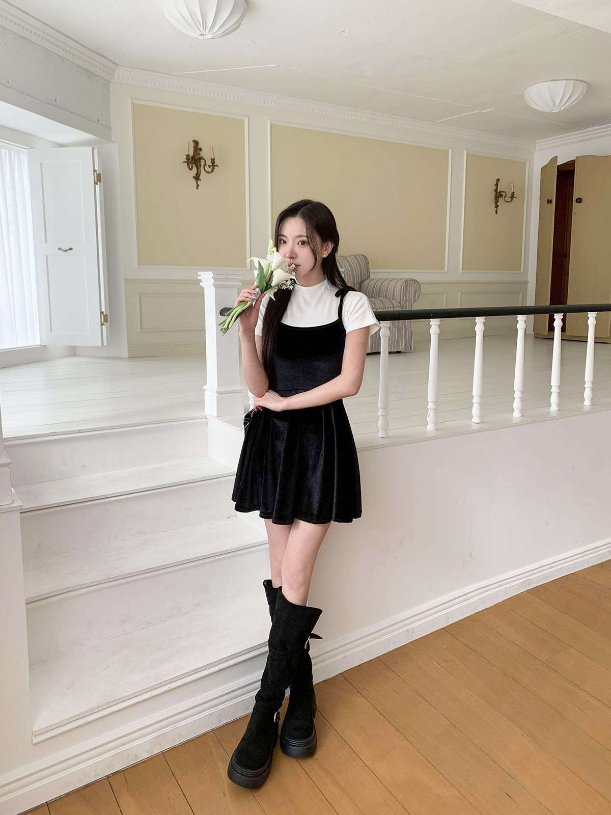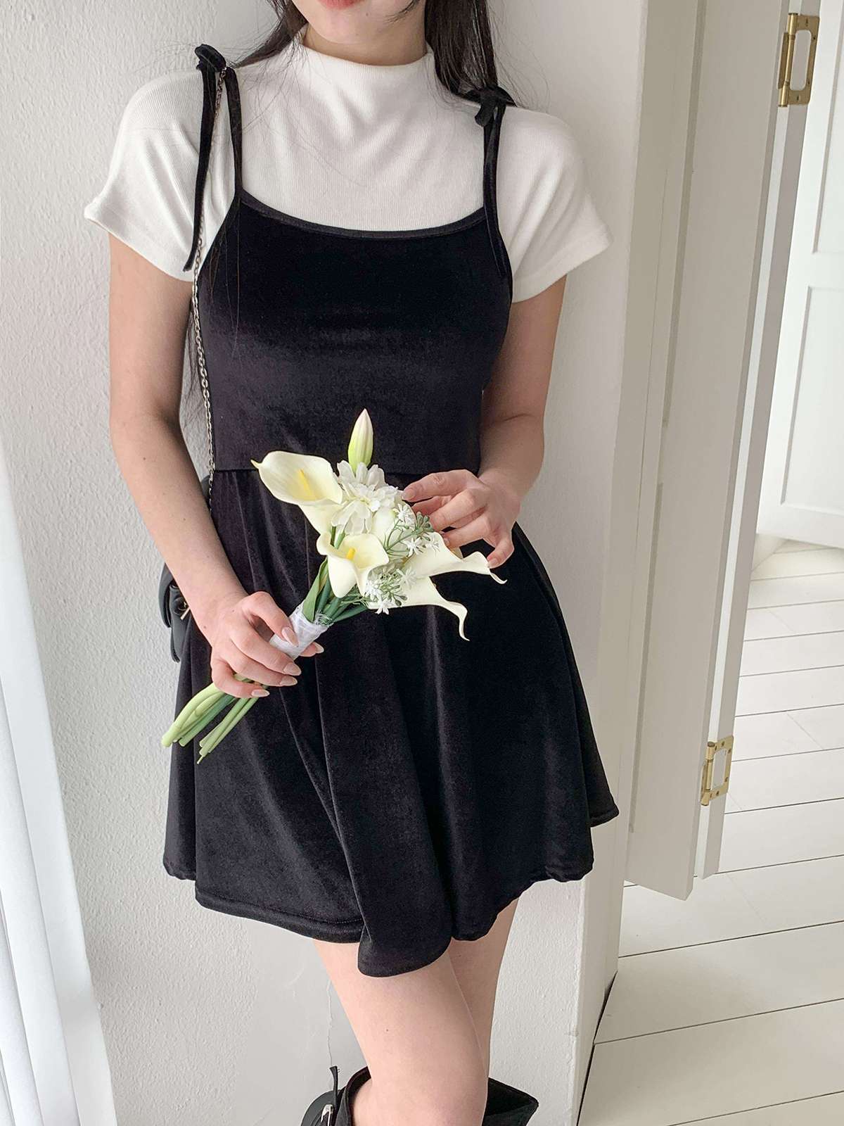 부드럽고 은은한 광택이 감도는 벨벳 소재로 제작되어 고급스러운 무드를 선사하는 미니 원피스
