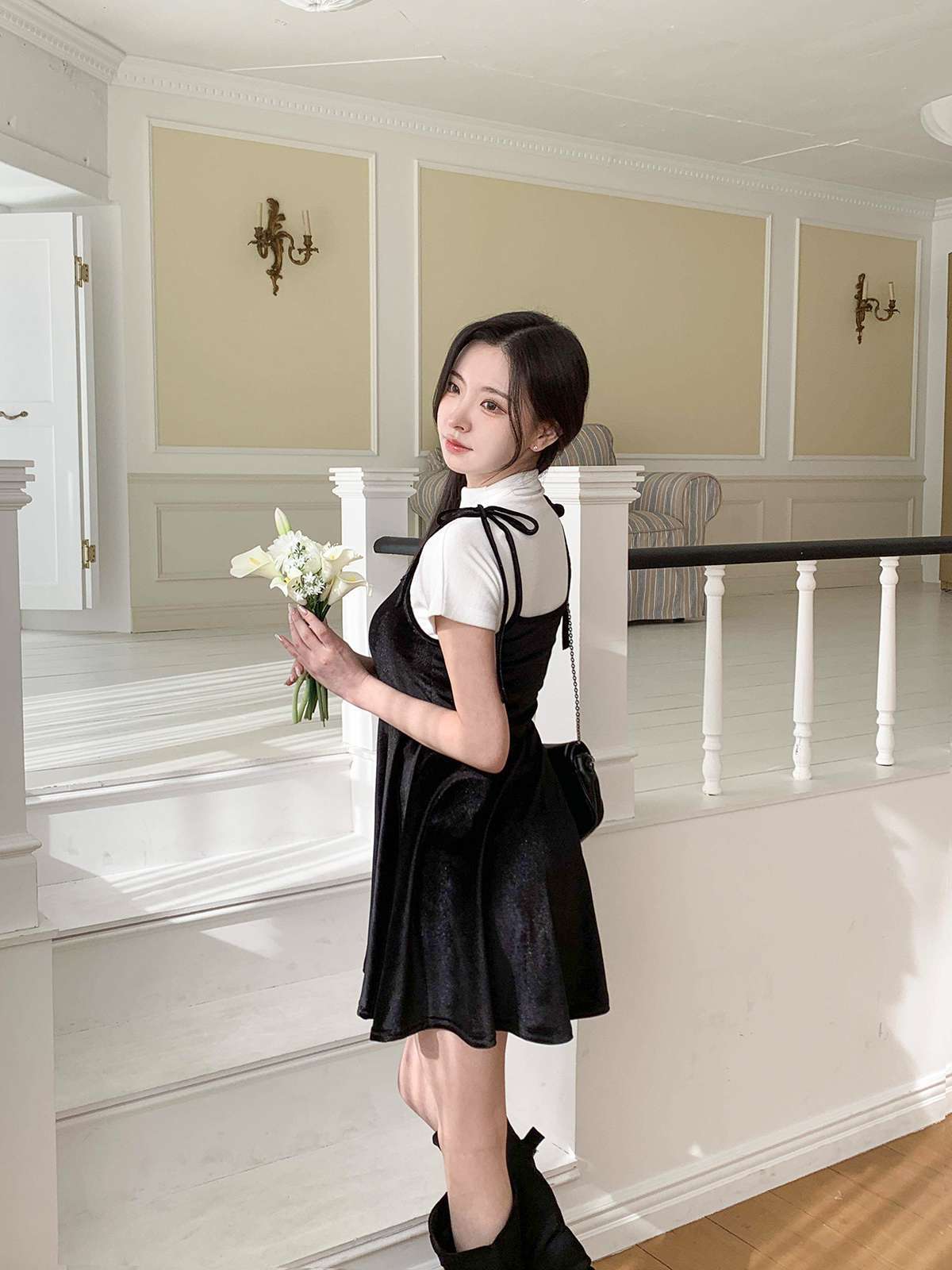 [ OPS10439K5C-로아벨 리본 나시 플레어 벨벳 미니 원피스 ]