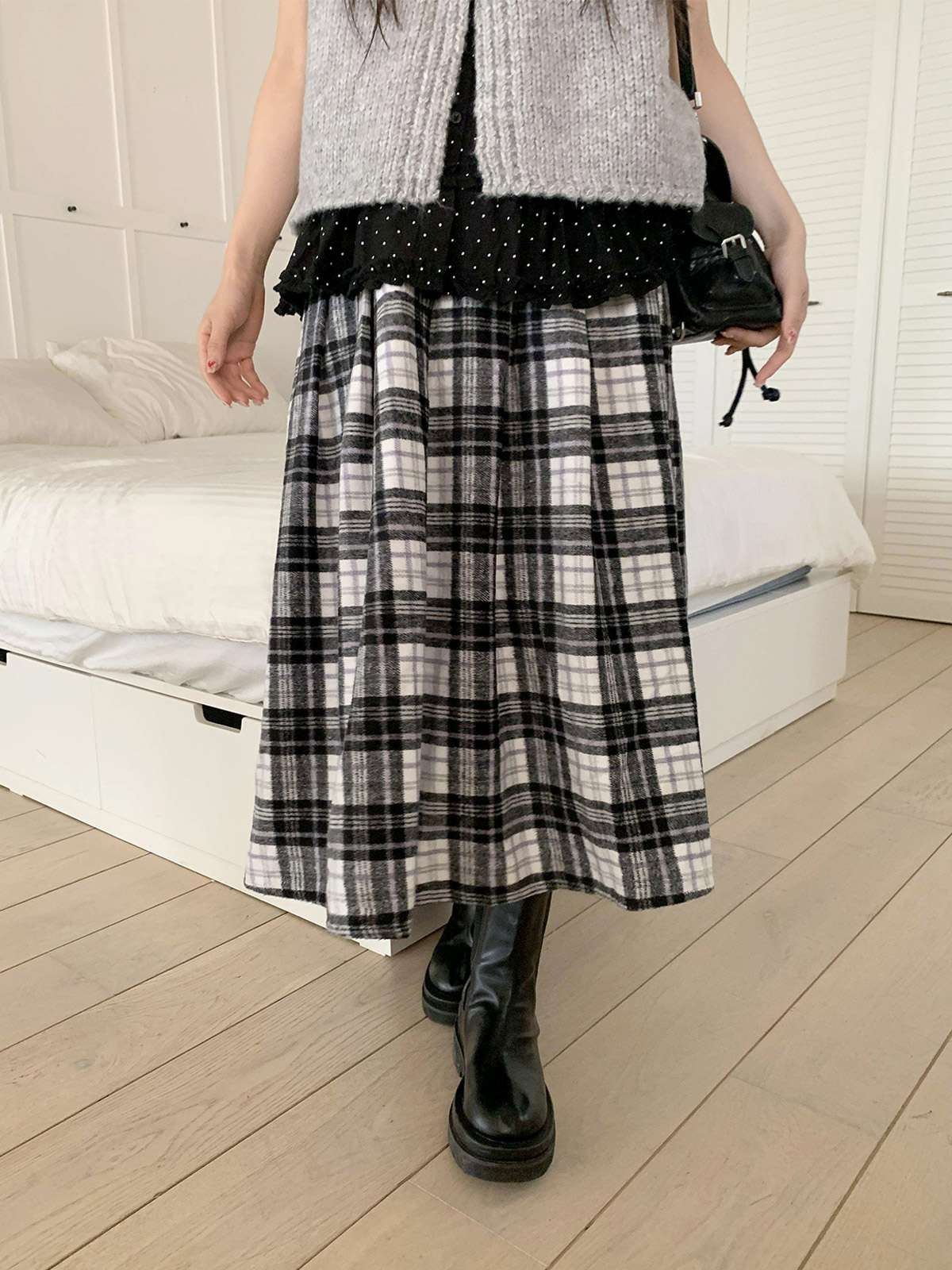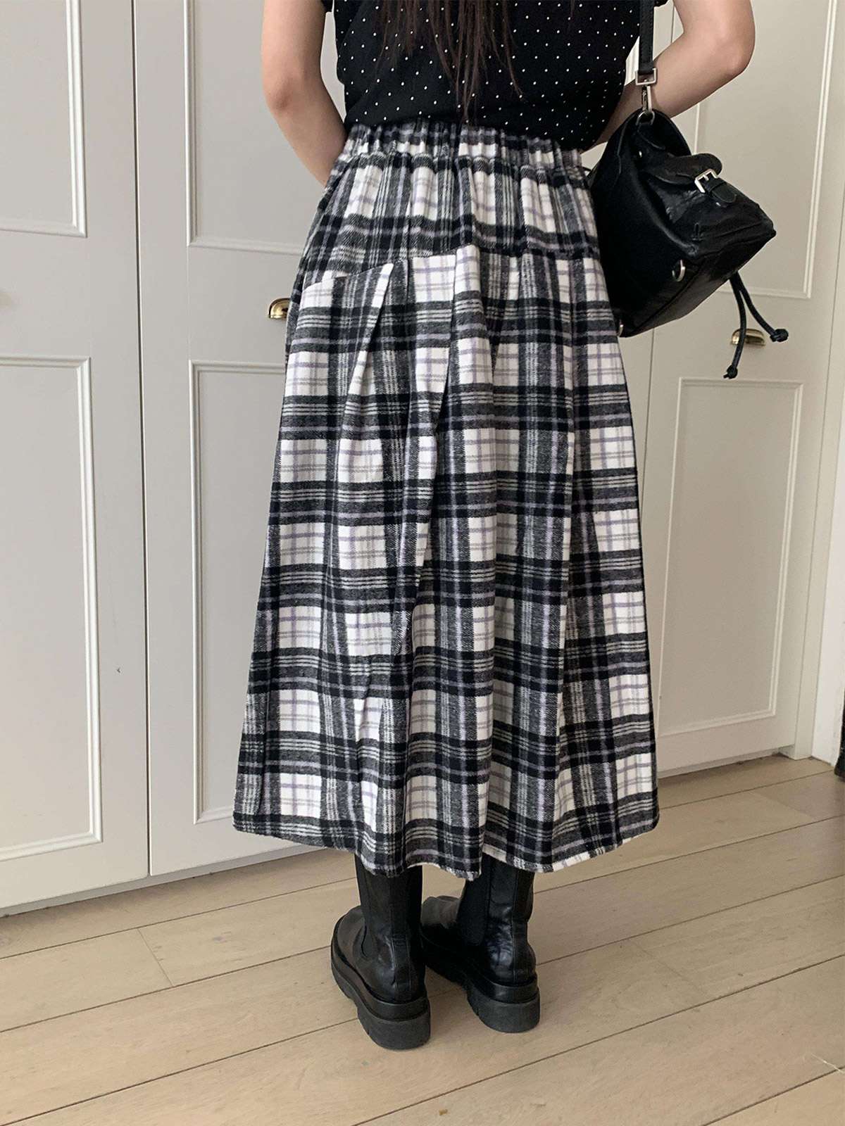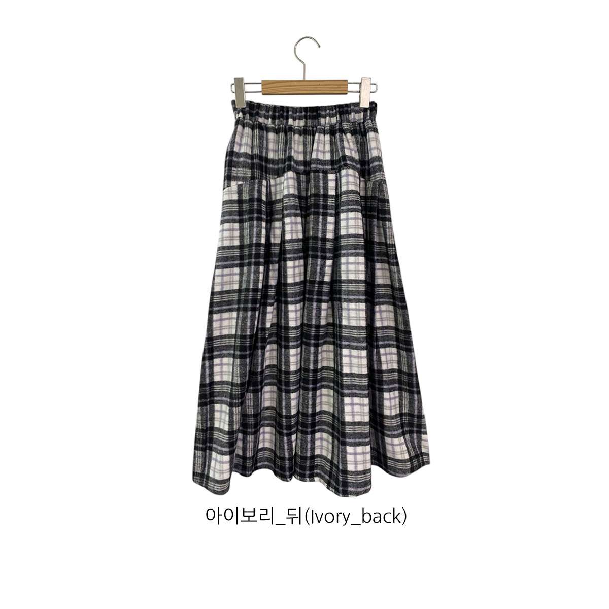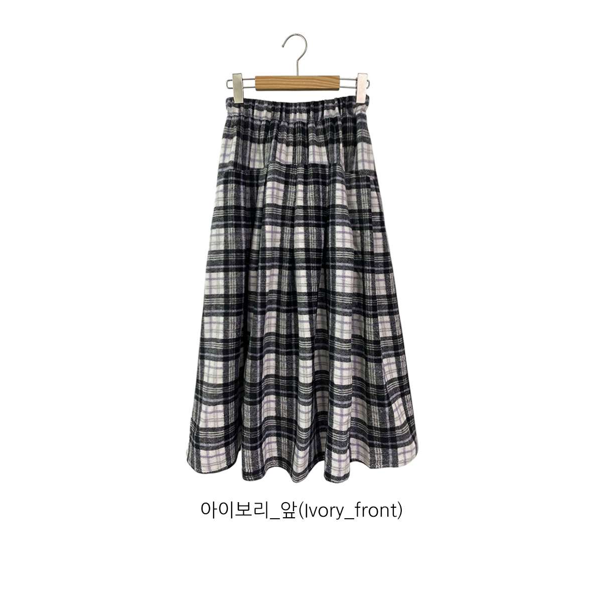 웜한 모직 소재로 겨울부터 봄 시즌까지 포근하게 착용되는 체크 롱 스커트로