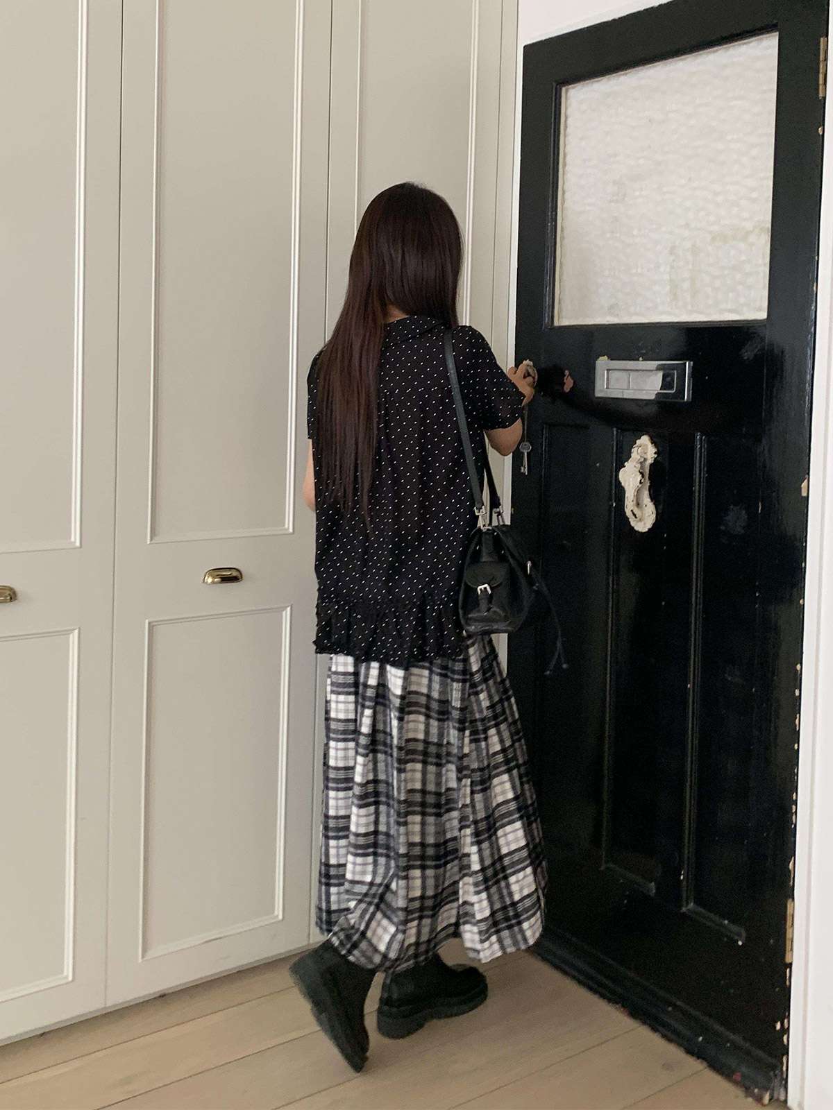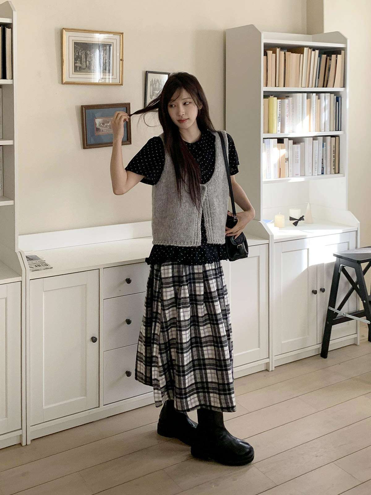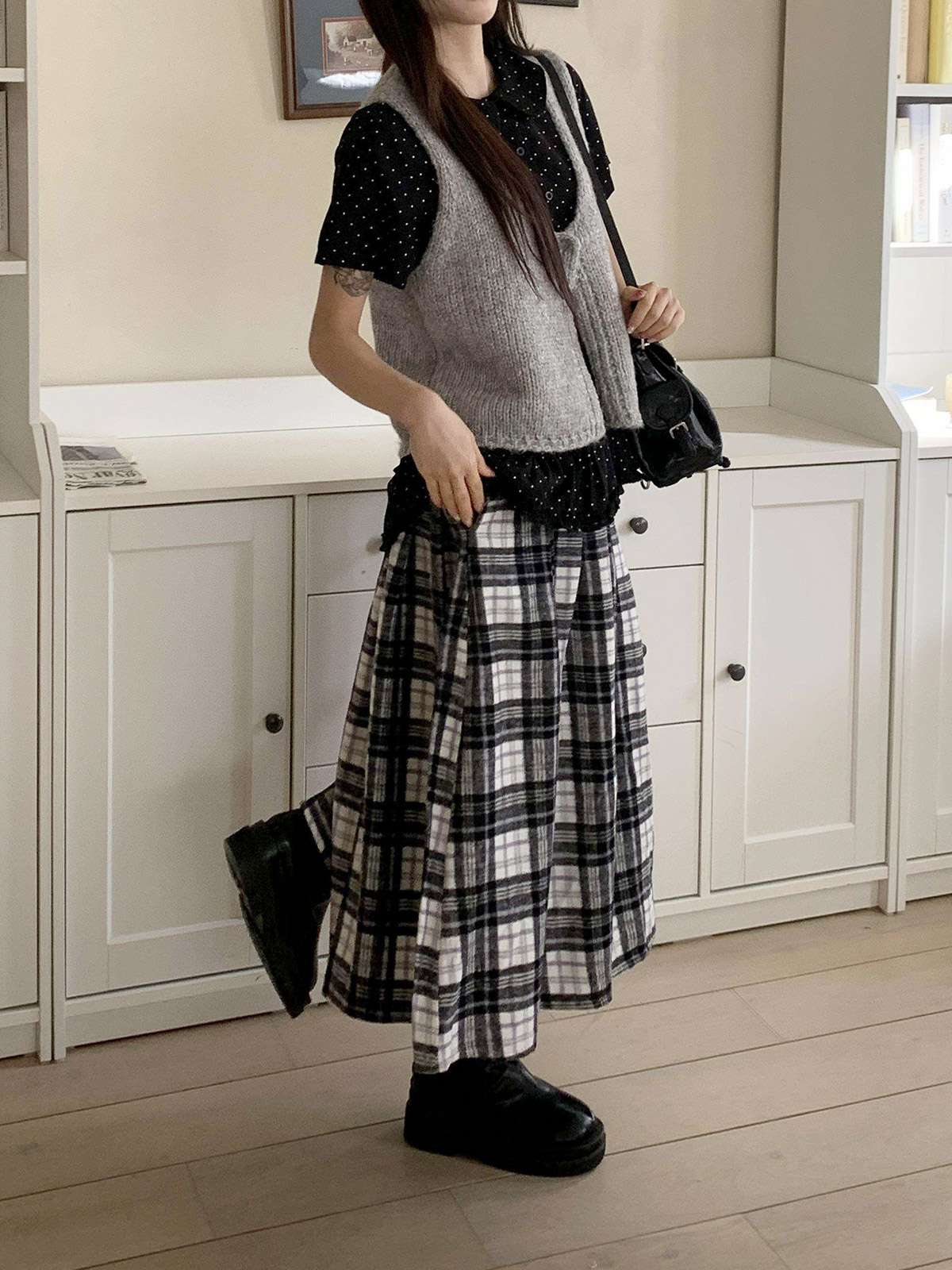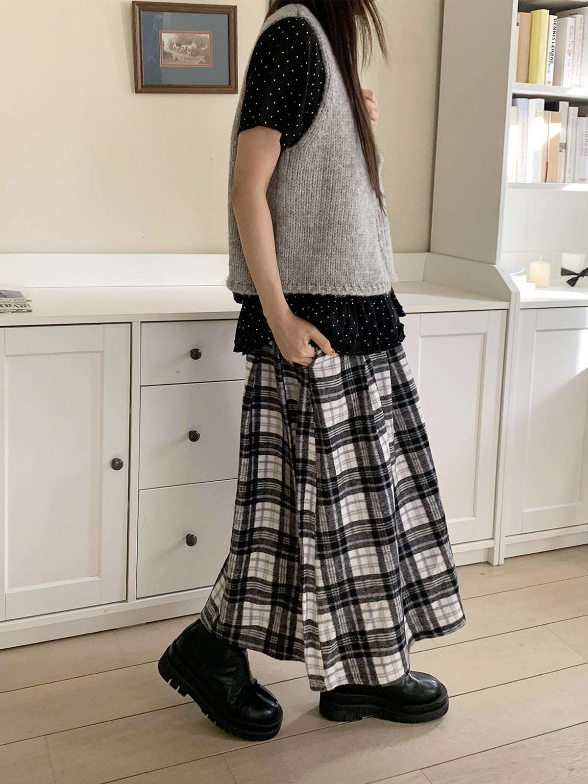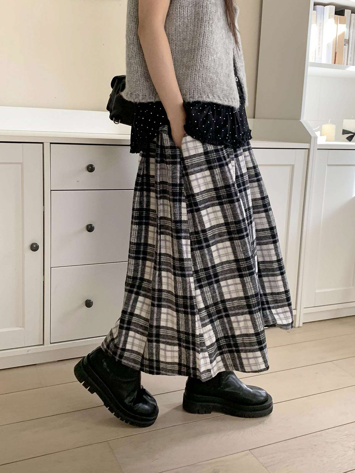 데일리룩으로 모리걸 스타일로도 잘어울리는 롱 체크 스커트