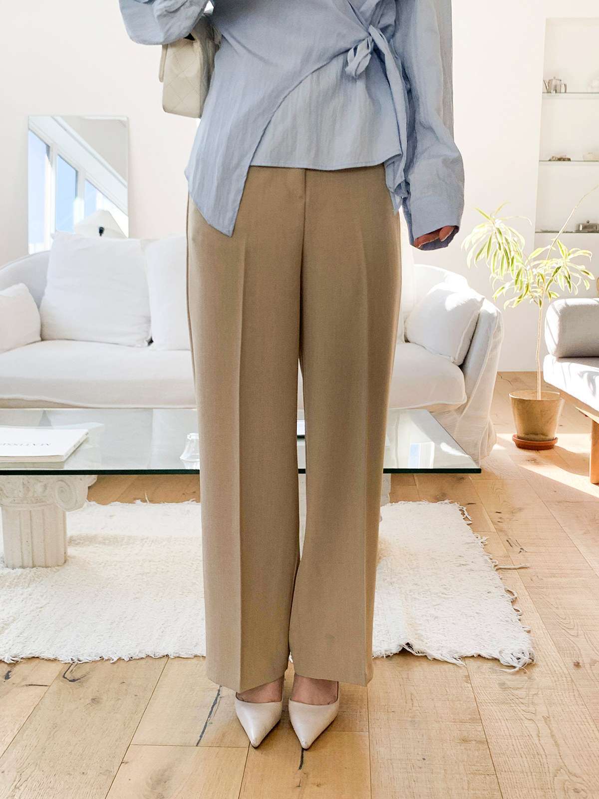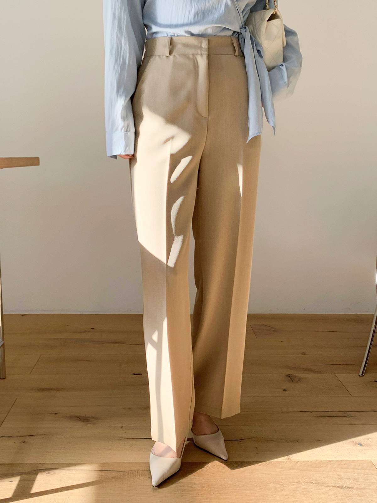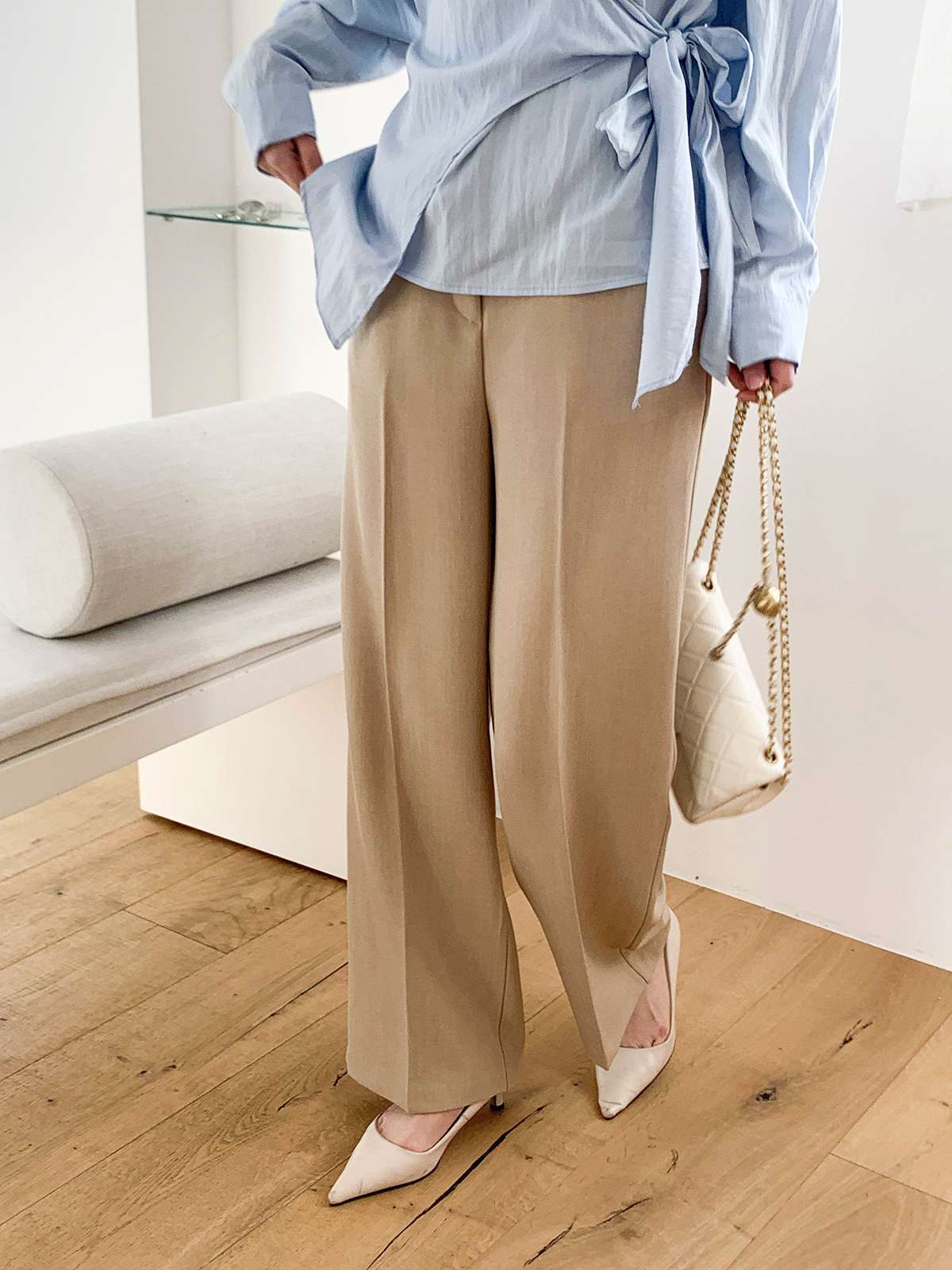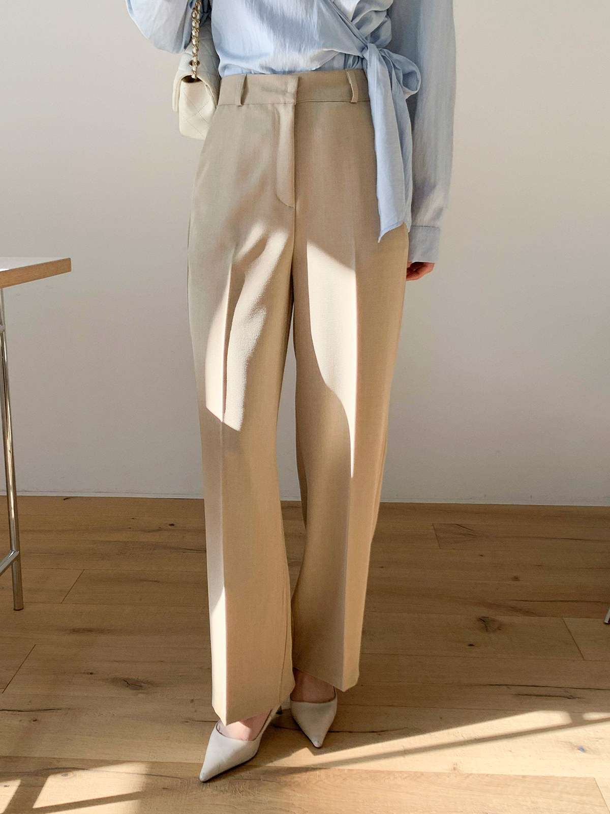 허리부터 밑단까지 일자로 곧게 떨어지는 와이드한 실루엣이 특징인 슬랙스