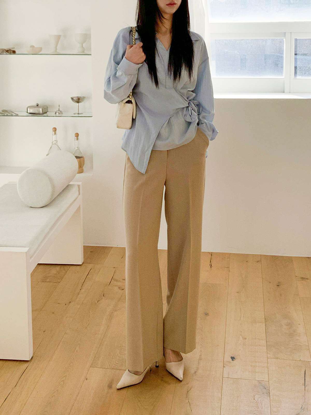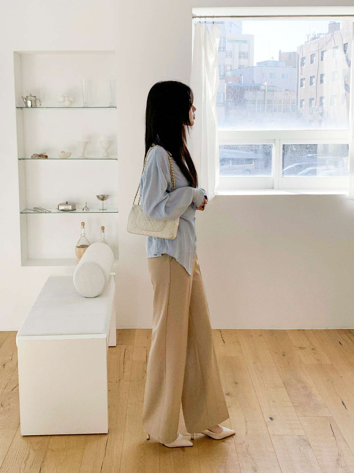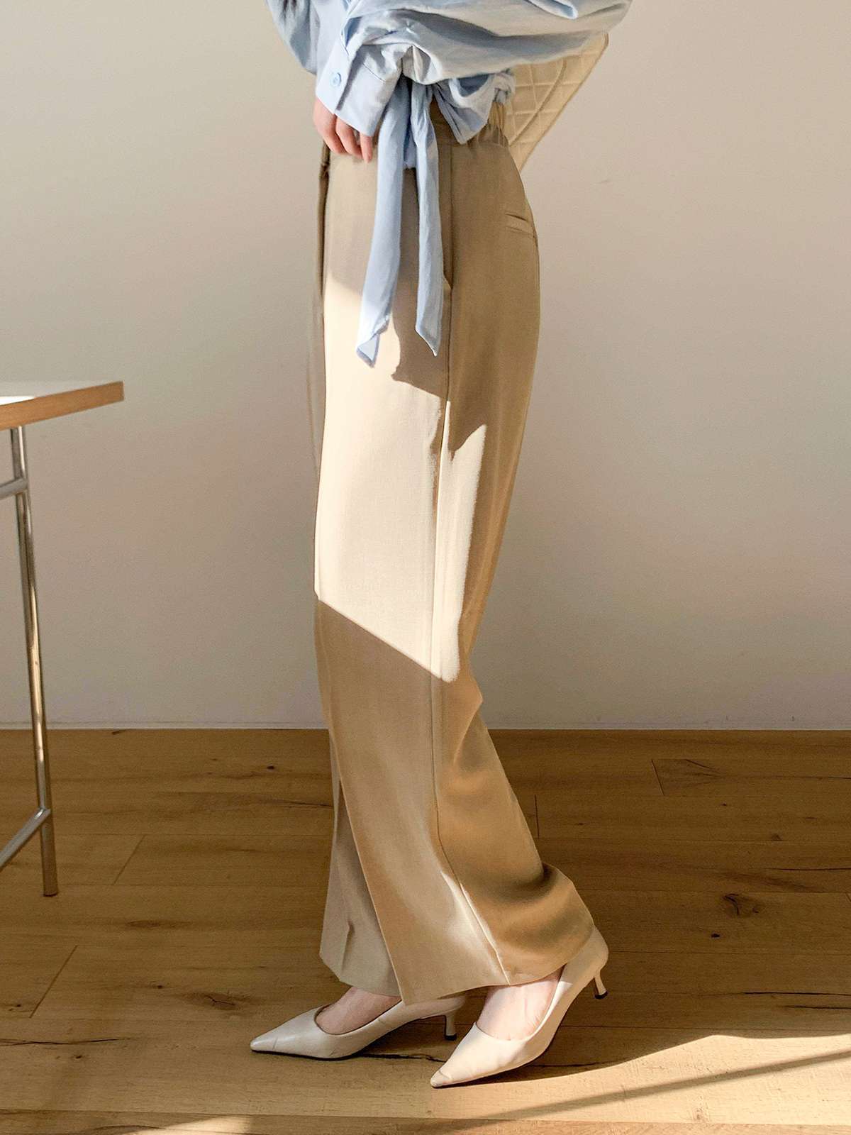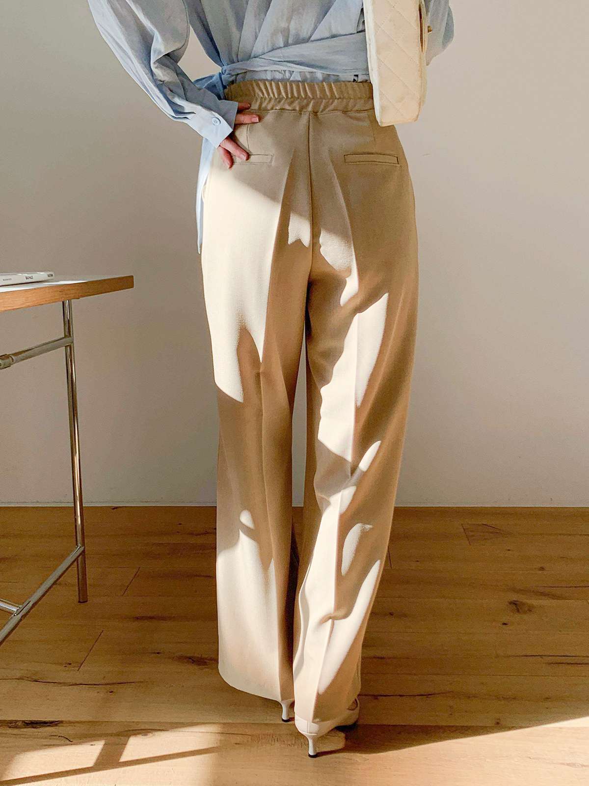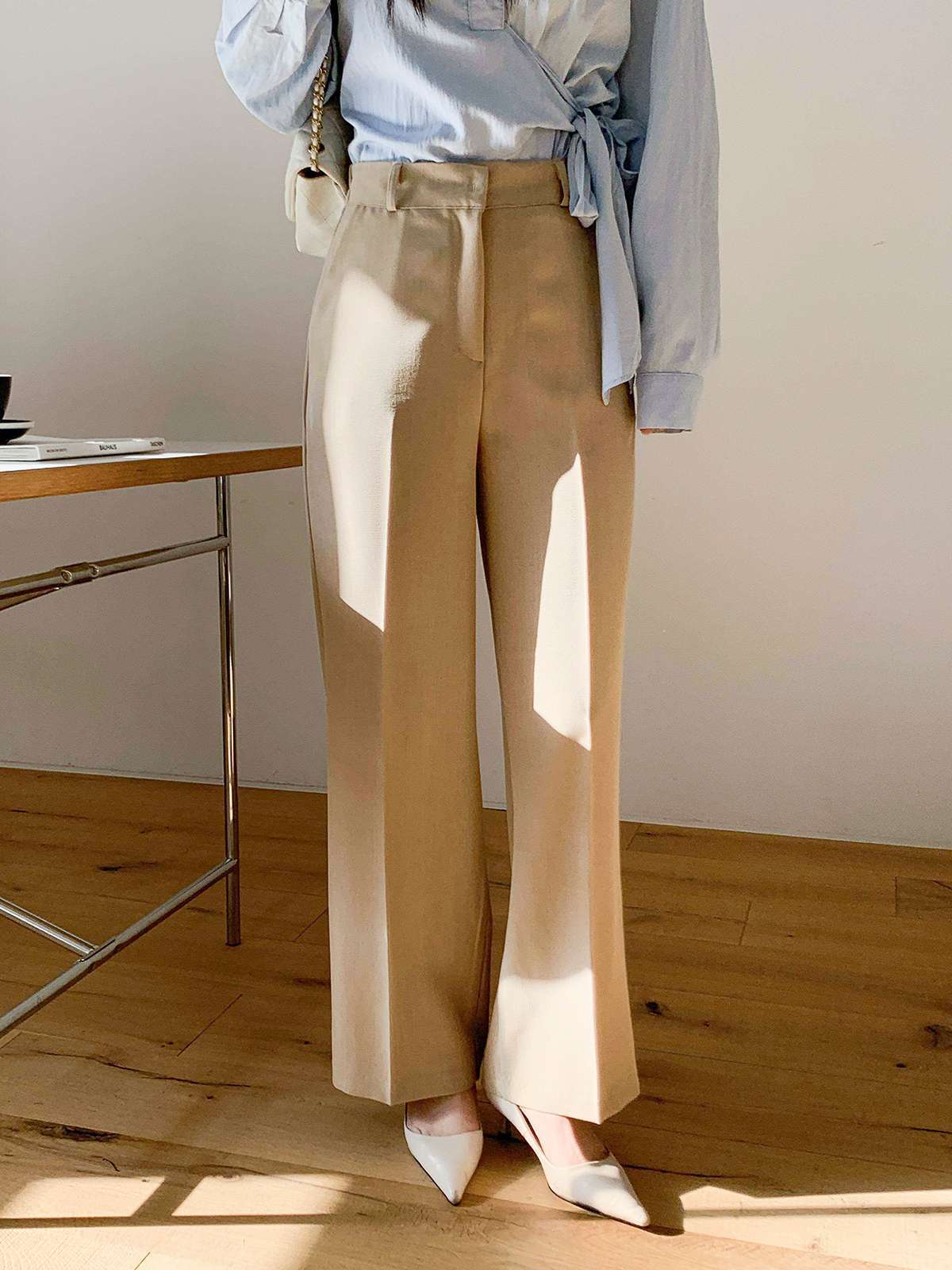 허리부터 밑단까지 일자로 곧게 떨어지는 와이드한 실루엣이 특징인 슬랙스