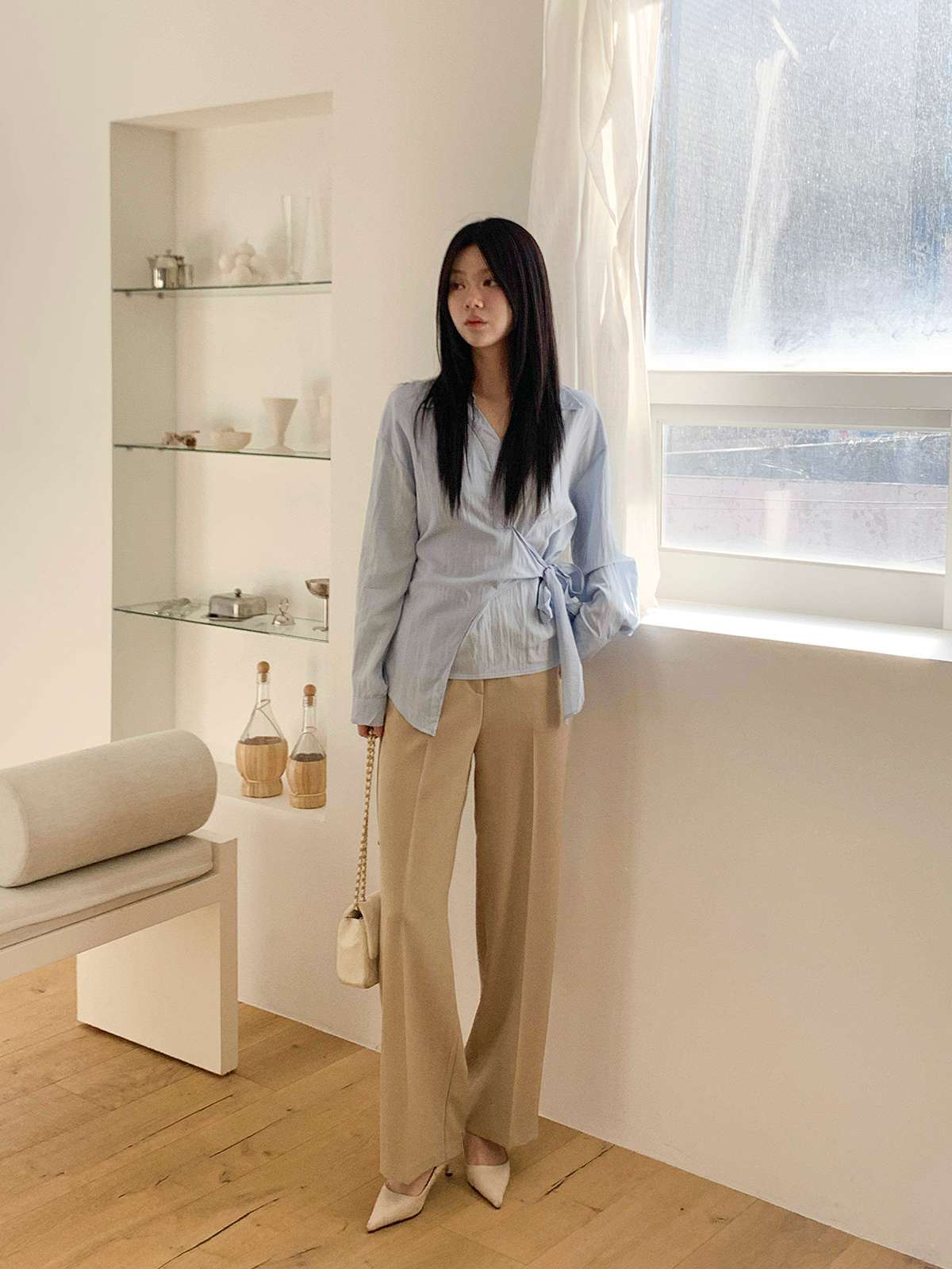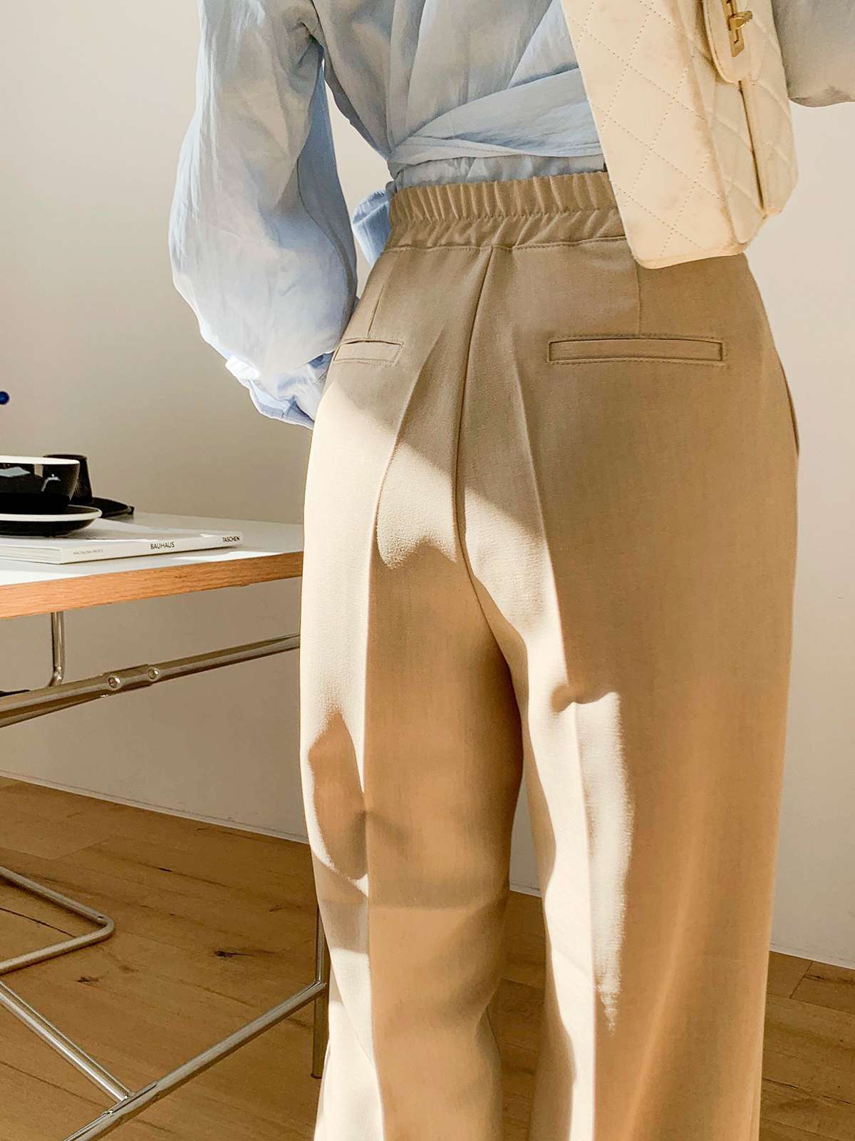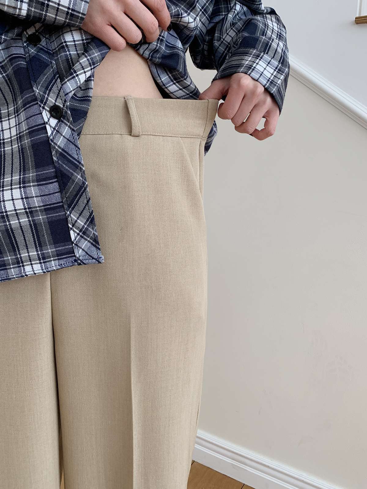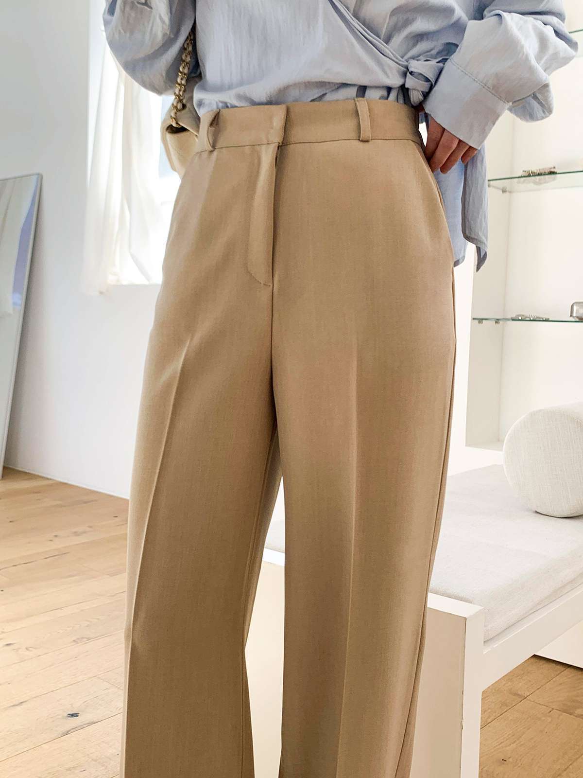 허리부터 밑단까지 일자로 곧게 떨어지는 와이드한 실루엣이 특징인 슬랙스