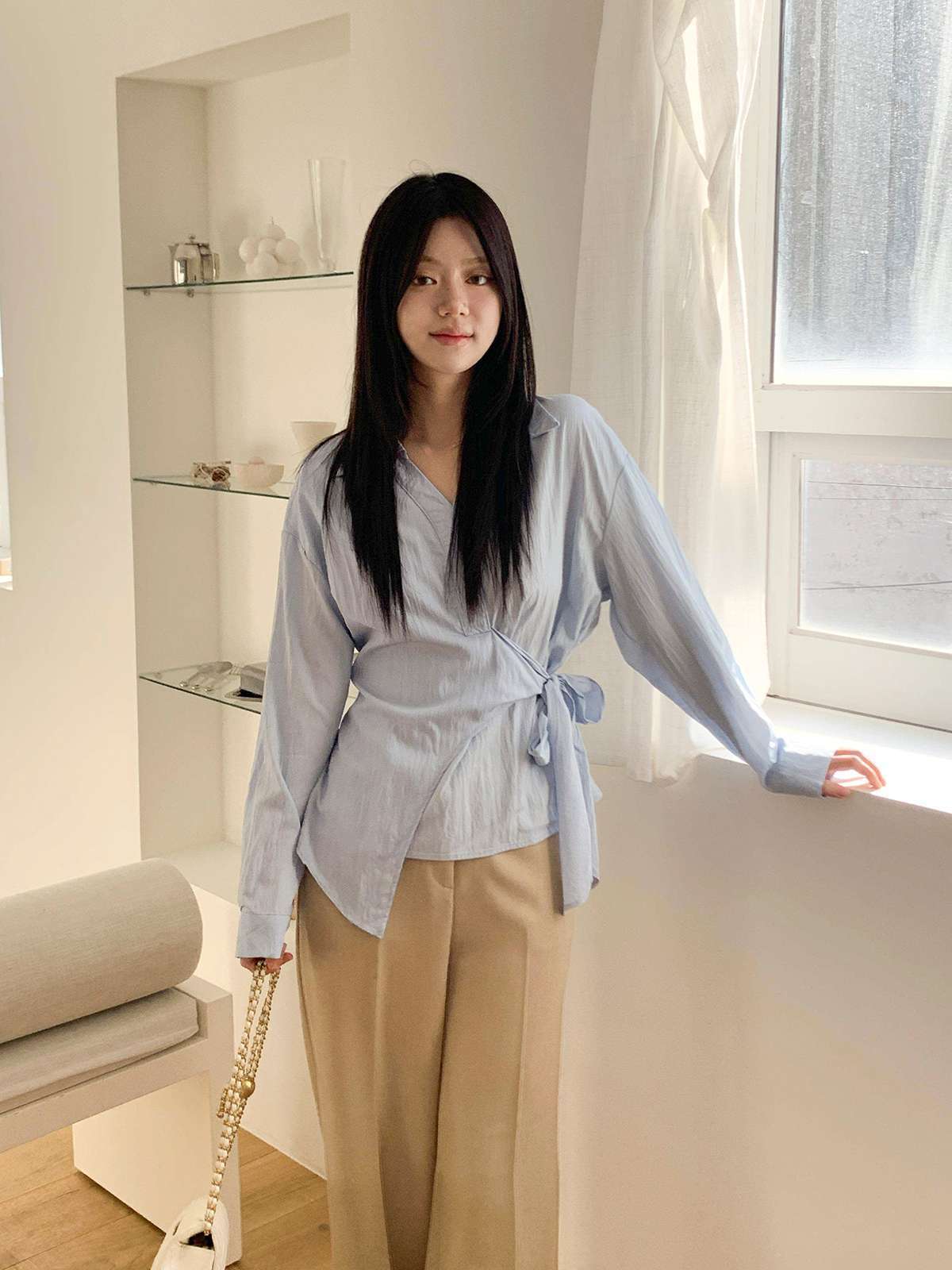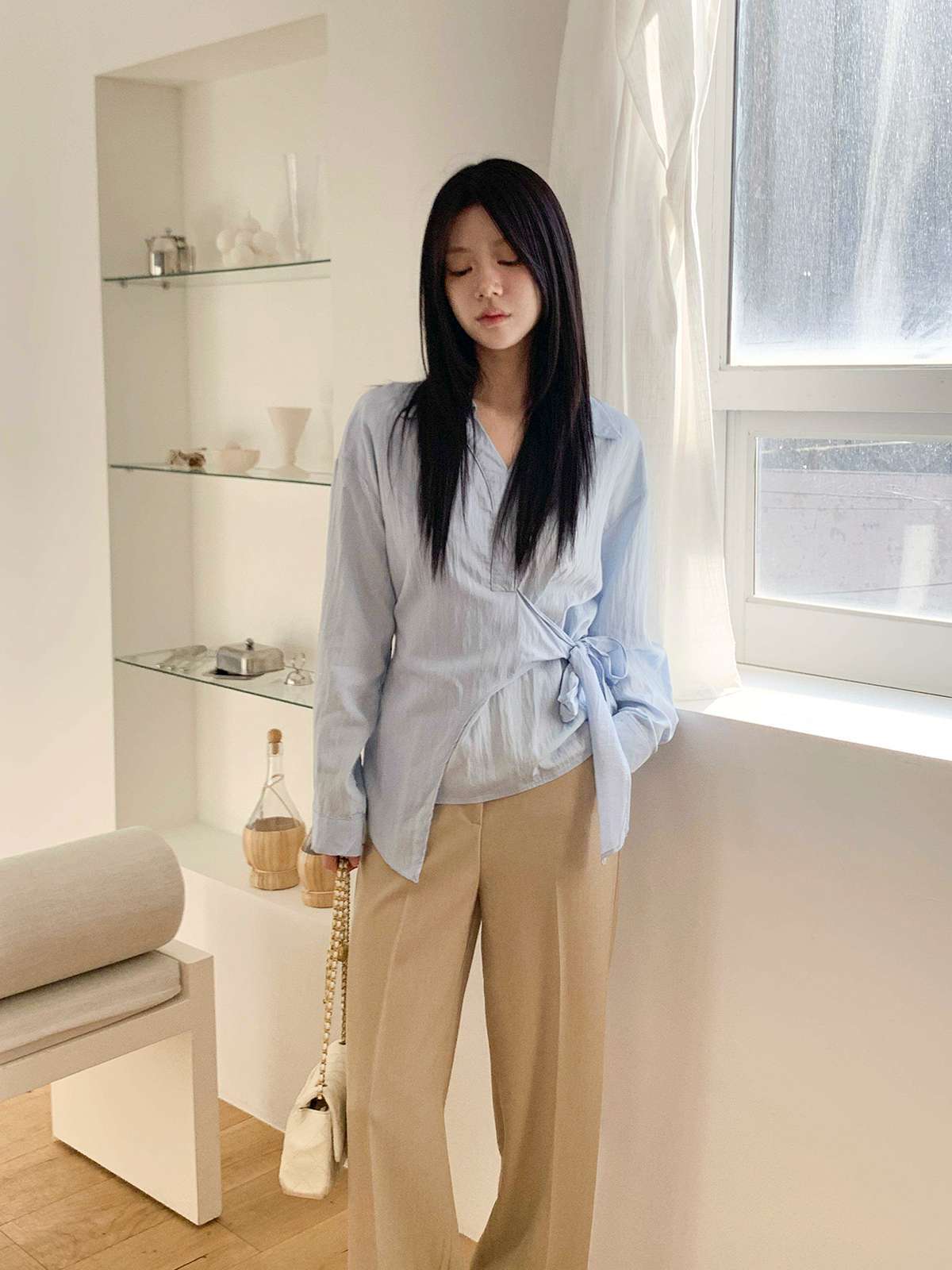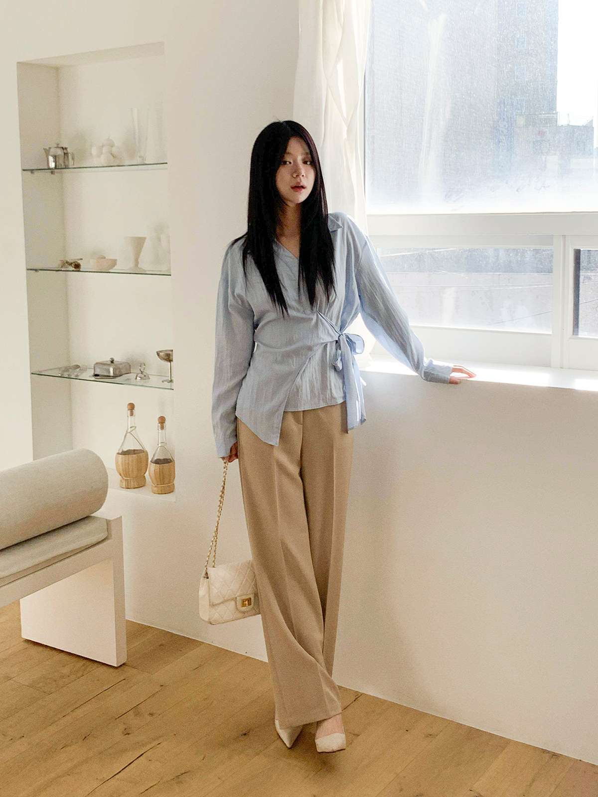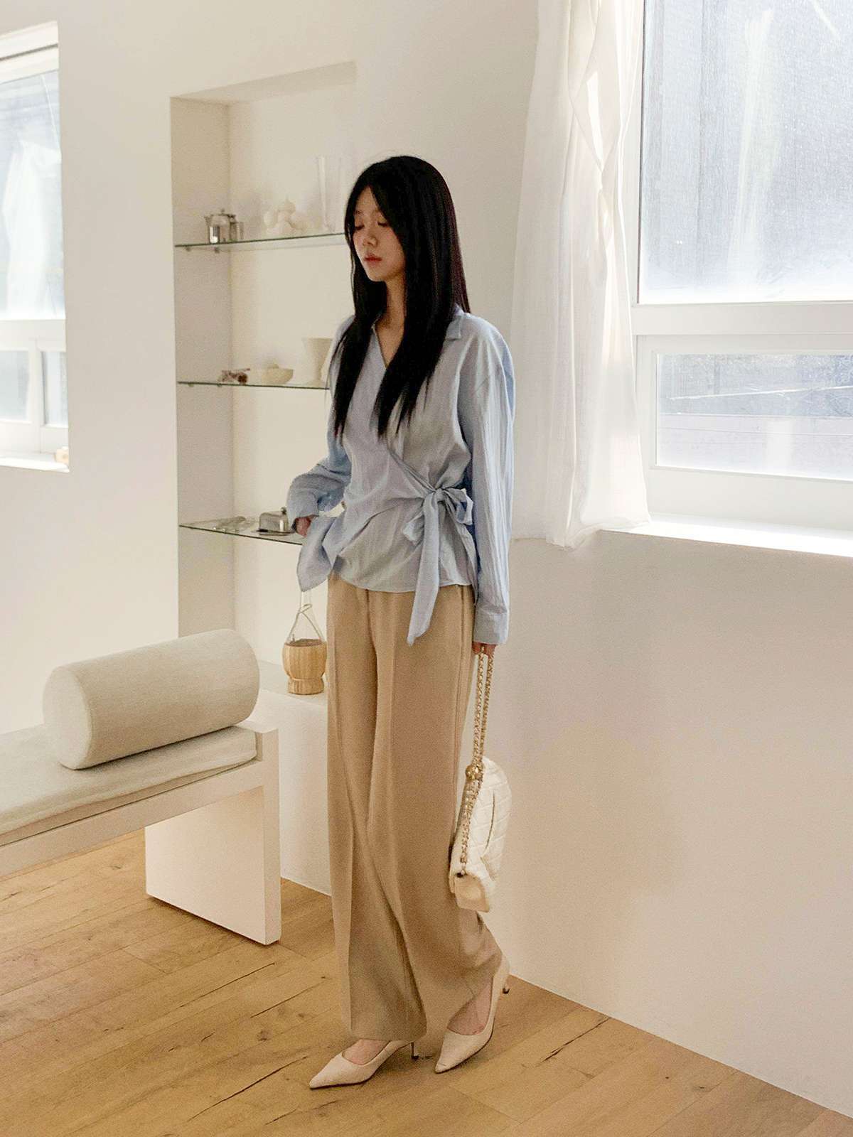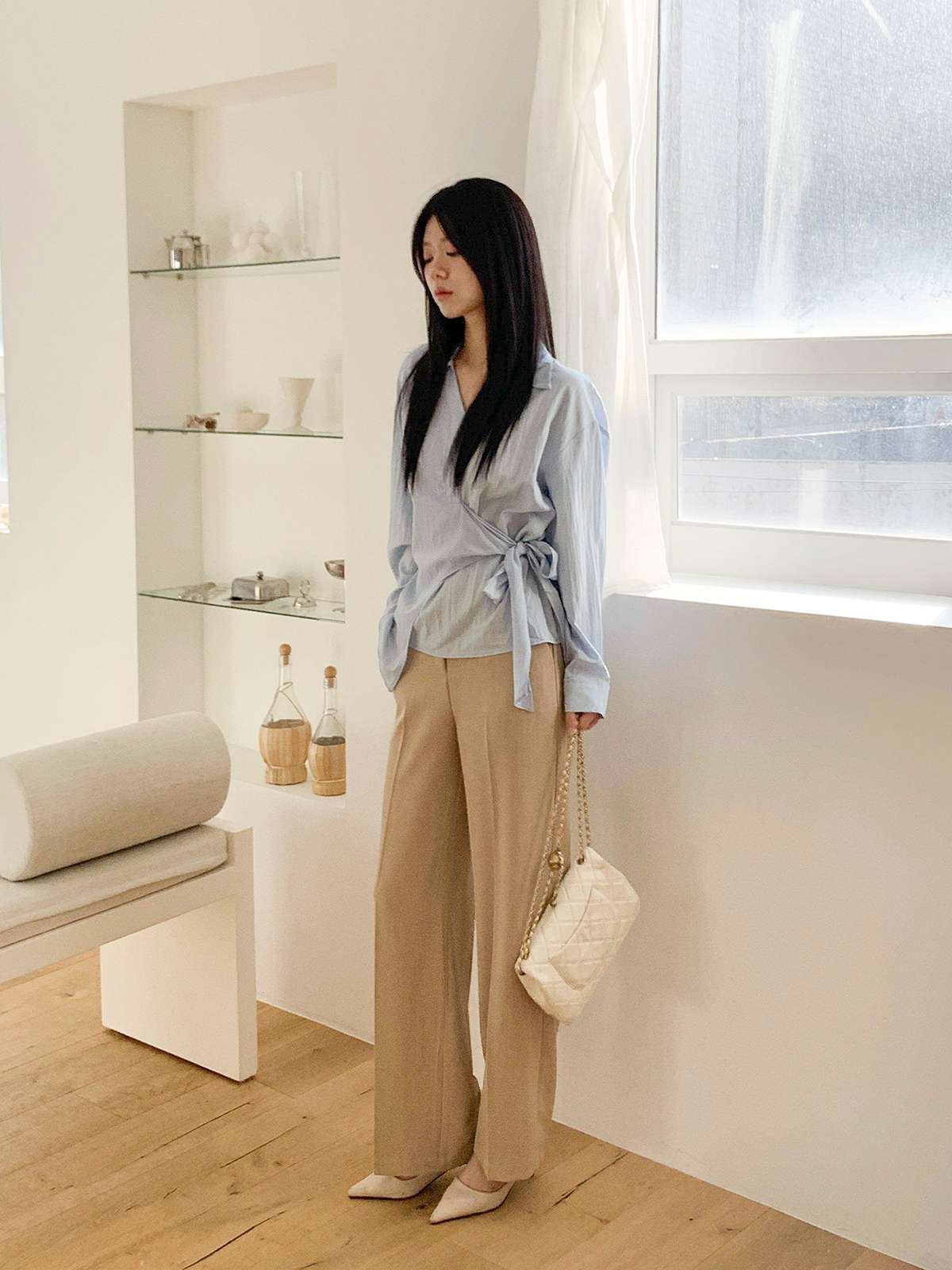 허리부터 밑단까지 일자로 곧게 떨어지는 와이드한 실루엣이 특징인 슬랙스