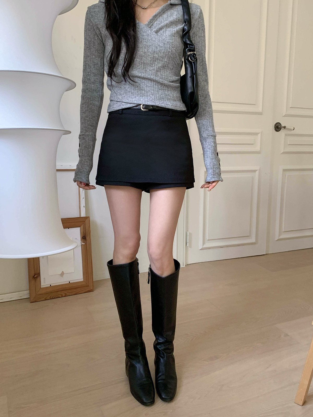 [ SK7608K5C-헤리으 H라인 벨트 세트 코튼 치마바지 미니 스커트 ]