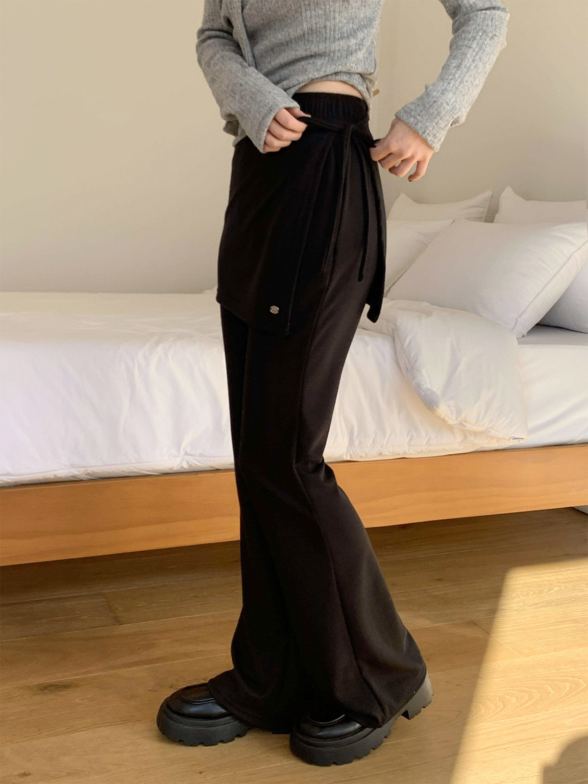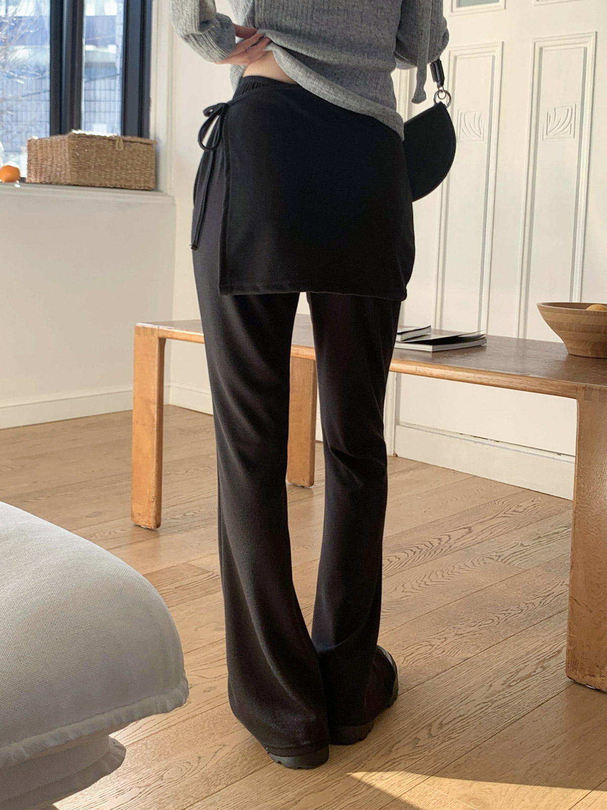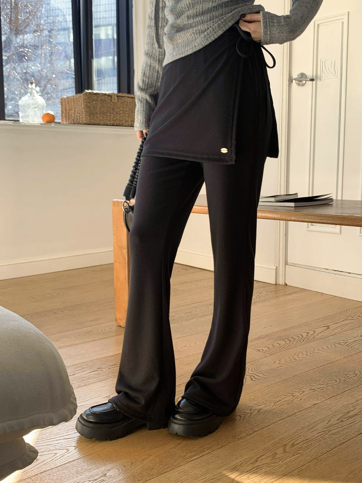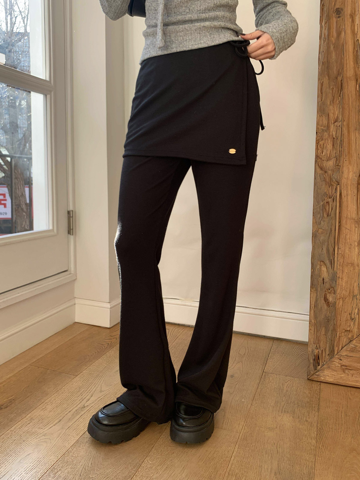부츠컷 슬랙스 위에 랩 스커트를 덧입은 듯한 독특한 디자인의 팬츠
