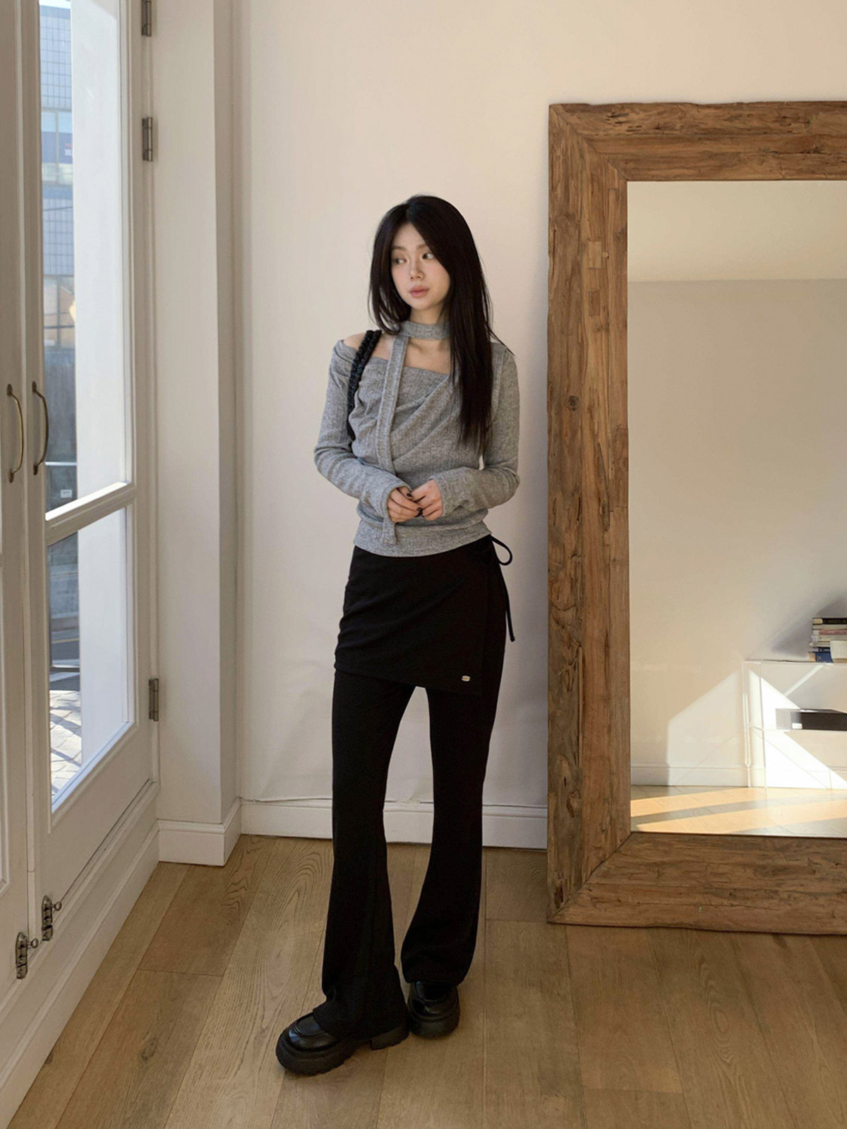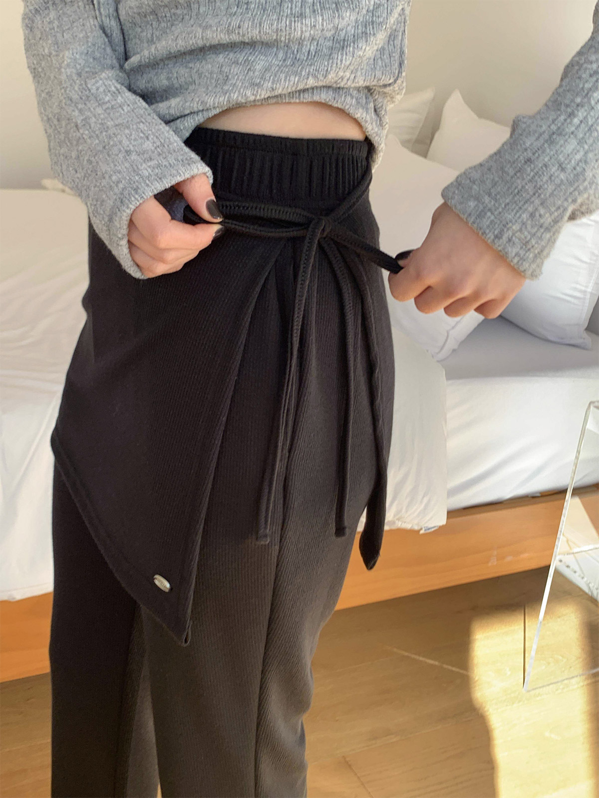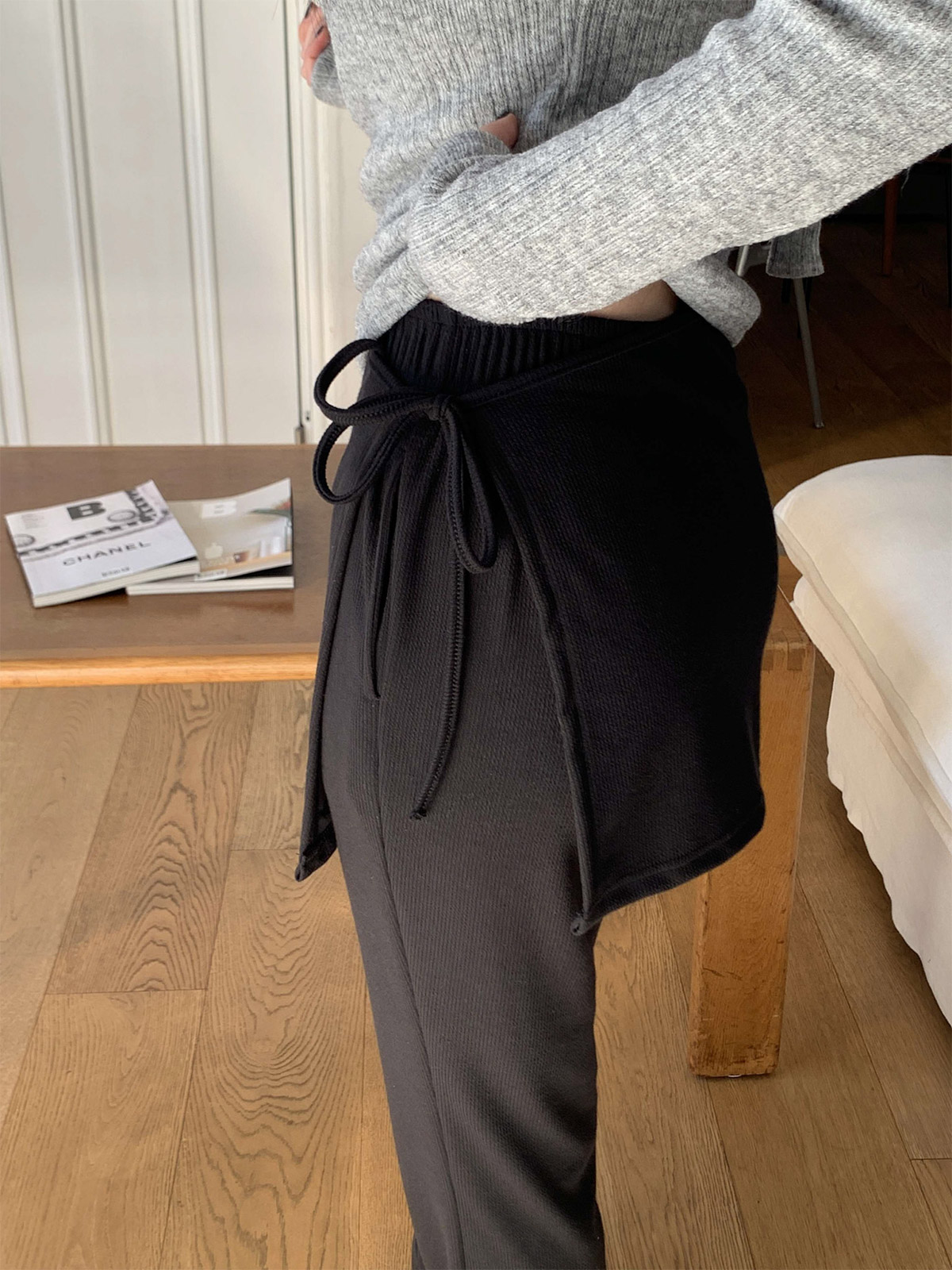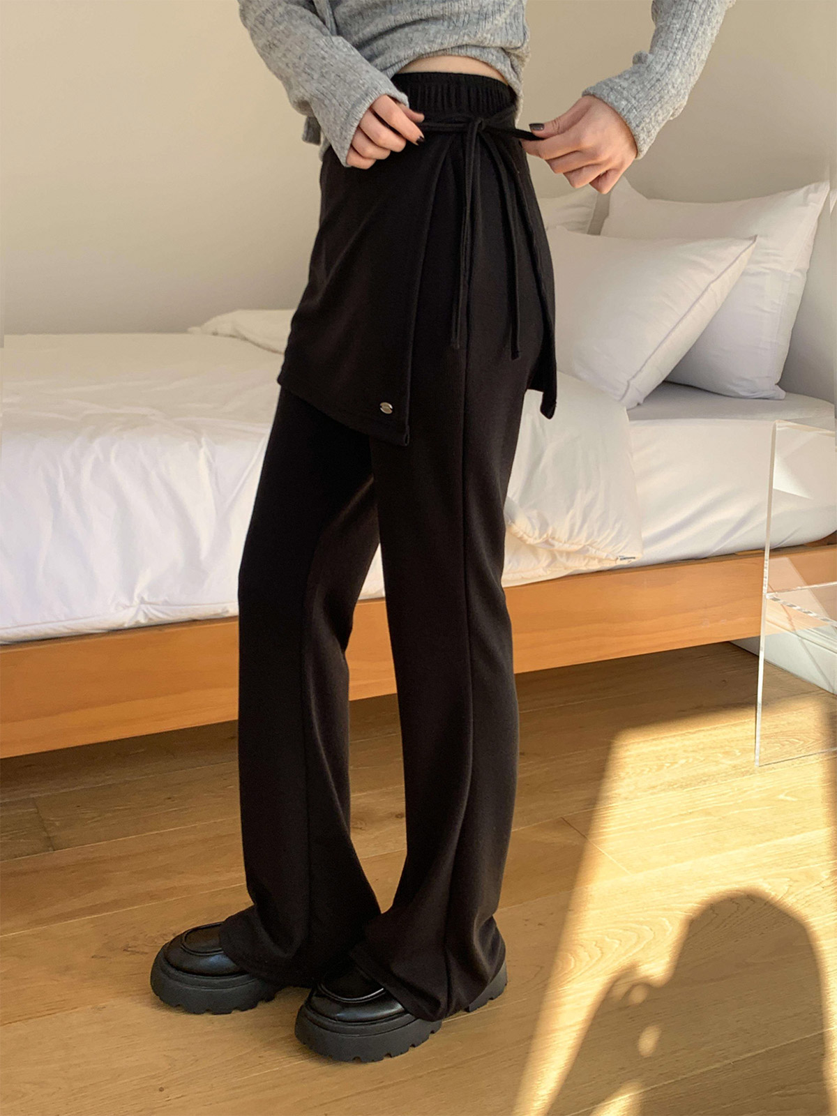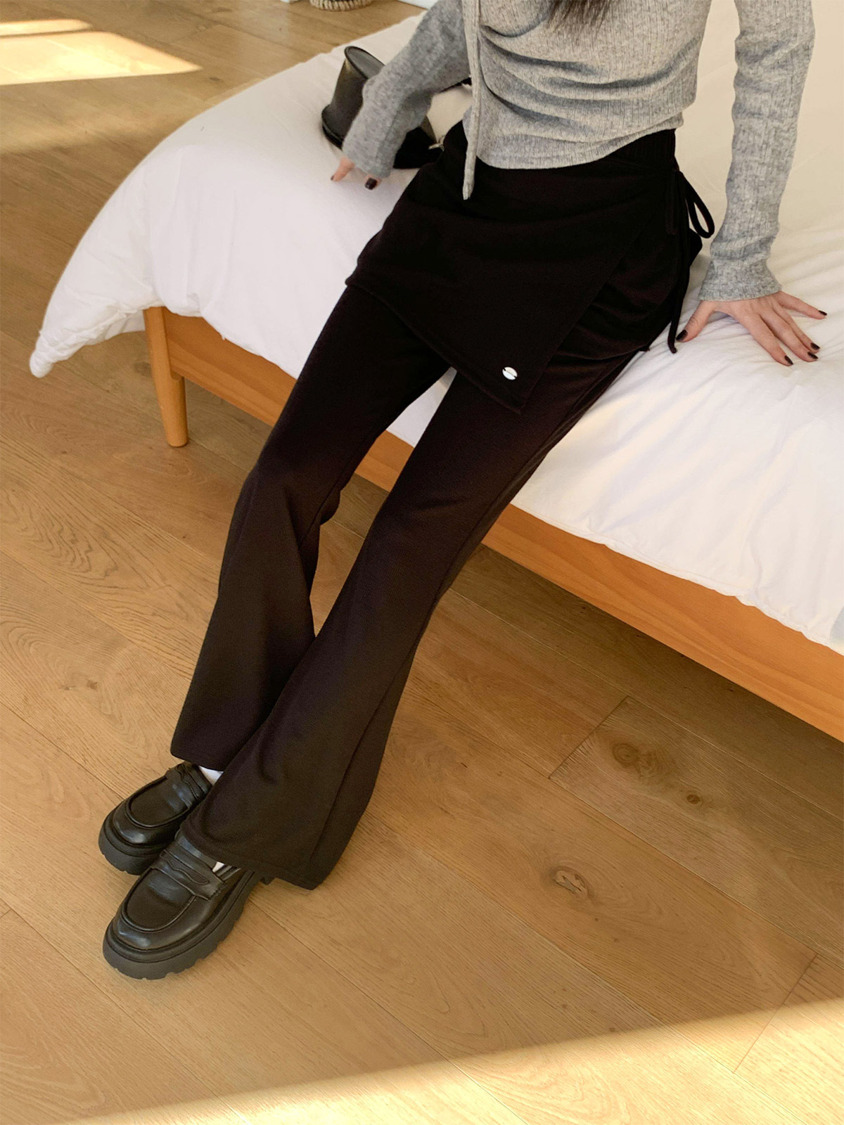 부츠컷 슬랙스 위에 랩 스커트를 덧입은 듯한 독특한 디자인의 팬츠