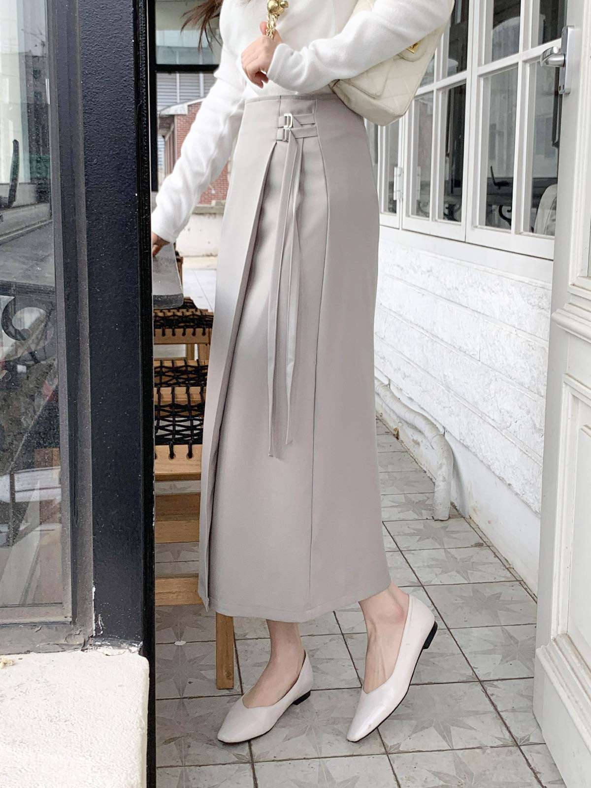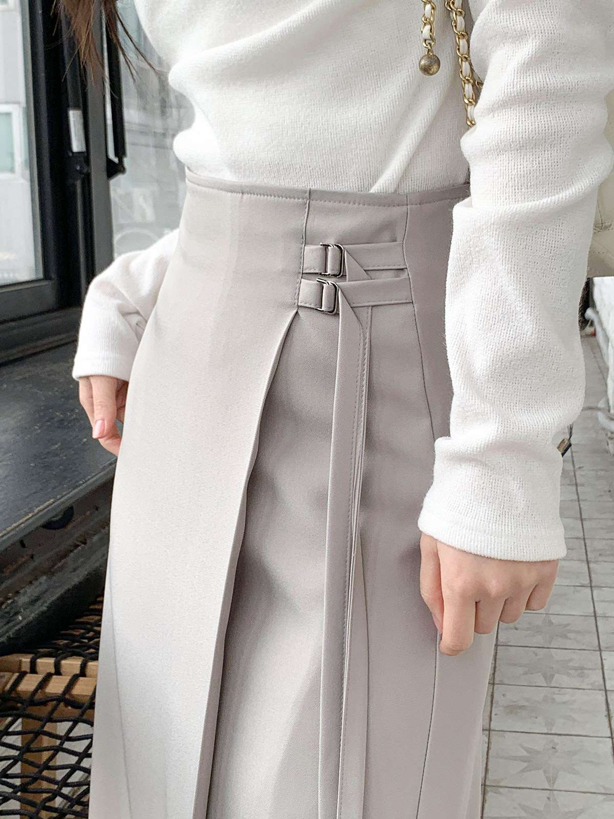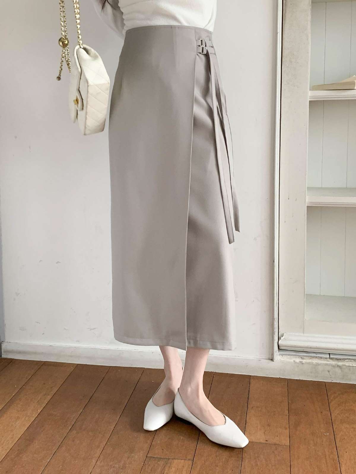 세련된 이중 버클 디테일이 감각적인 디자인의 H라인 롱 스커트