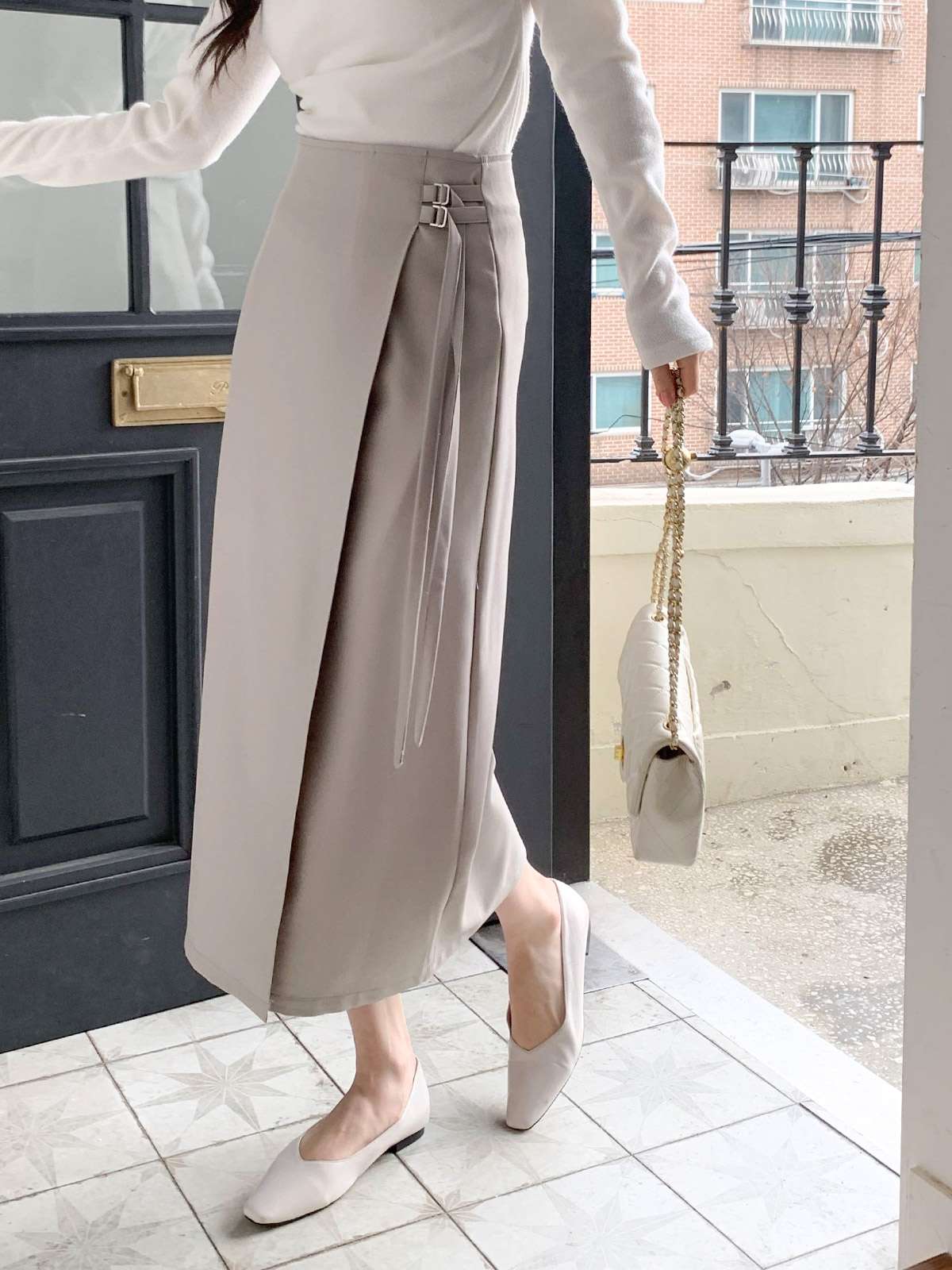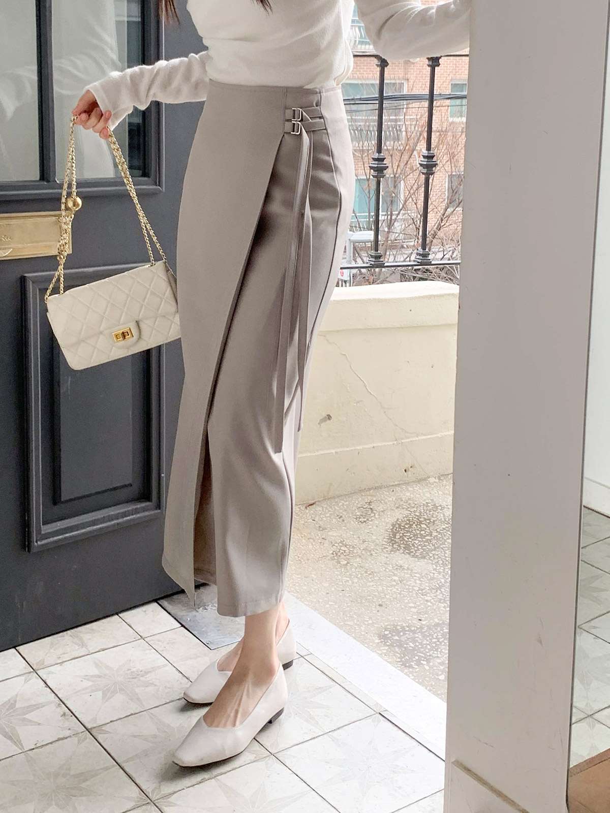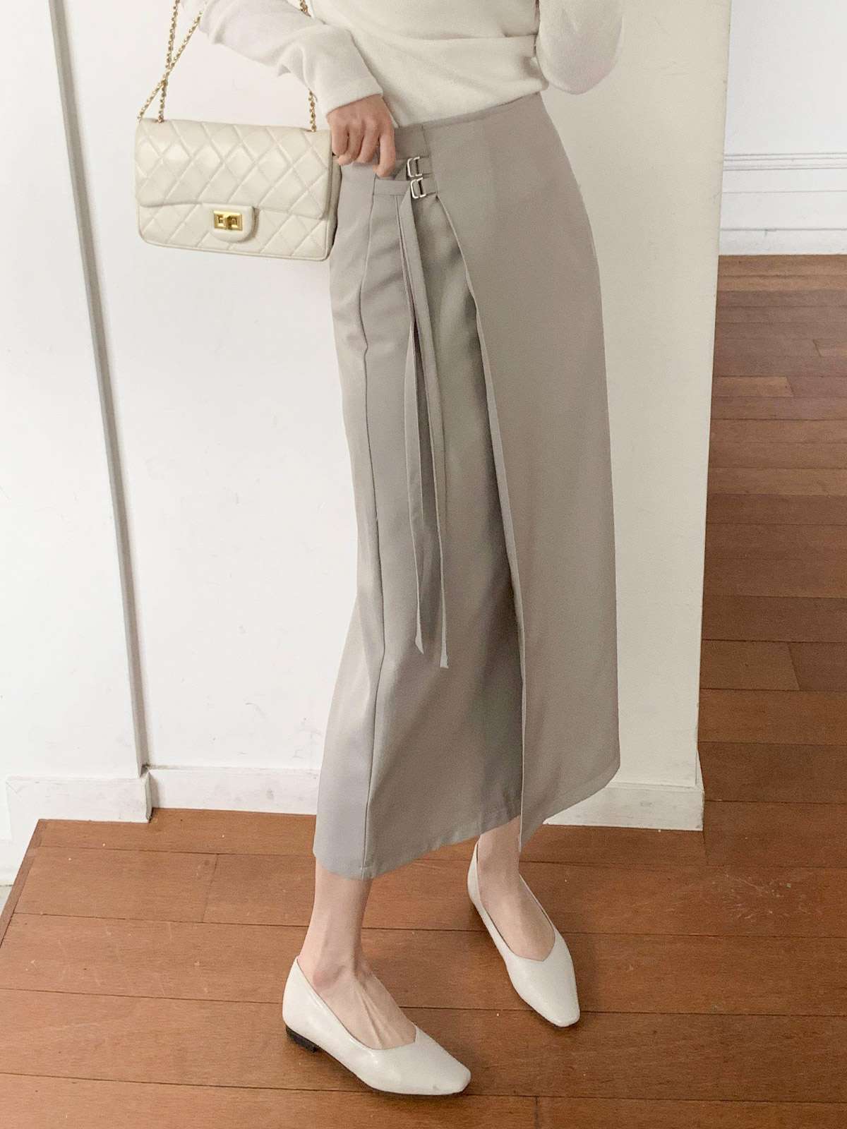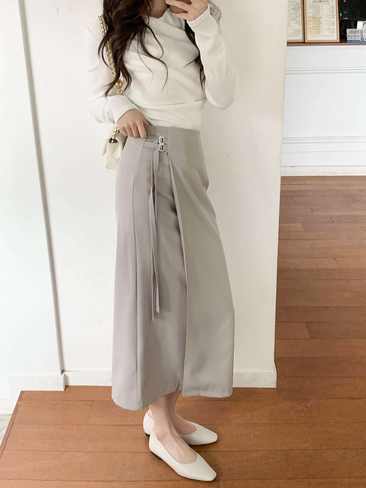 세련된 이중 버클 디테일이 감각적인 디자인의 H라인 롱 스커트