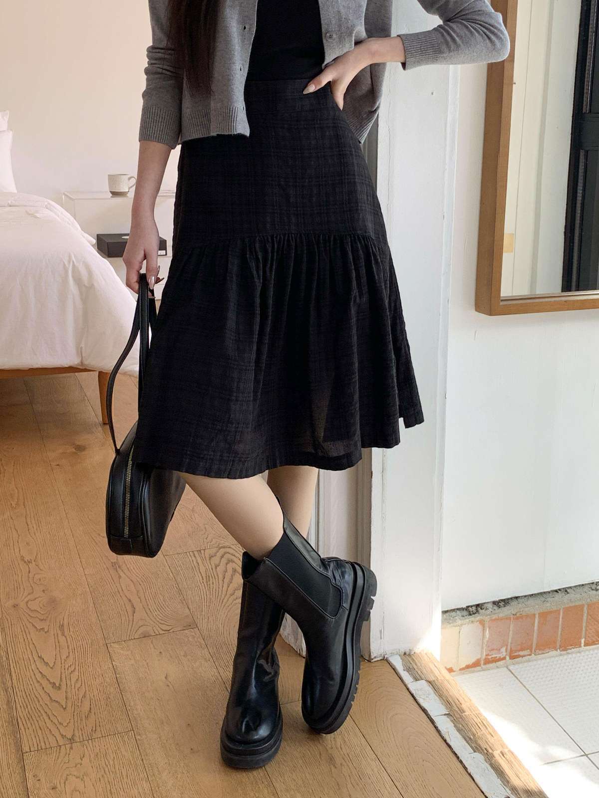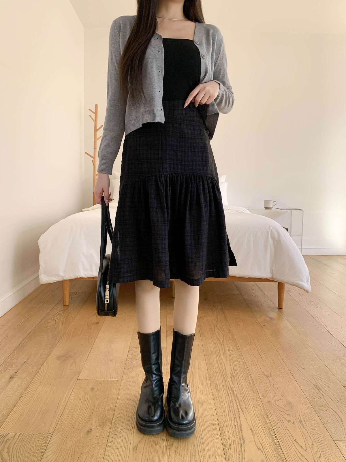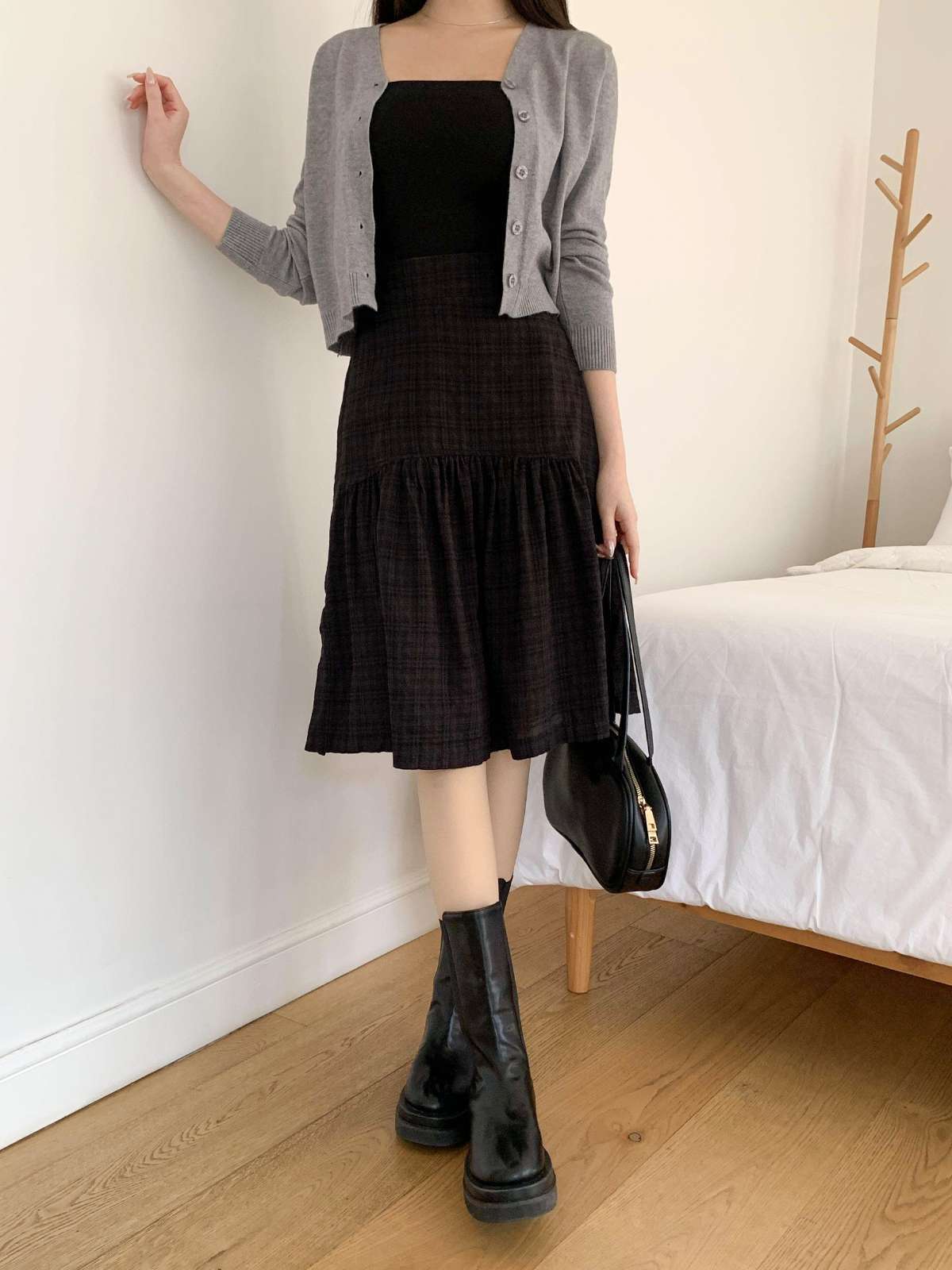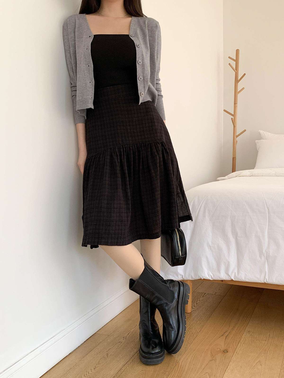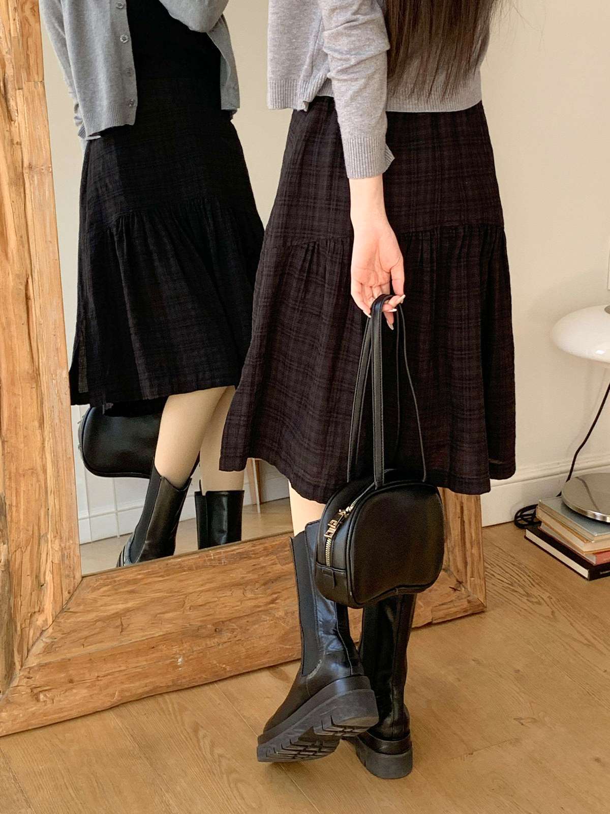 체크 패턴에 아래로 갈수록 우아하게 퍼지는 플레어 라인의 미디 스커트
