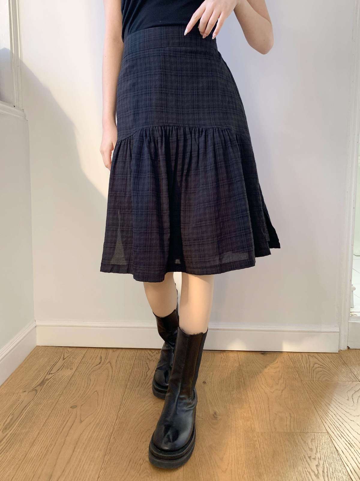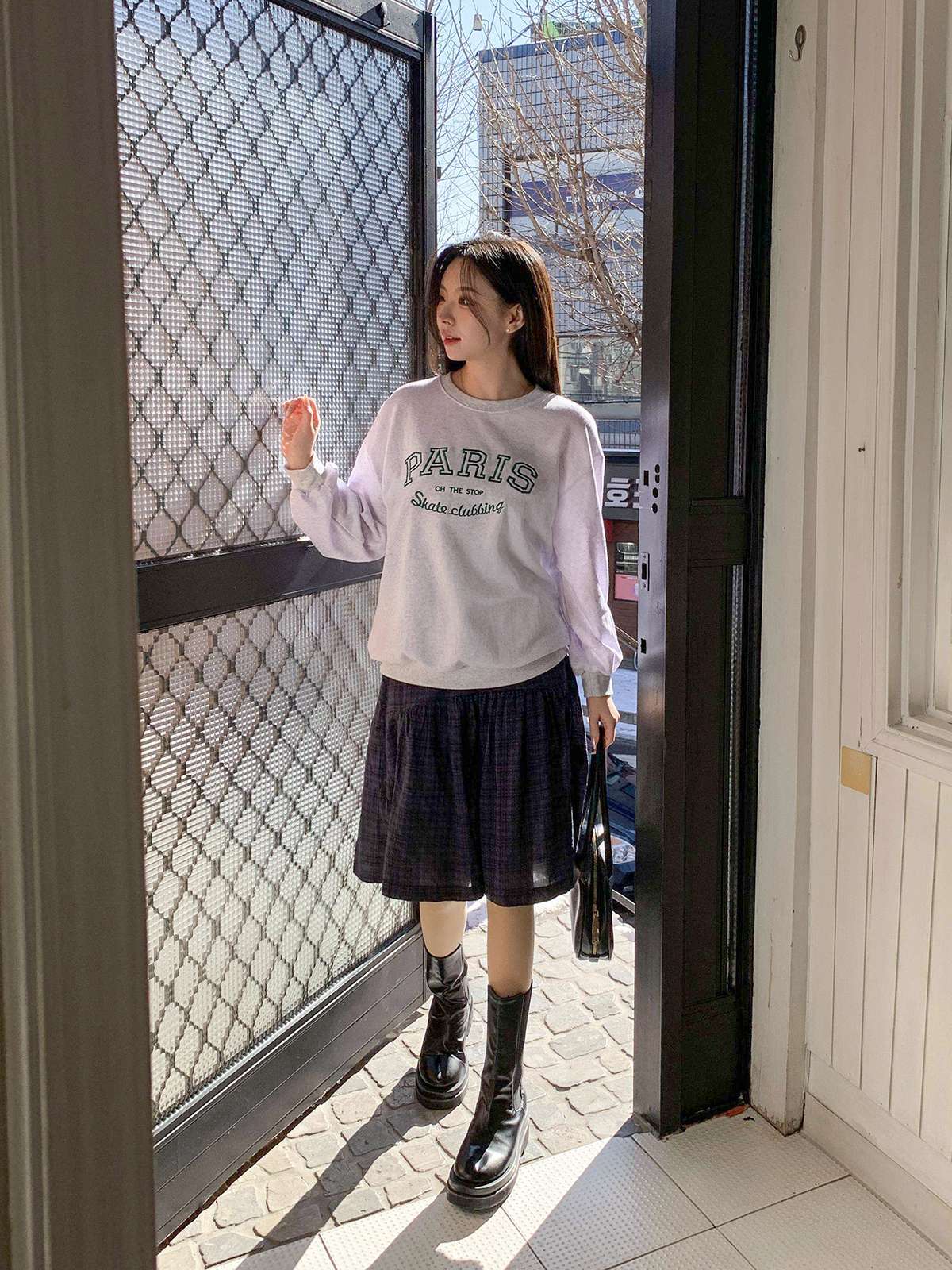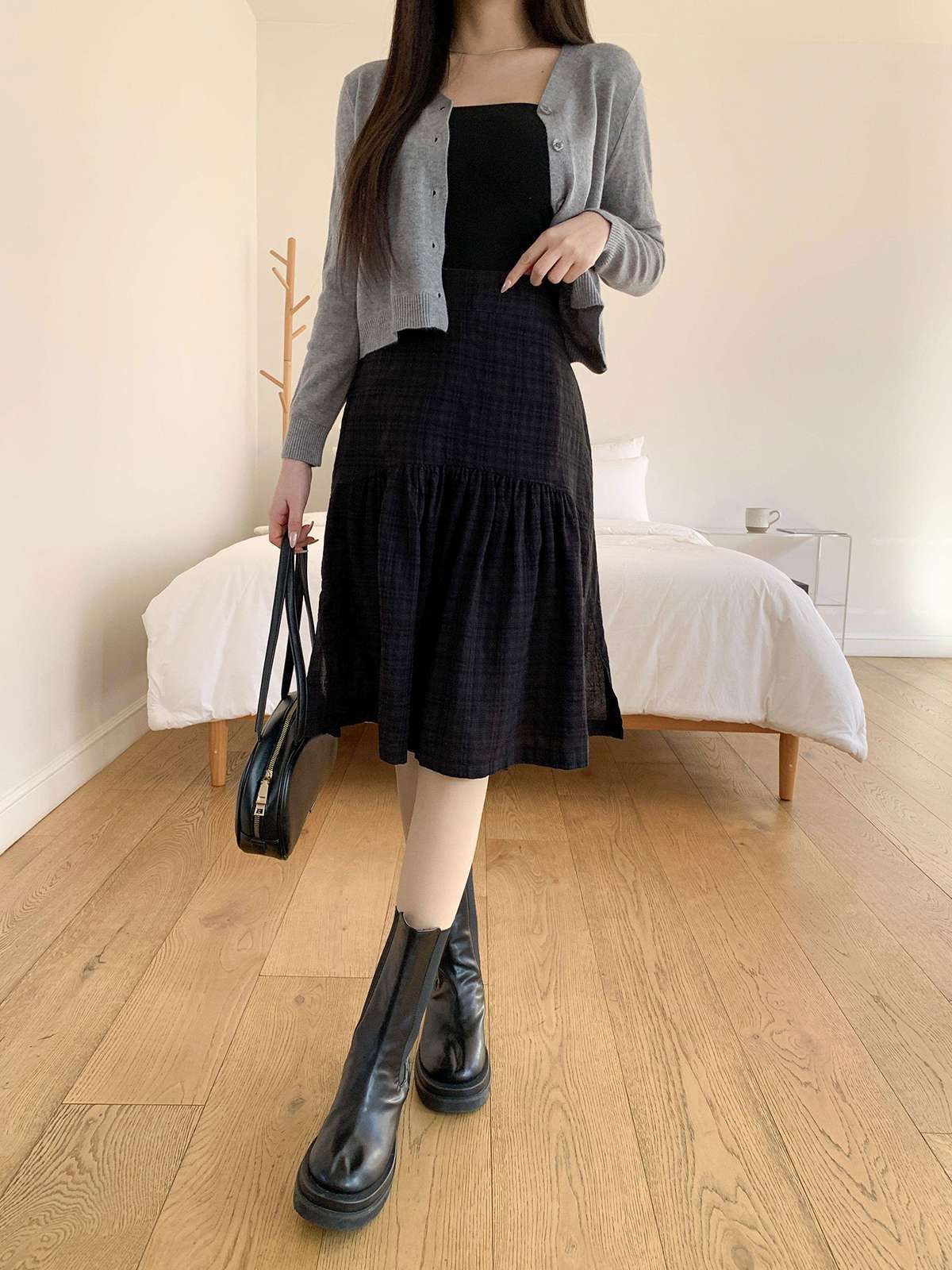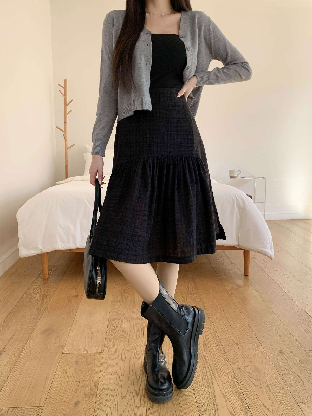 체크 패턴에 아래로 갈수록 우아하게 퍼지는 플레어 라인의 미디 스커트