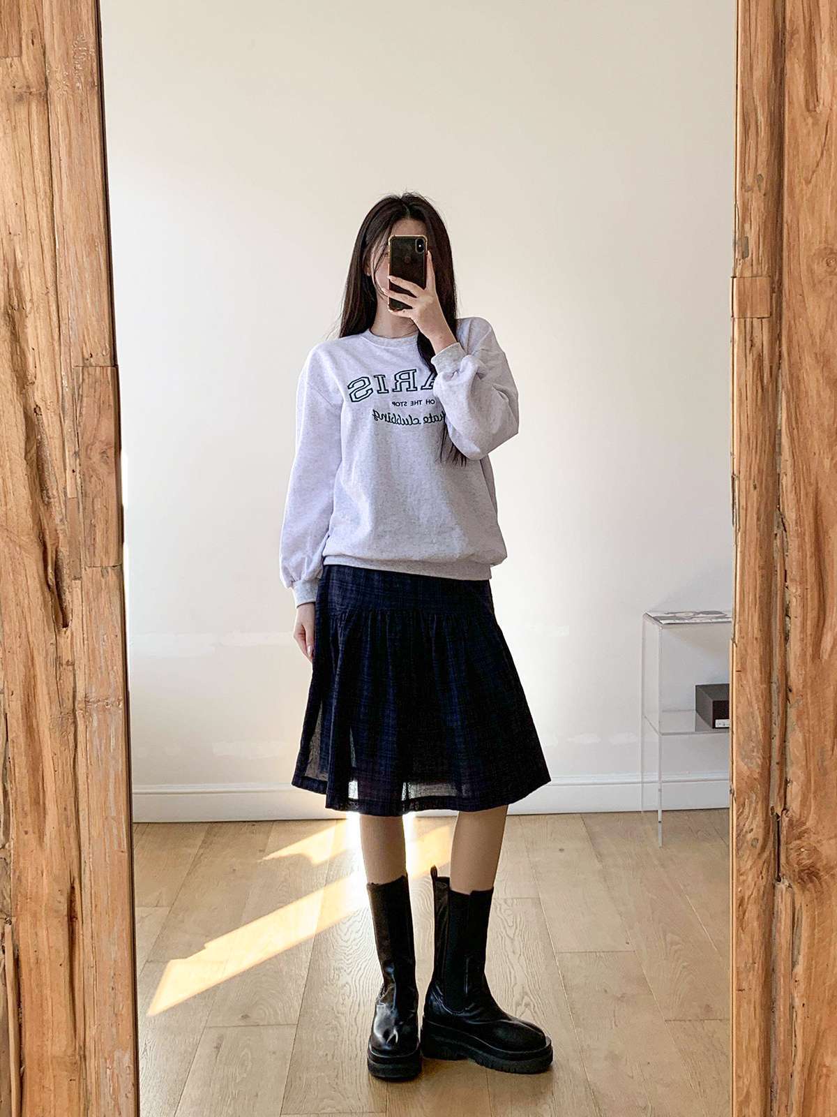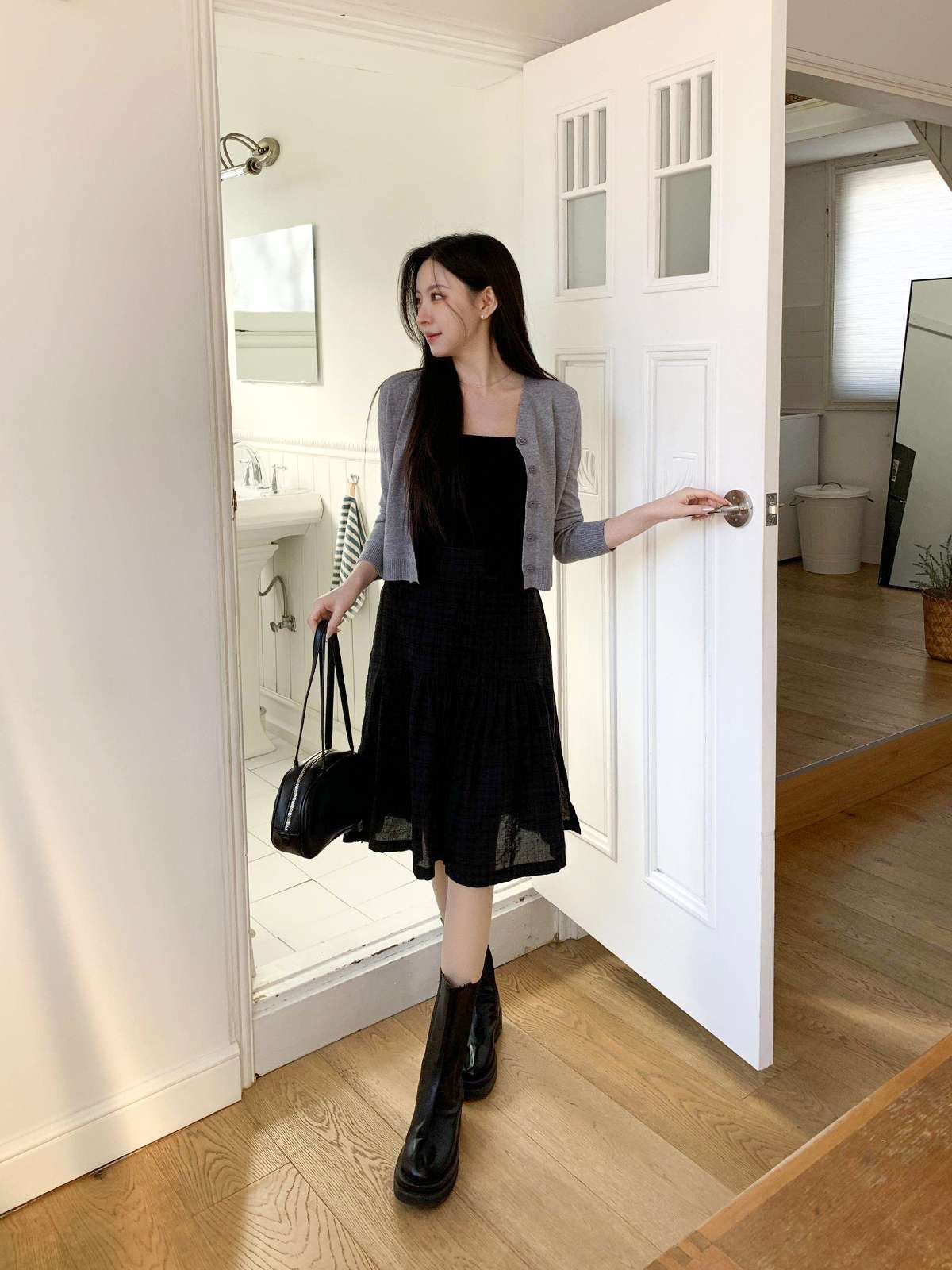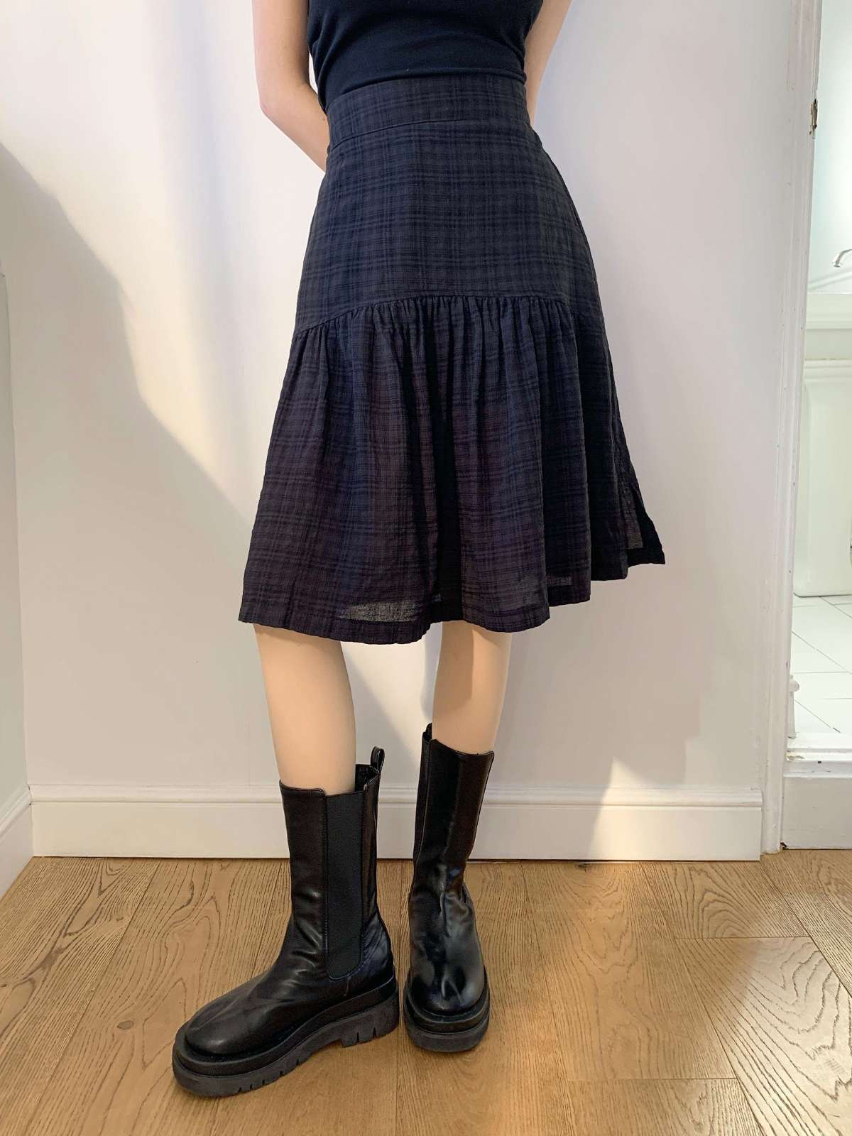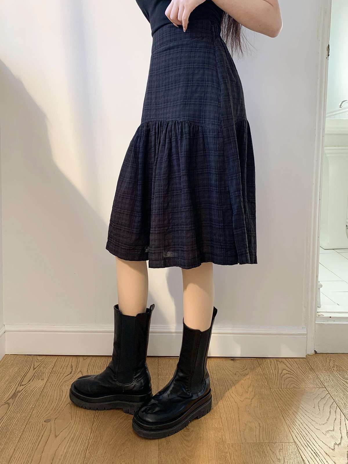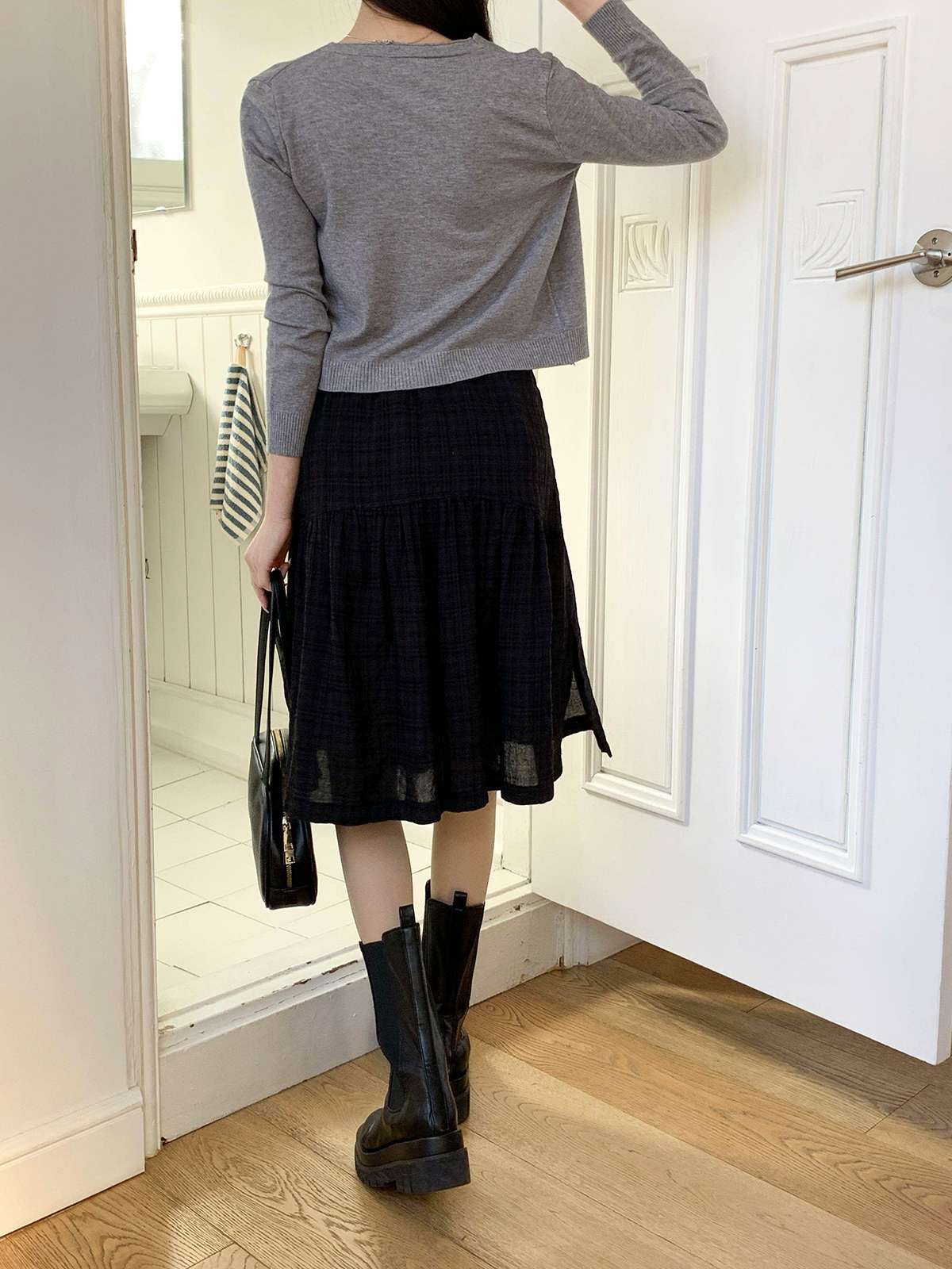 체크 패턴에 아래로 갈수록 우아하게 퍼지는 플레어 라인의 미디 스커트