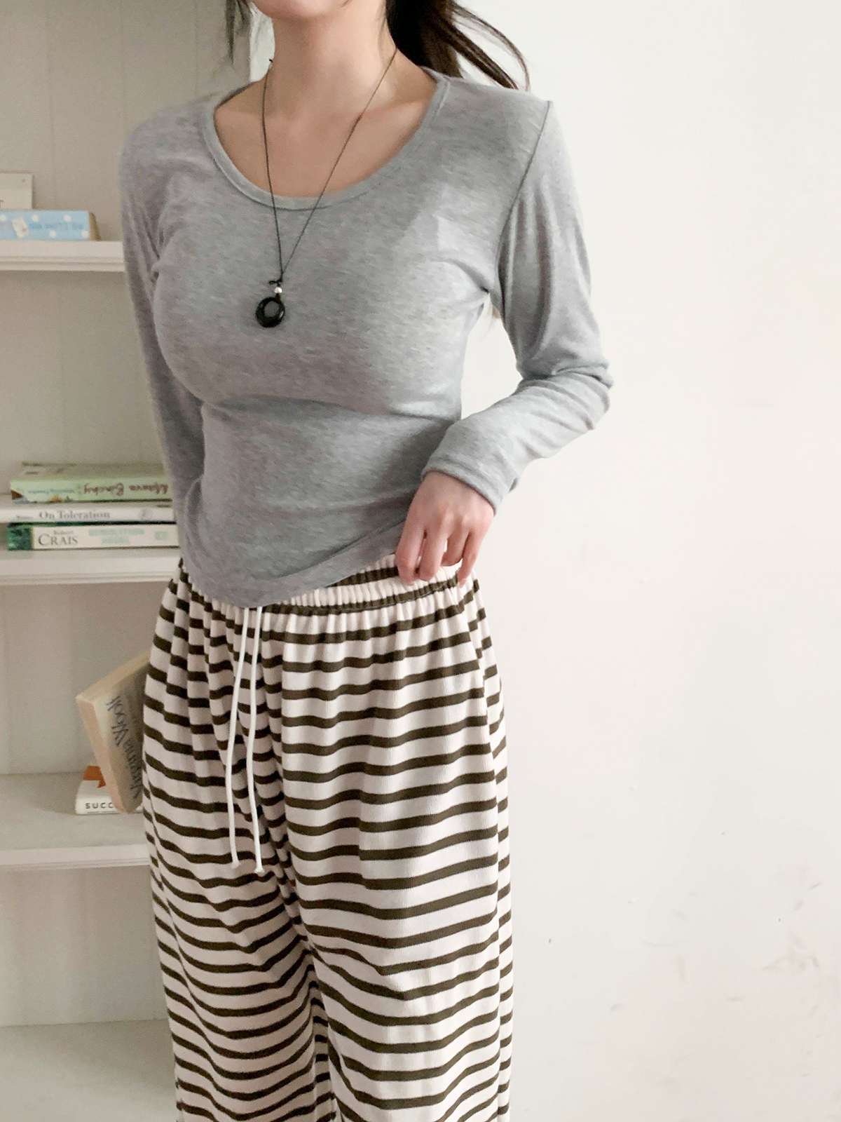 [ T17442K61-쇼하스 잘록 슬림핏 U넥 긴팔 티셔츠 ]