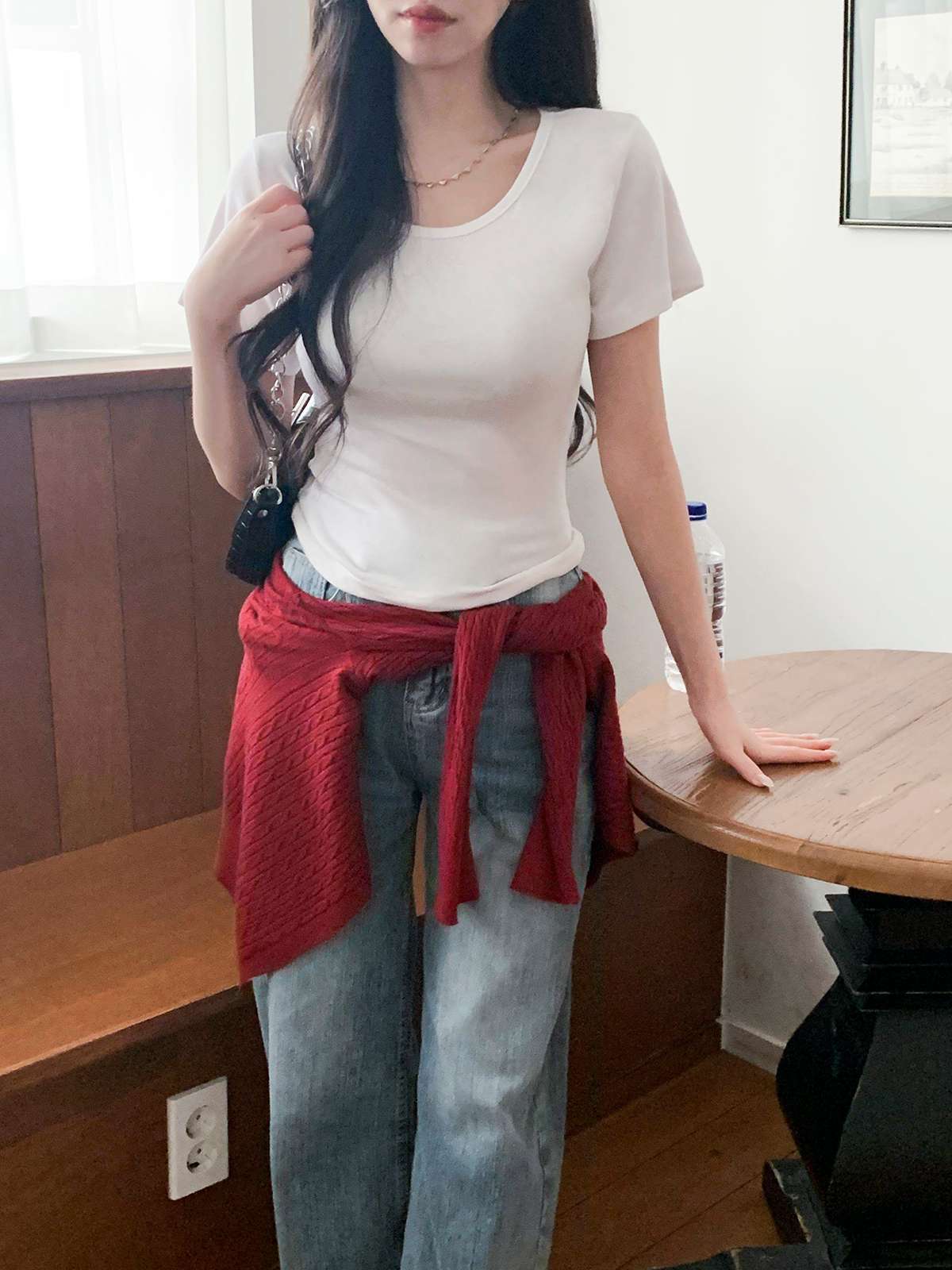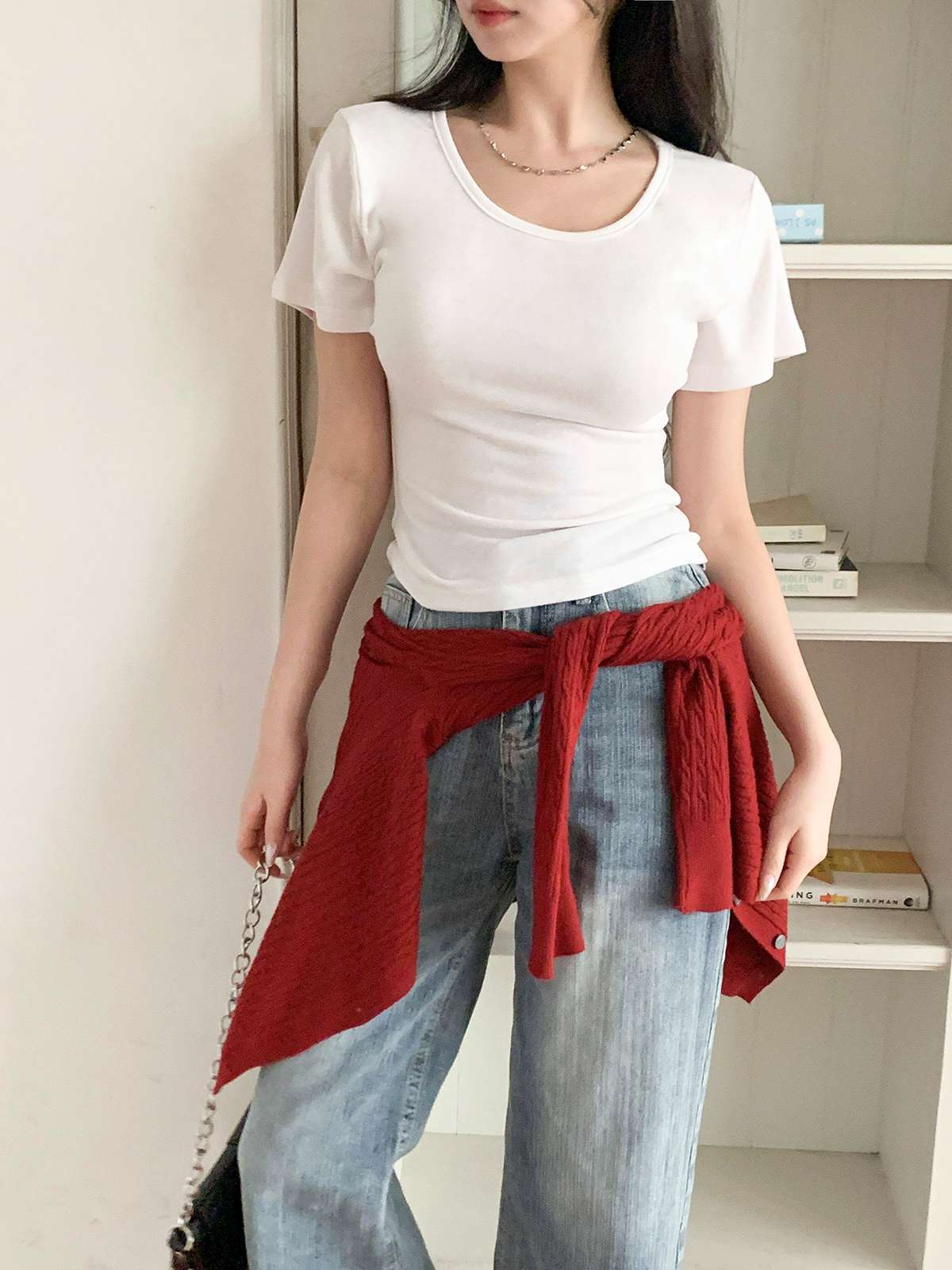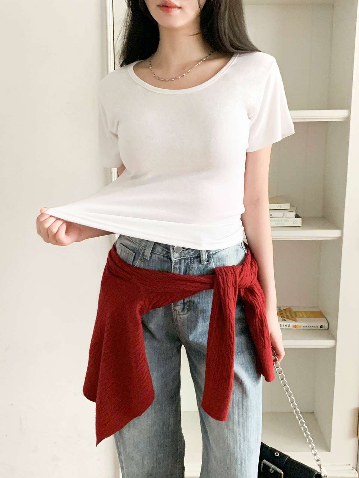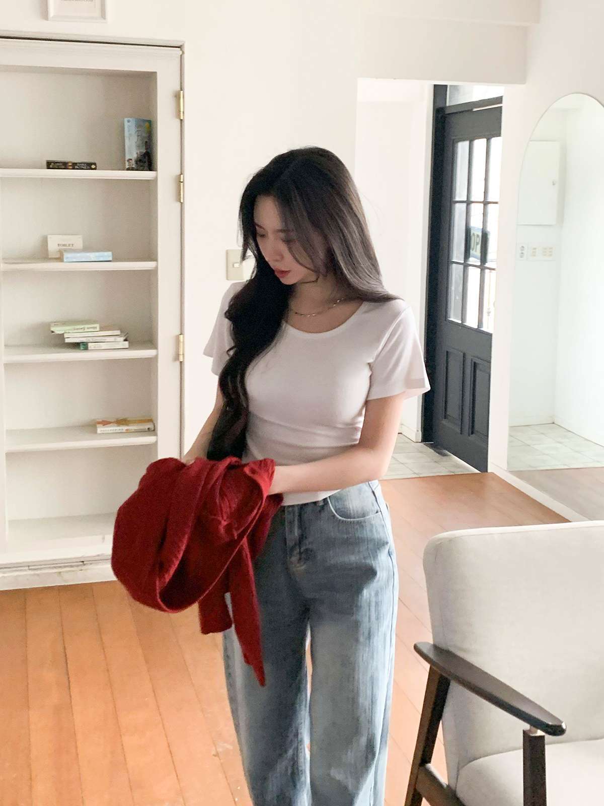 여리여리한 무드의 U넥 반팔 티셔츠