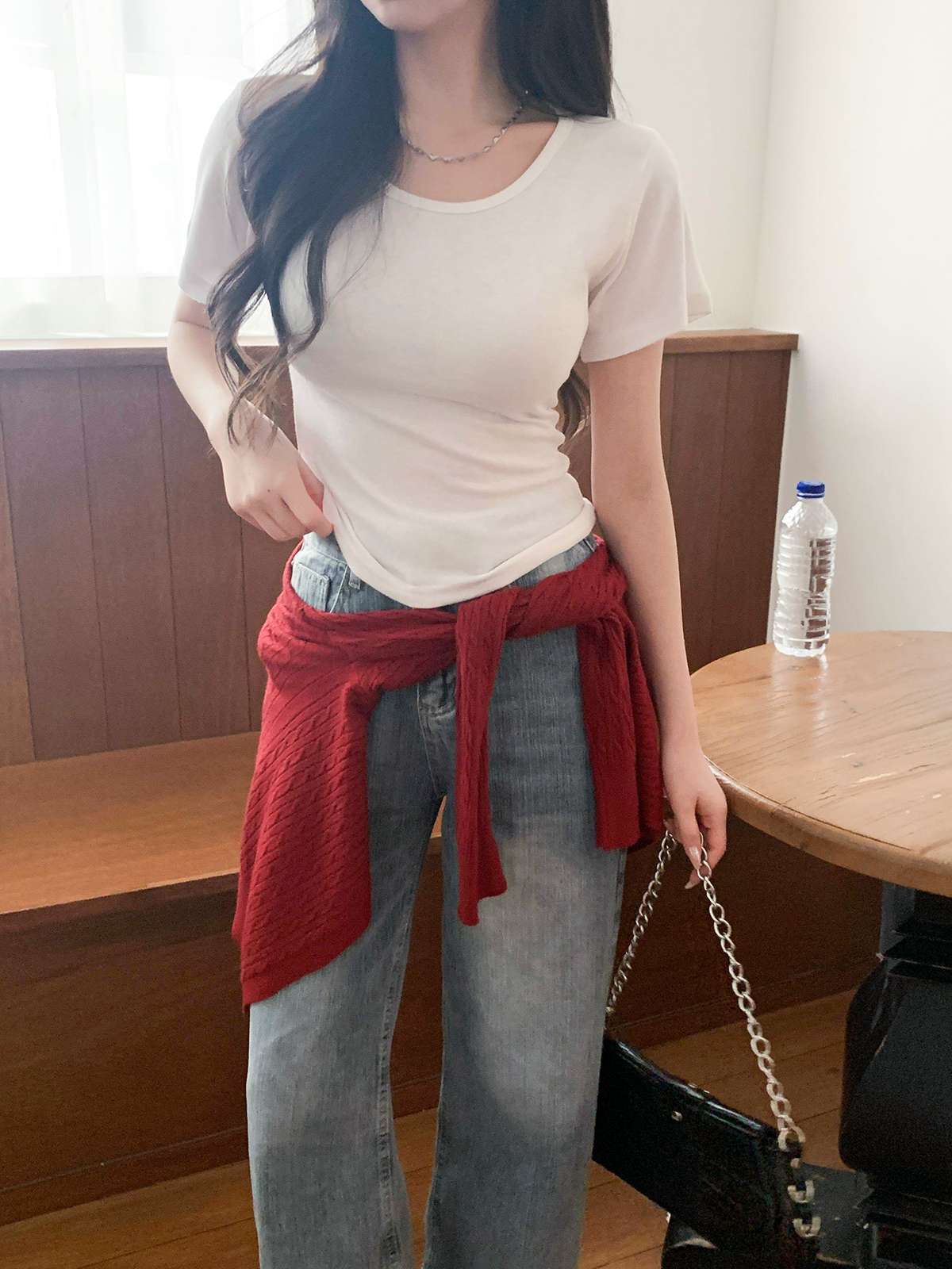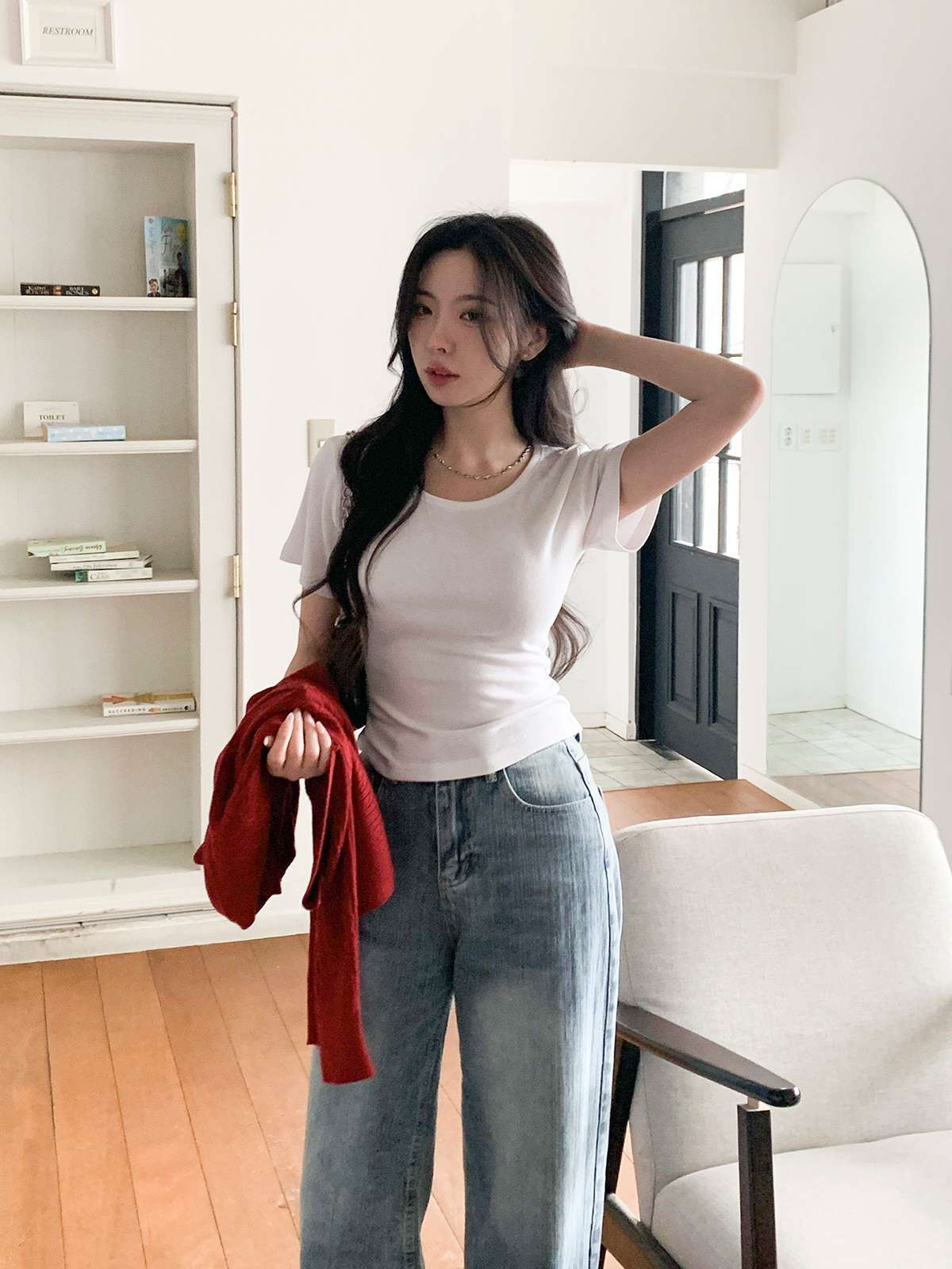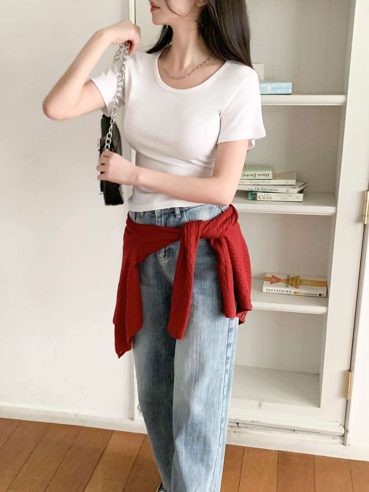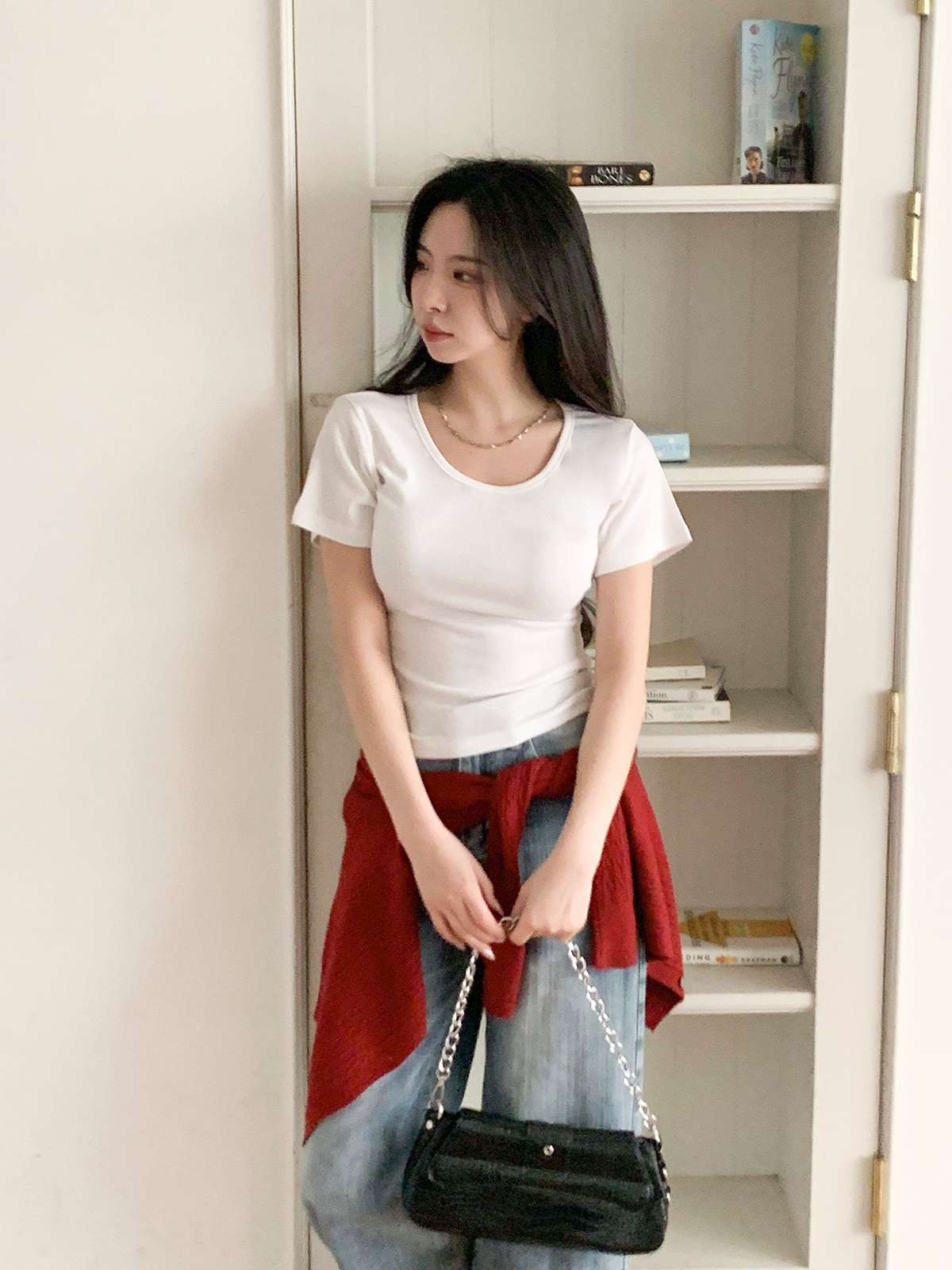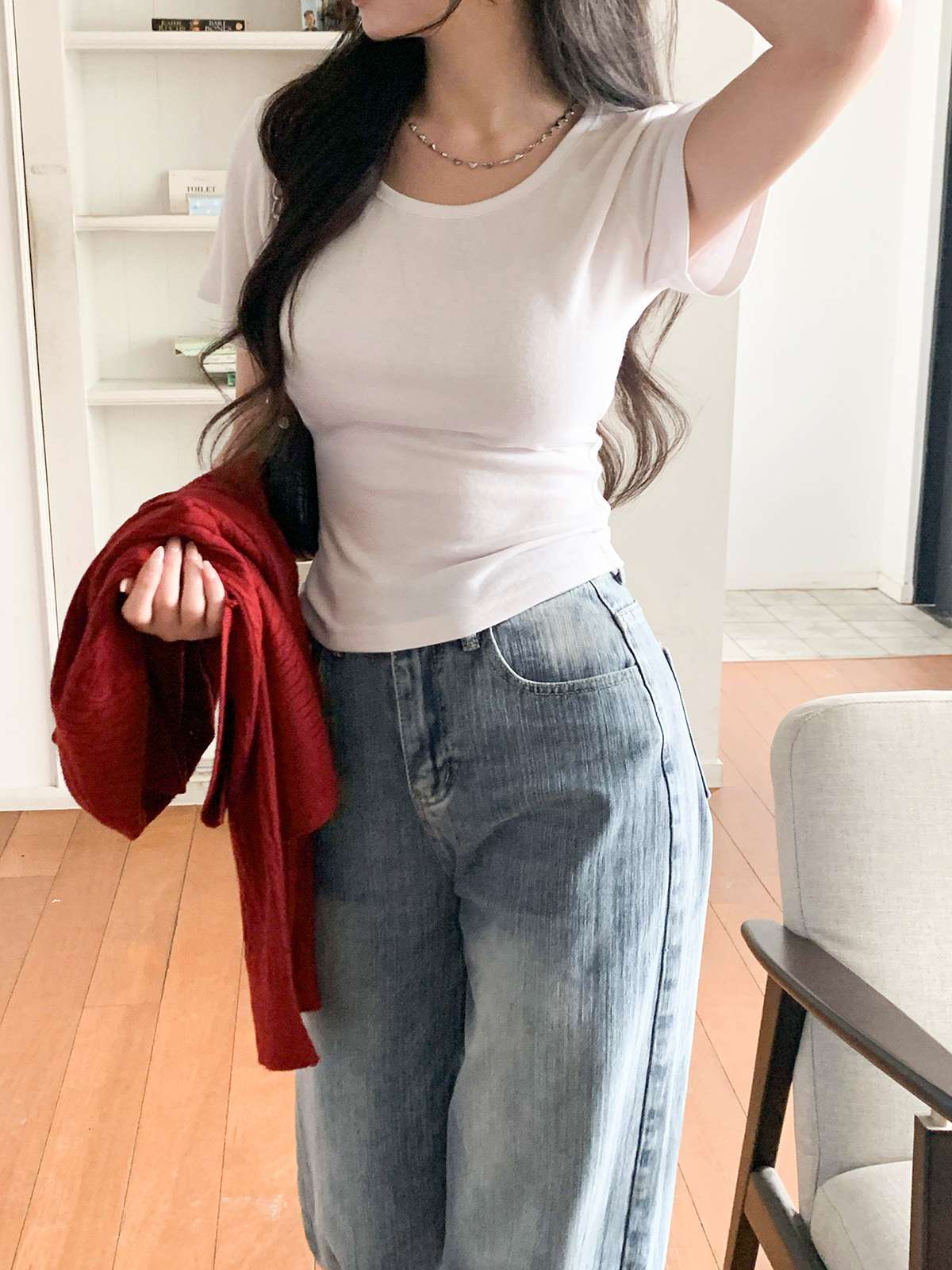 여리여리한 무드의 U넥 반팔 티셔츠